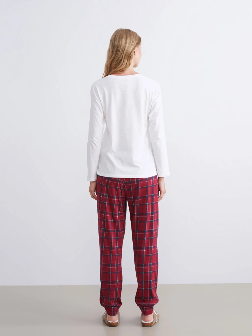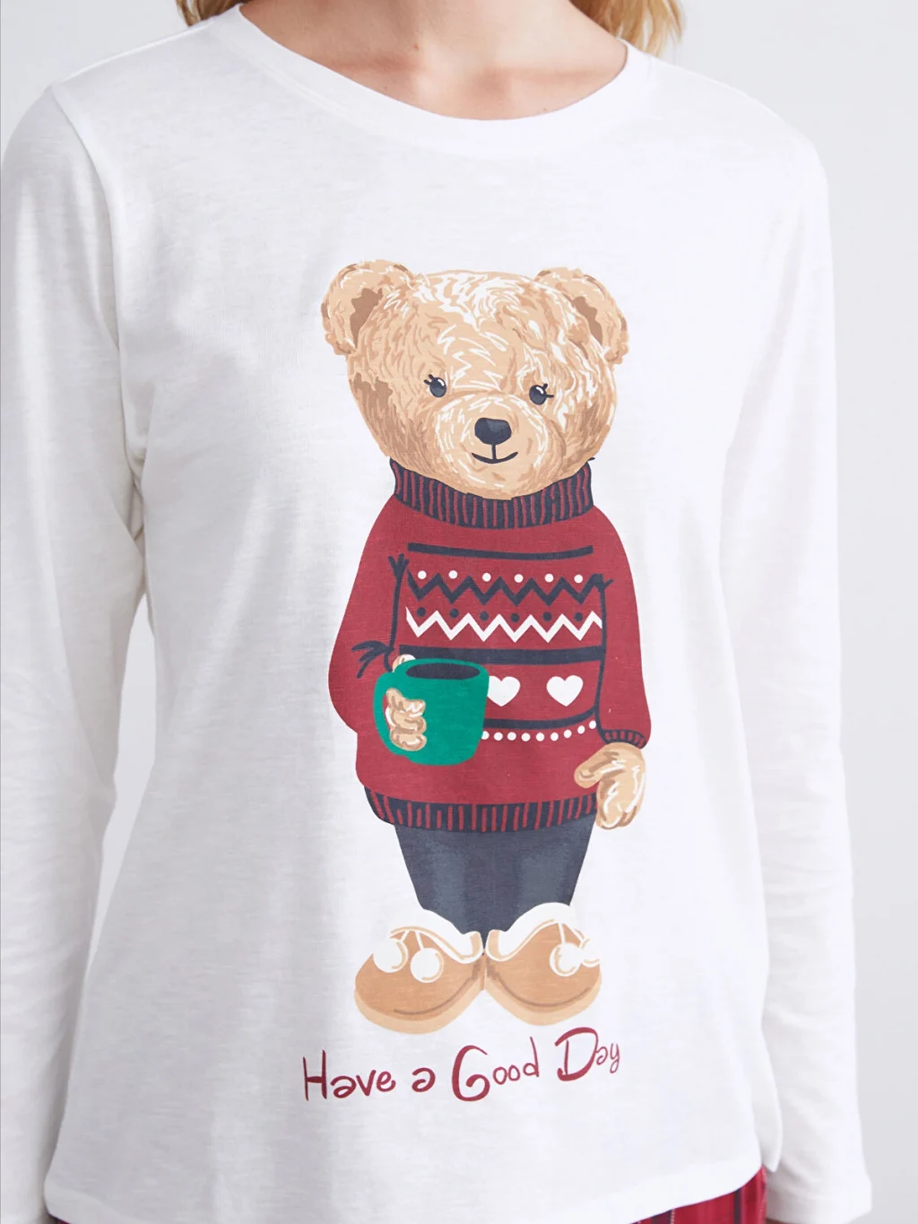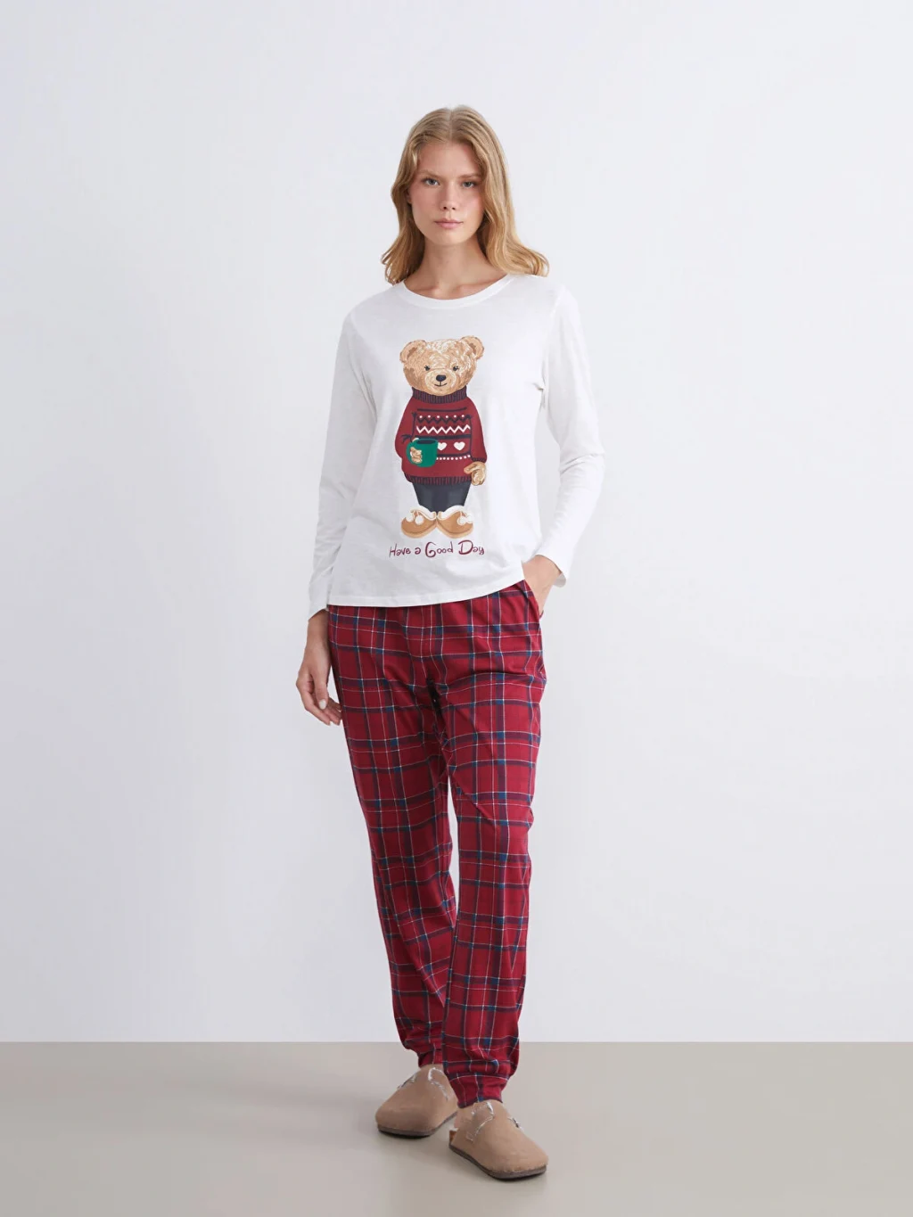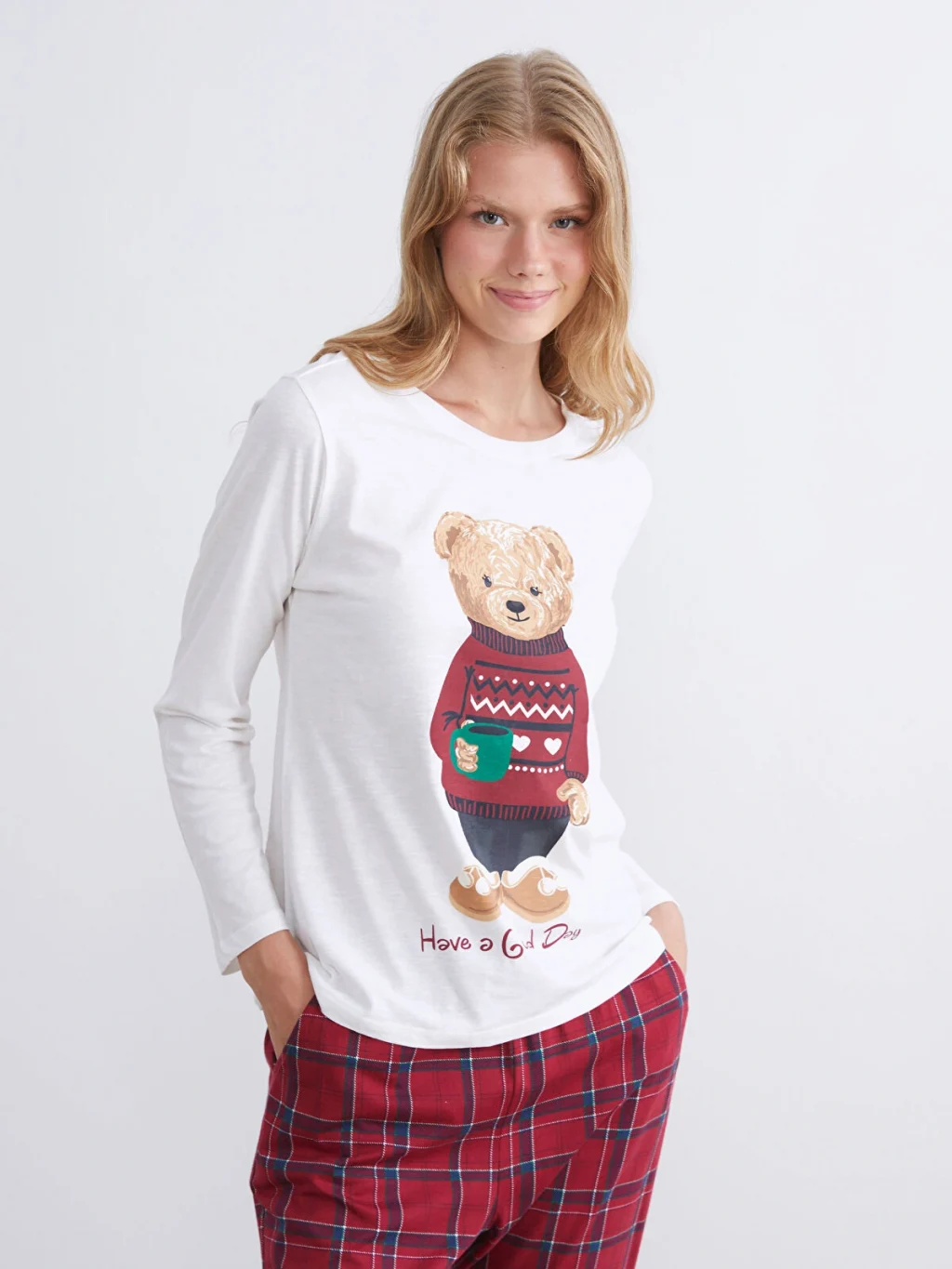 Penye kumaştan üretilen kadın pijama takımı, bisiklet yaka ve uzun kollu baskılı üst ile ekose desenli alttan oluşmaktadır.