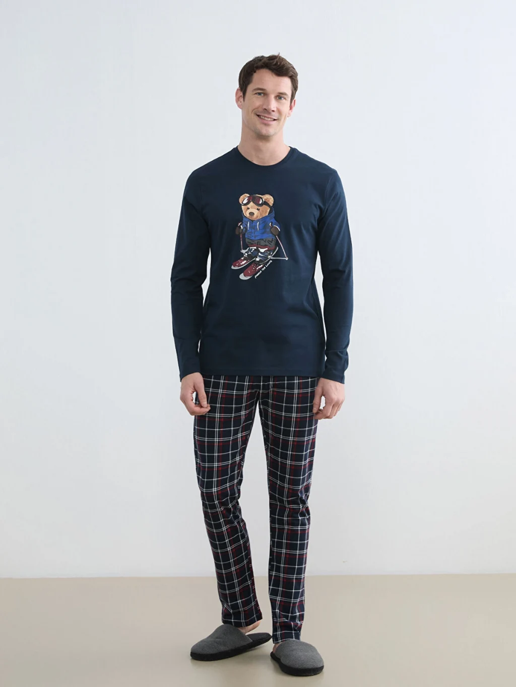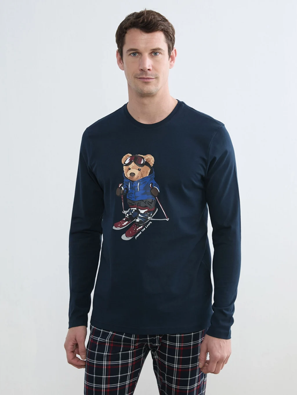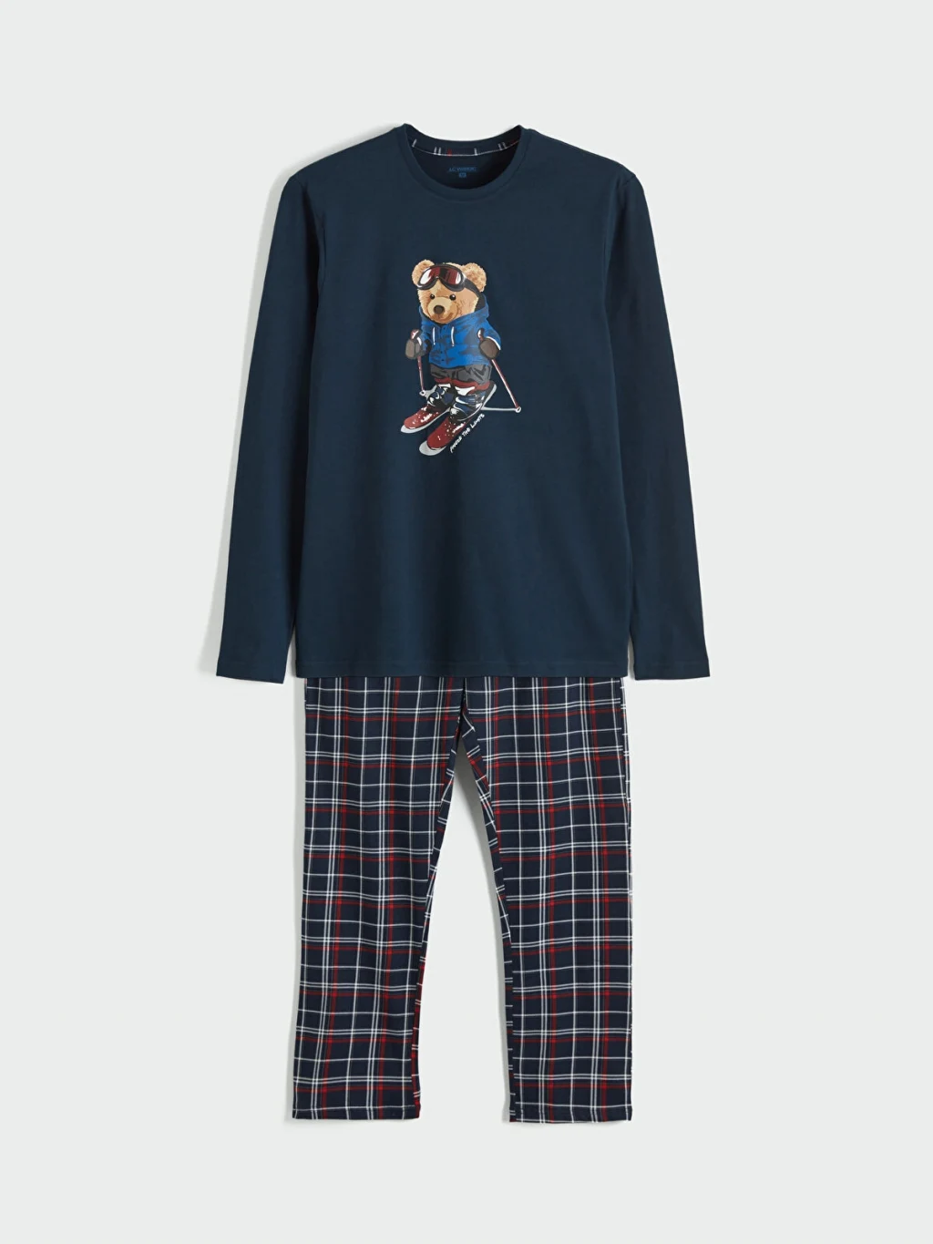 Erkek pijama takımı, bisiklet yaka ve uzun kollu baskılı üst ile kareli desenli alttan oluşmaktadır. Pamuklu penye kumaştan üretilmiştir.