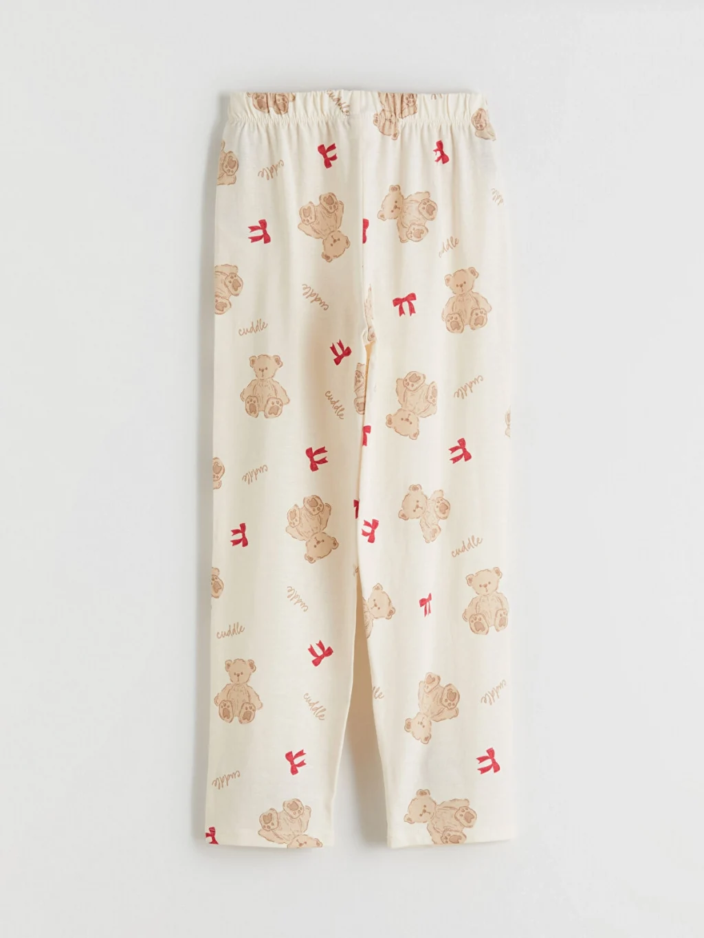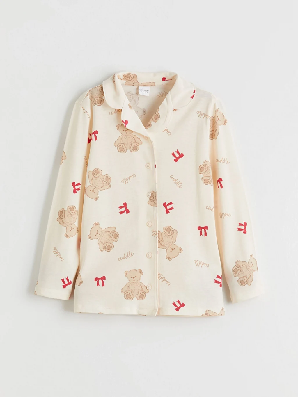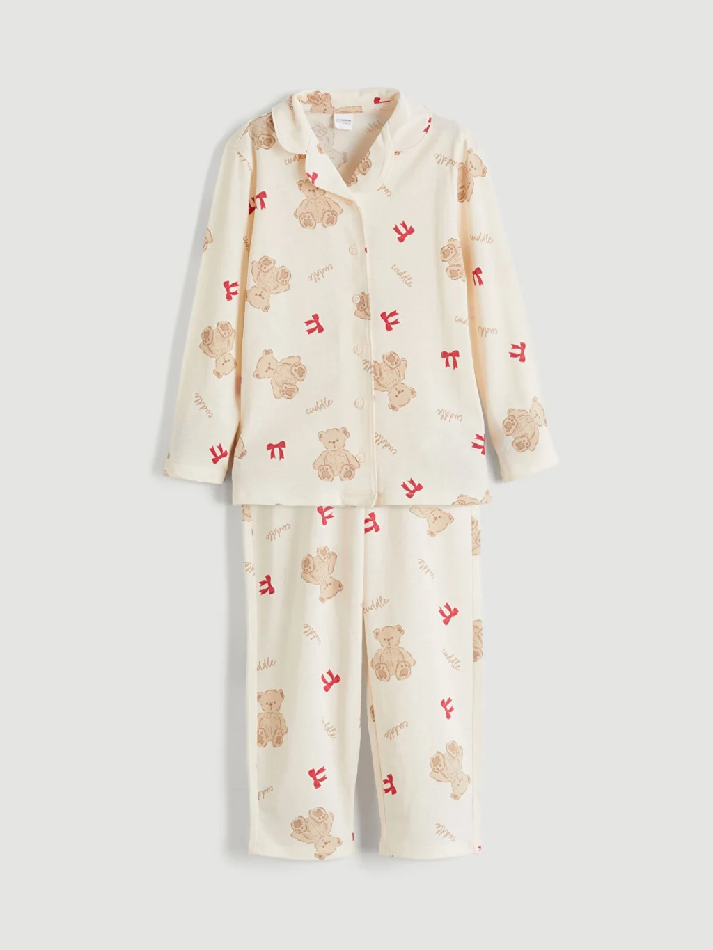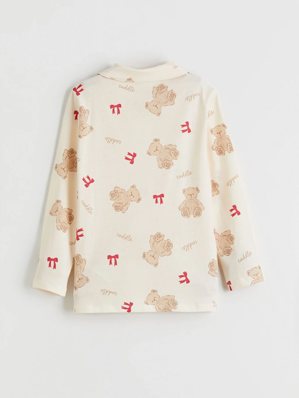 Ayıcık ve fiyonk desenli kız çocuk pijama takımı, %100 pamuklu penye kumaştan üretilmiştir. Gömlek yakalı, uzun kollu üstü önden düğme kapamalıdır.