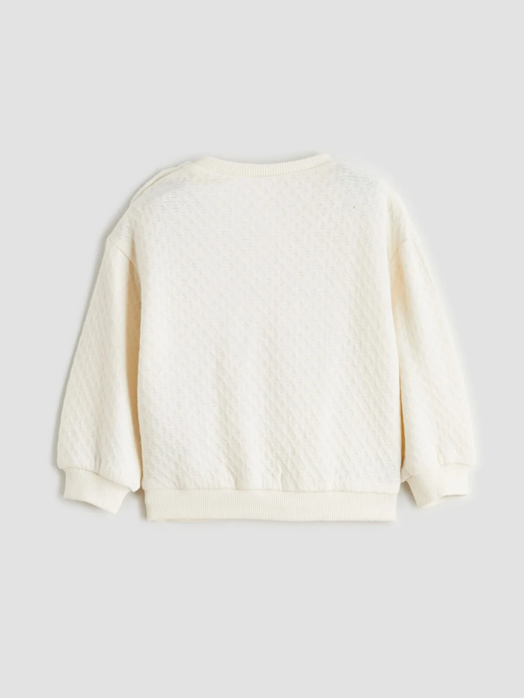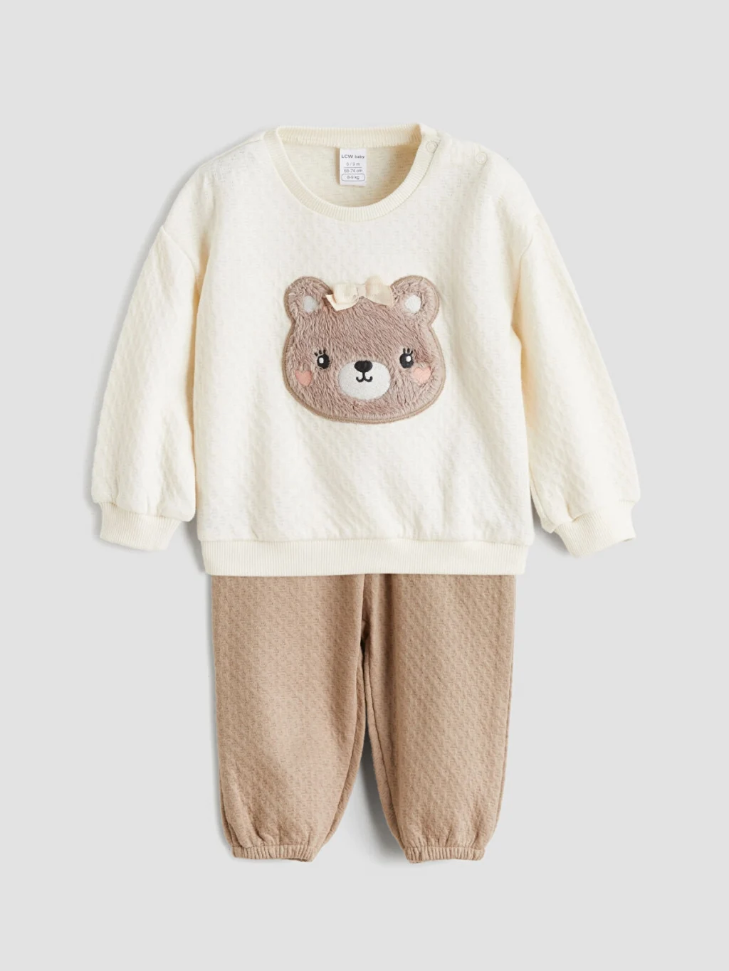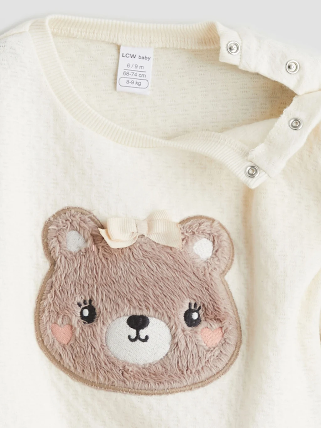Kız bebek takımı, bisiklet yaka, uzun kollu, omuzdan çıtçıt kapamalı ve aplike detaylı sweatshirt ile beli ve paçaları lastikli eşofman alttan oluşur.