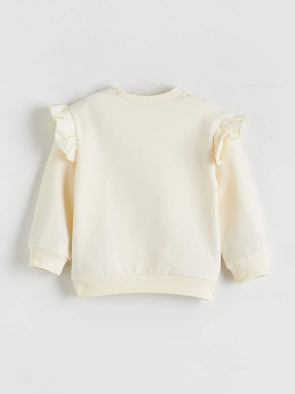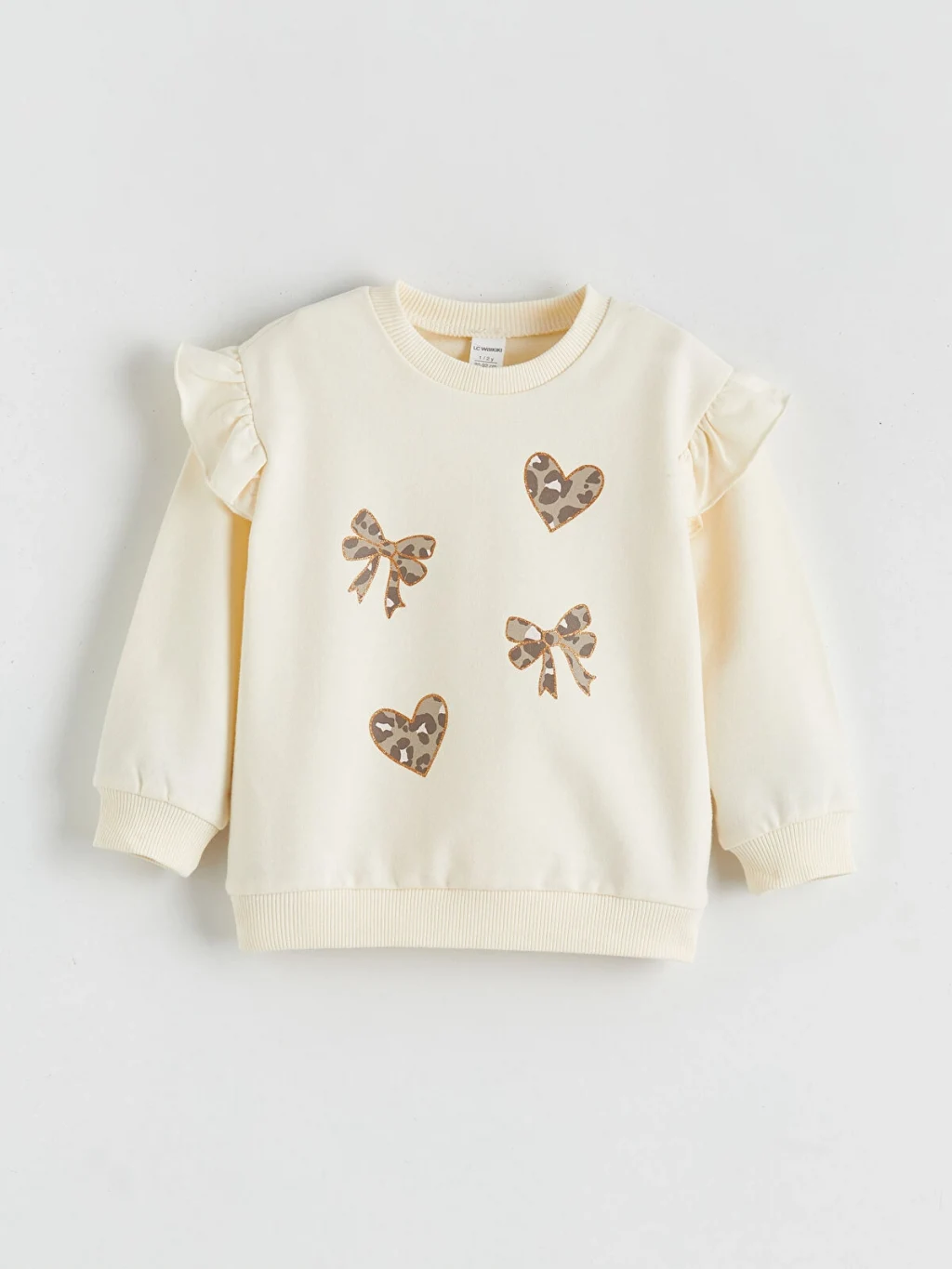Yüksek pamuk içeren, bisiklet yaka kız bebek sweatshirt. Uzun kollu ve omuzları fırfırlıdır. Ön yüzü kalp ve fiyonk desenlidir.