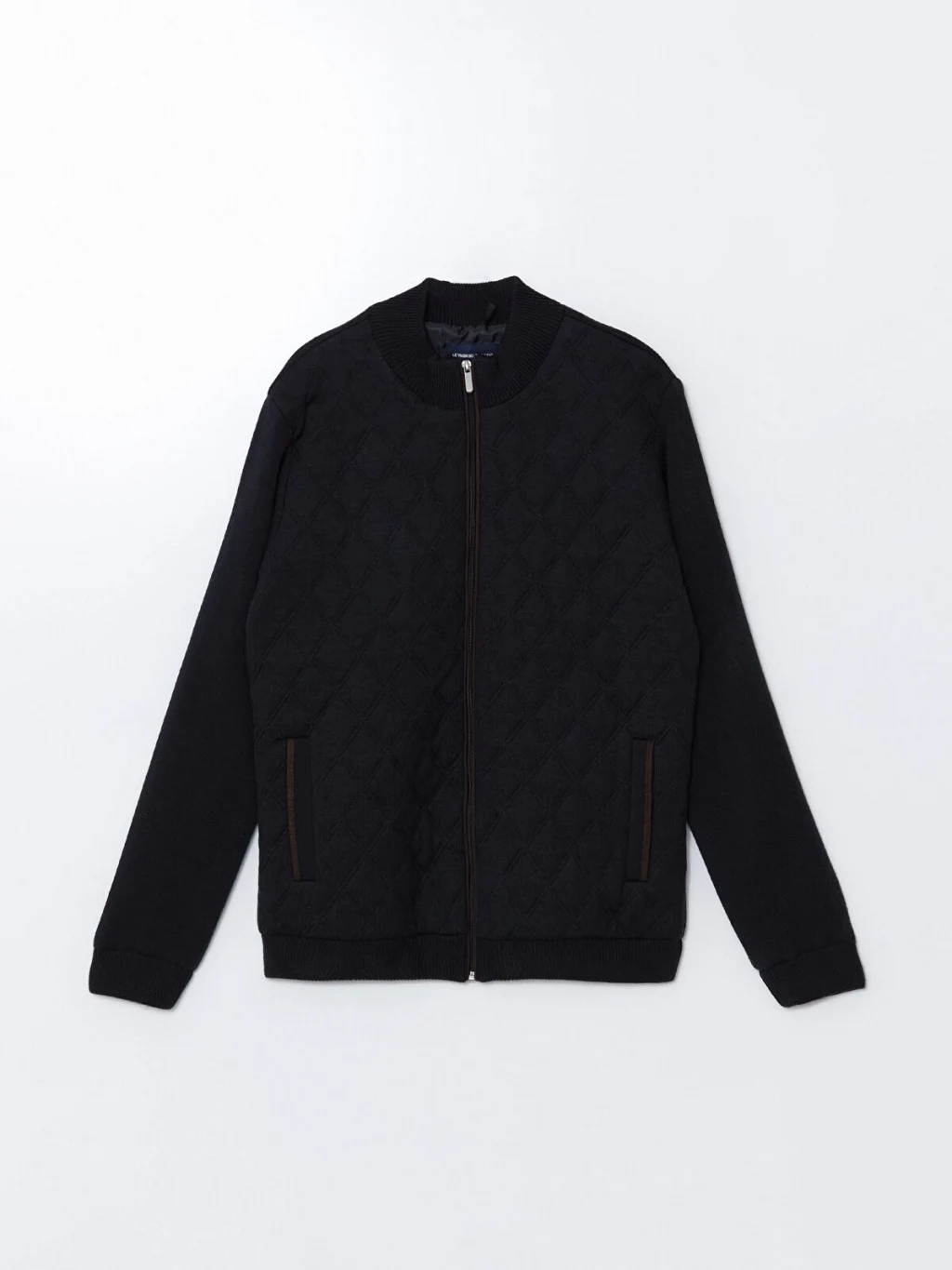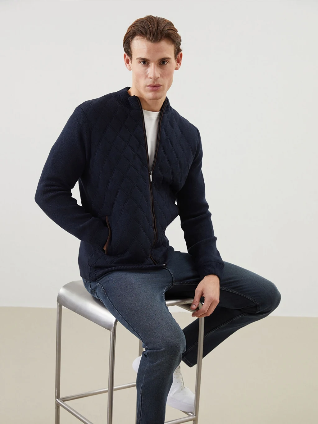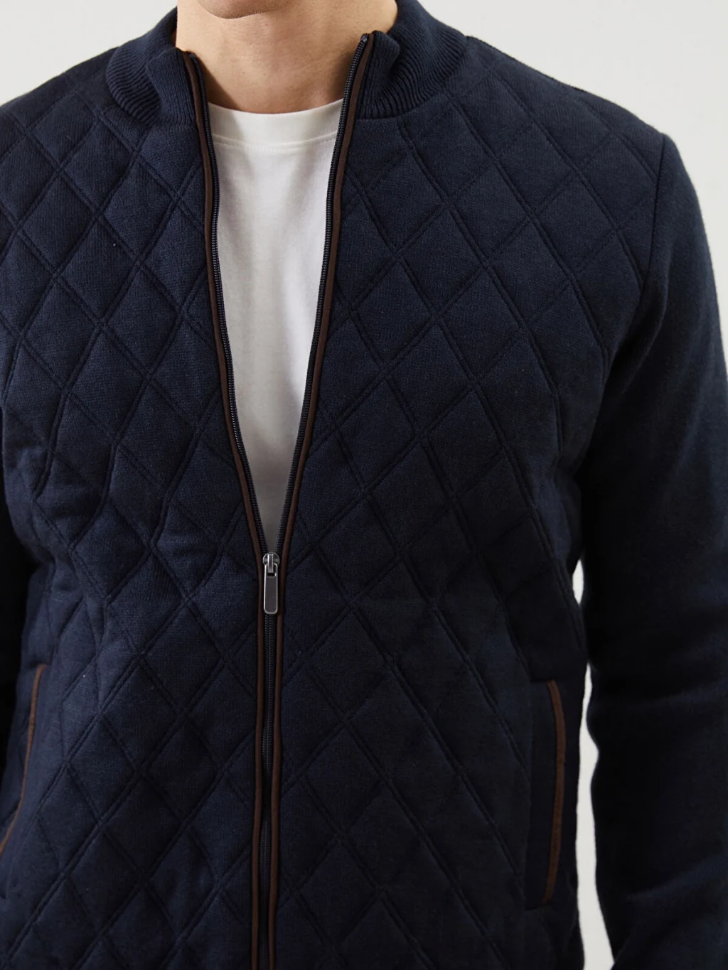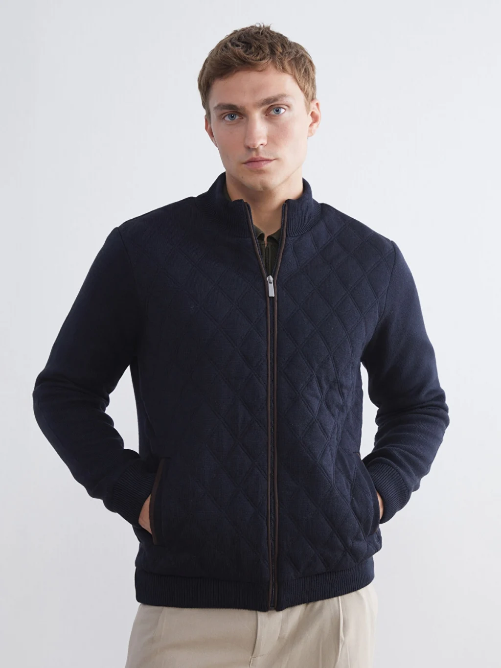 Bomber yakalı ve uzun kollu erkek hırka, ince triko kumaştan üretilmiştir. Kapitone desenli gövdesi önden fermuarlıdır ve iki adet yan cebi bulunur.