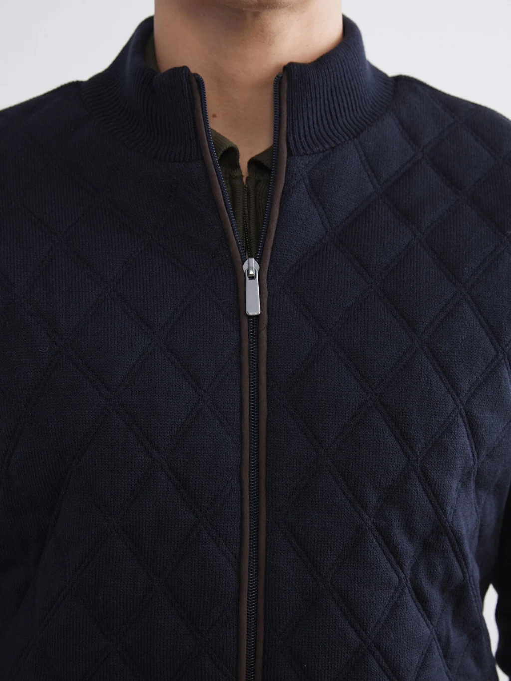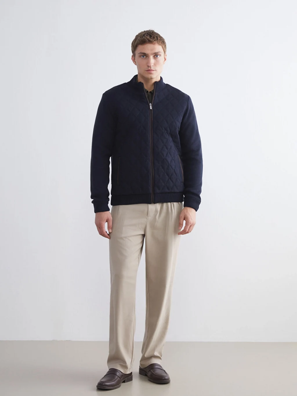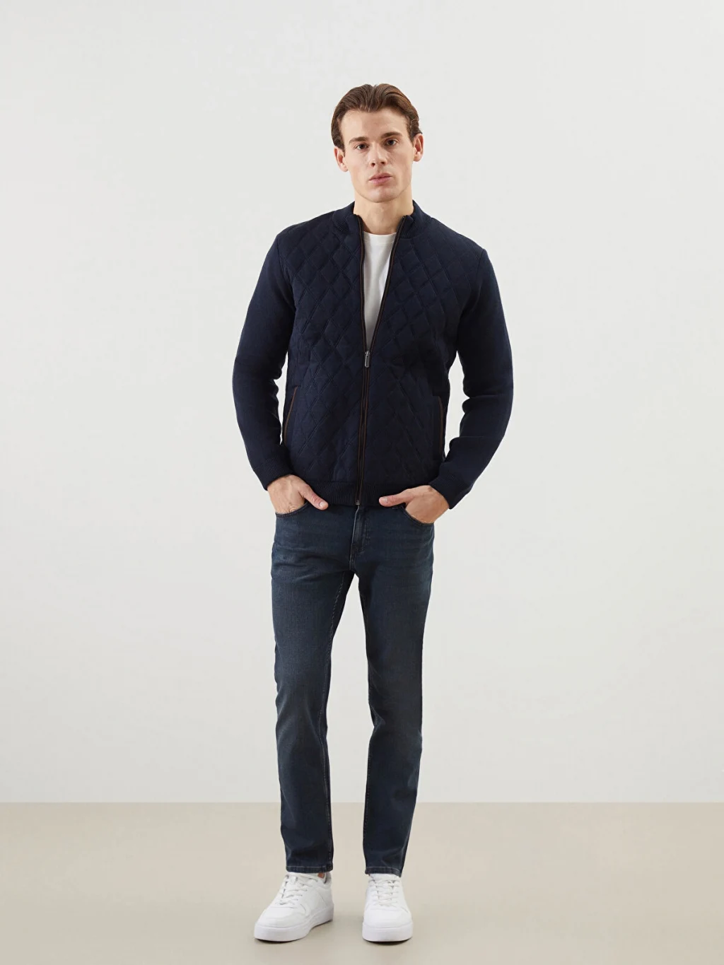 Bomber yakalı ve uzun kollu erkek hırka, ince triko kumaştan üretilmiştir. Kapitone desenli gövdesi önden fermuarlıdır ve iki adet yan cebi bulunur.