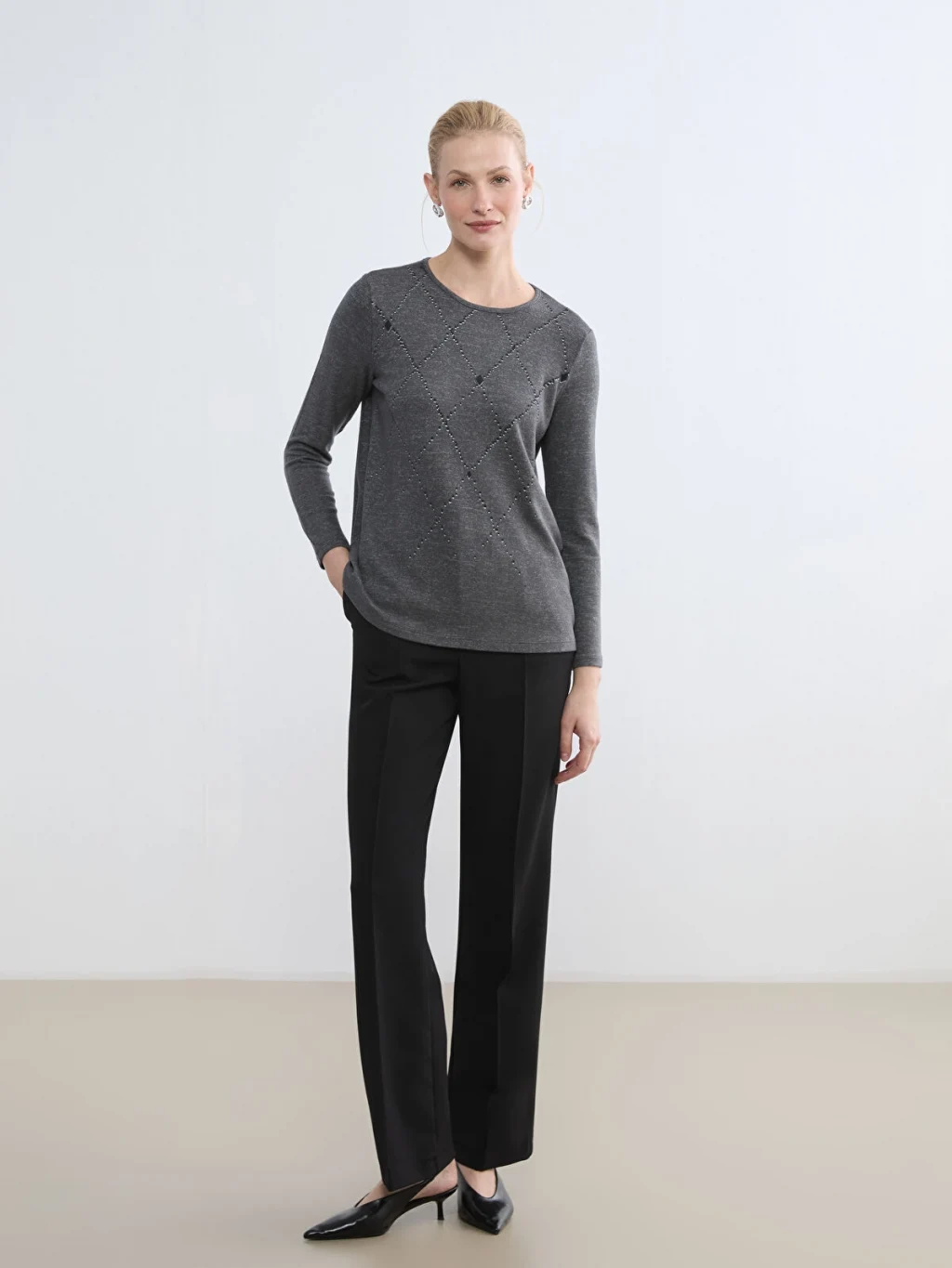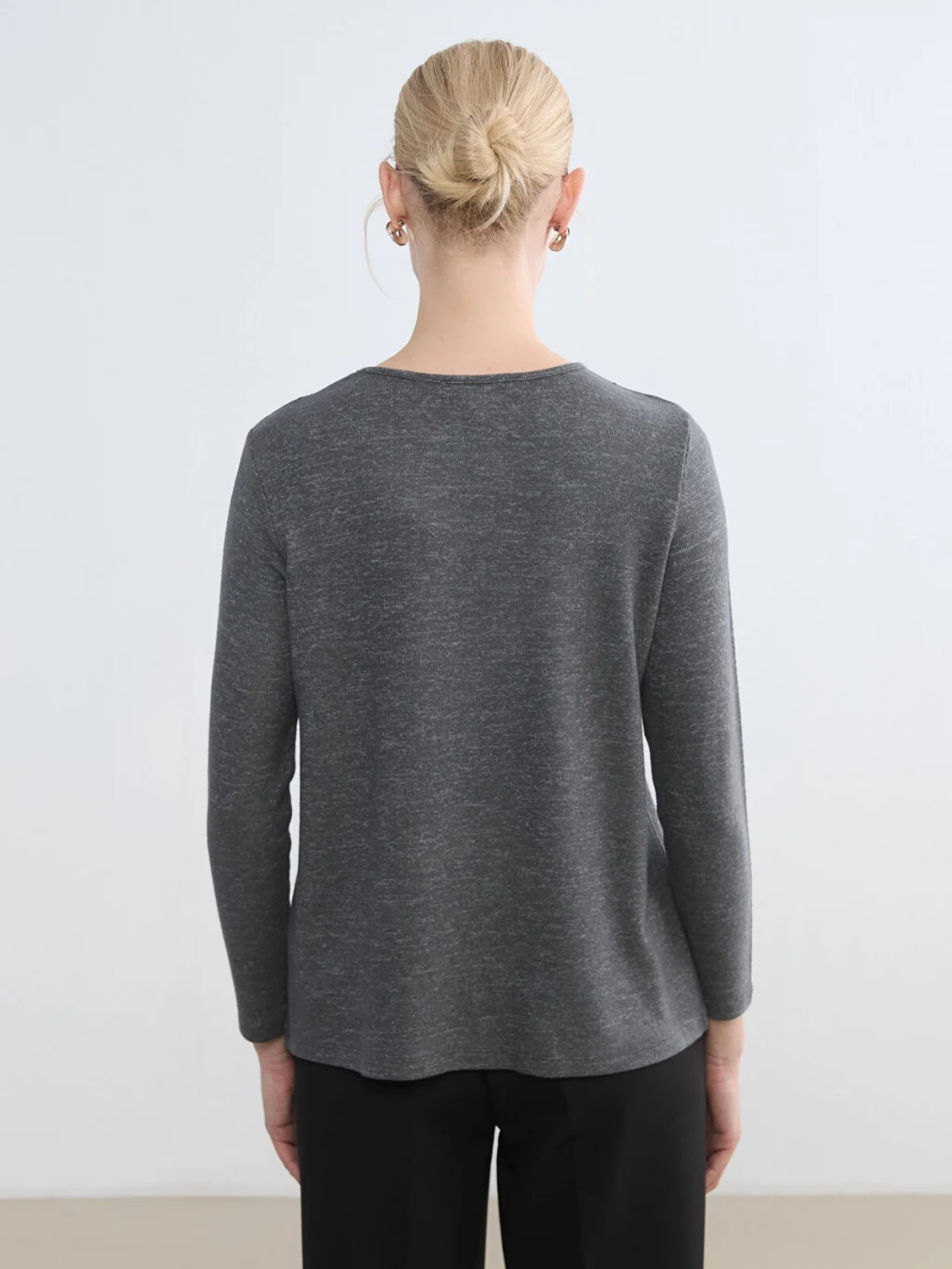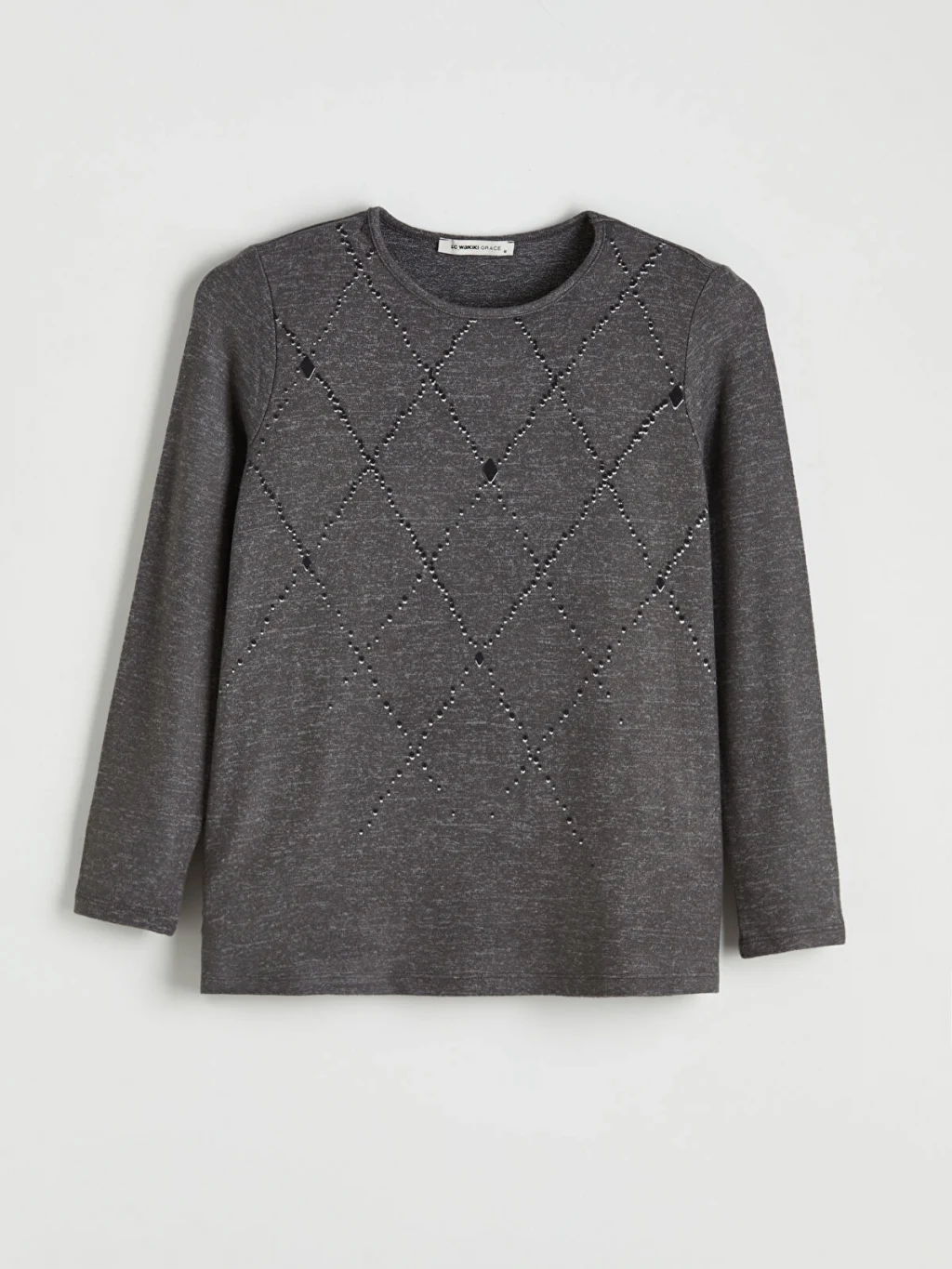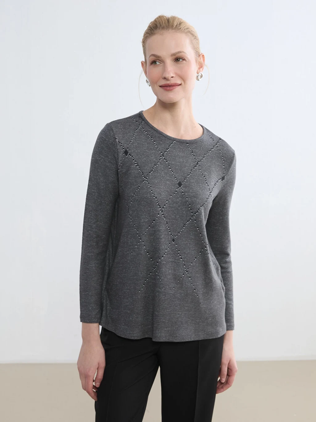 Standart kalıp, bisiklet yaka ve uzun kollu kadın tişört, desenli tasarıma sahiptir.