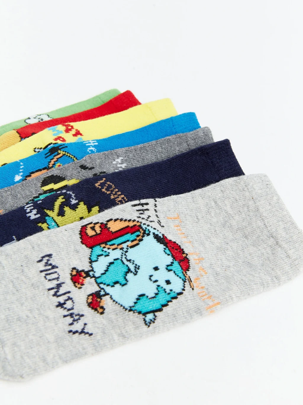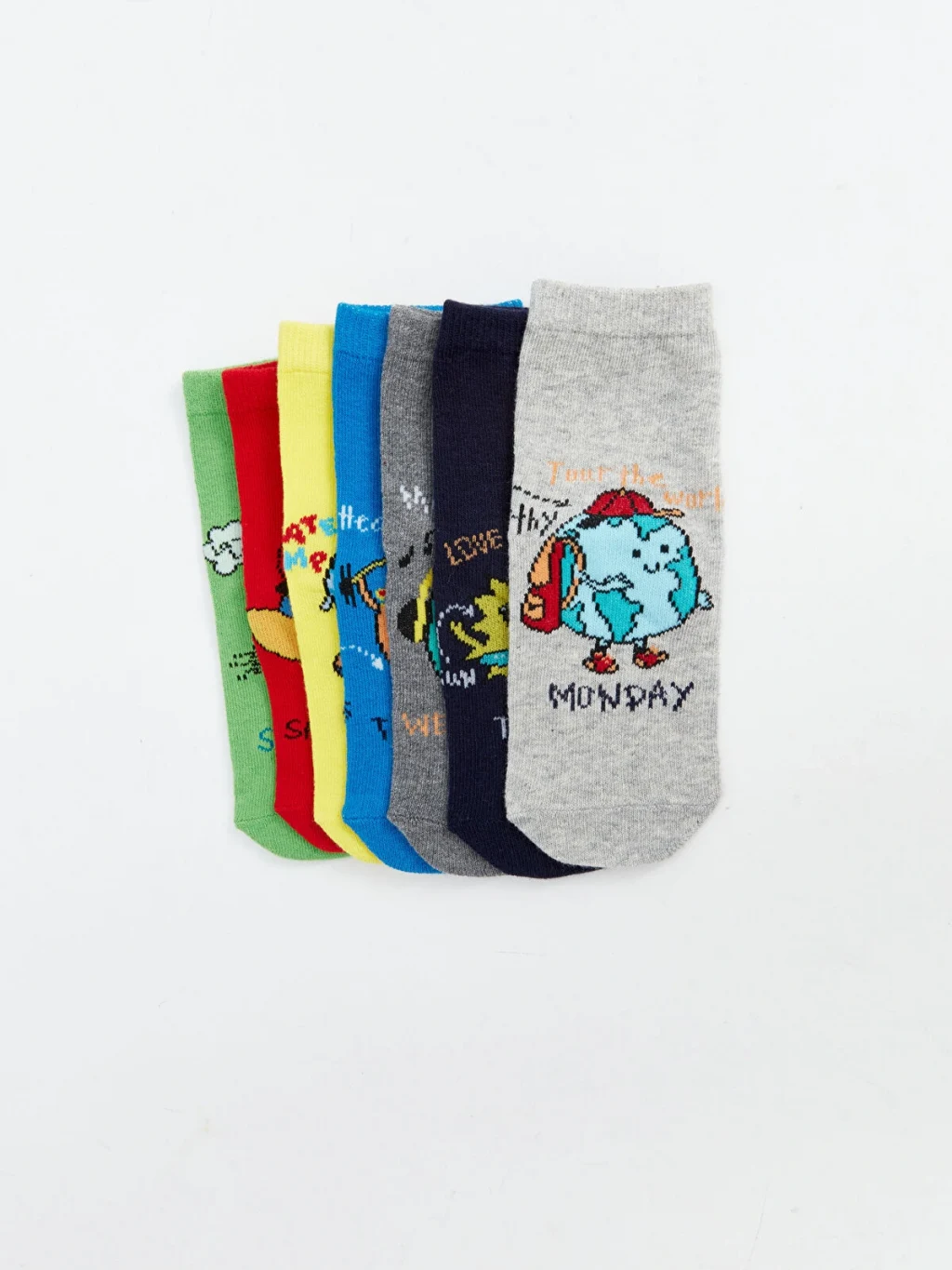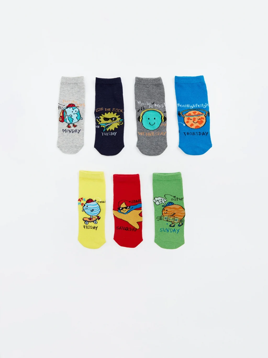 Erkek çocuk için 7 çiftten oluşan soket çorap seti, her biri farklı desenlere ve haftanın günleri baskısına sahiptir.