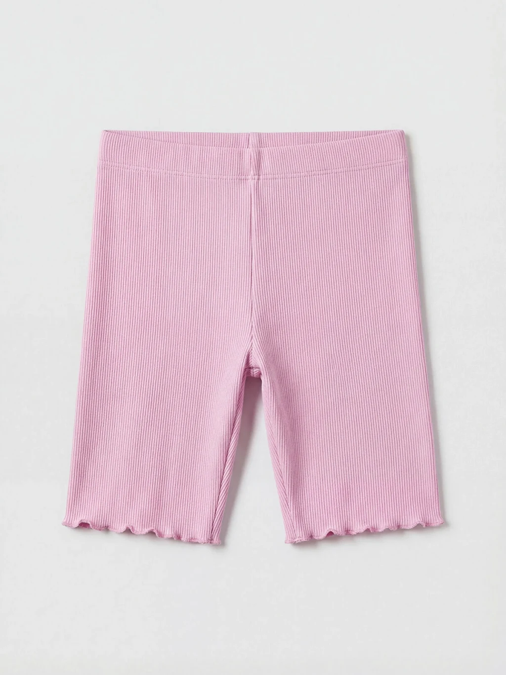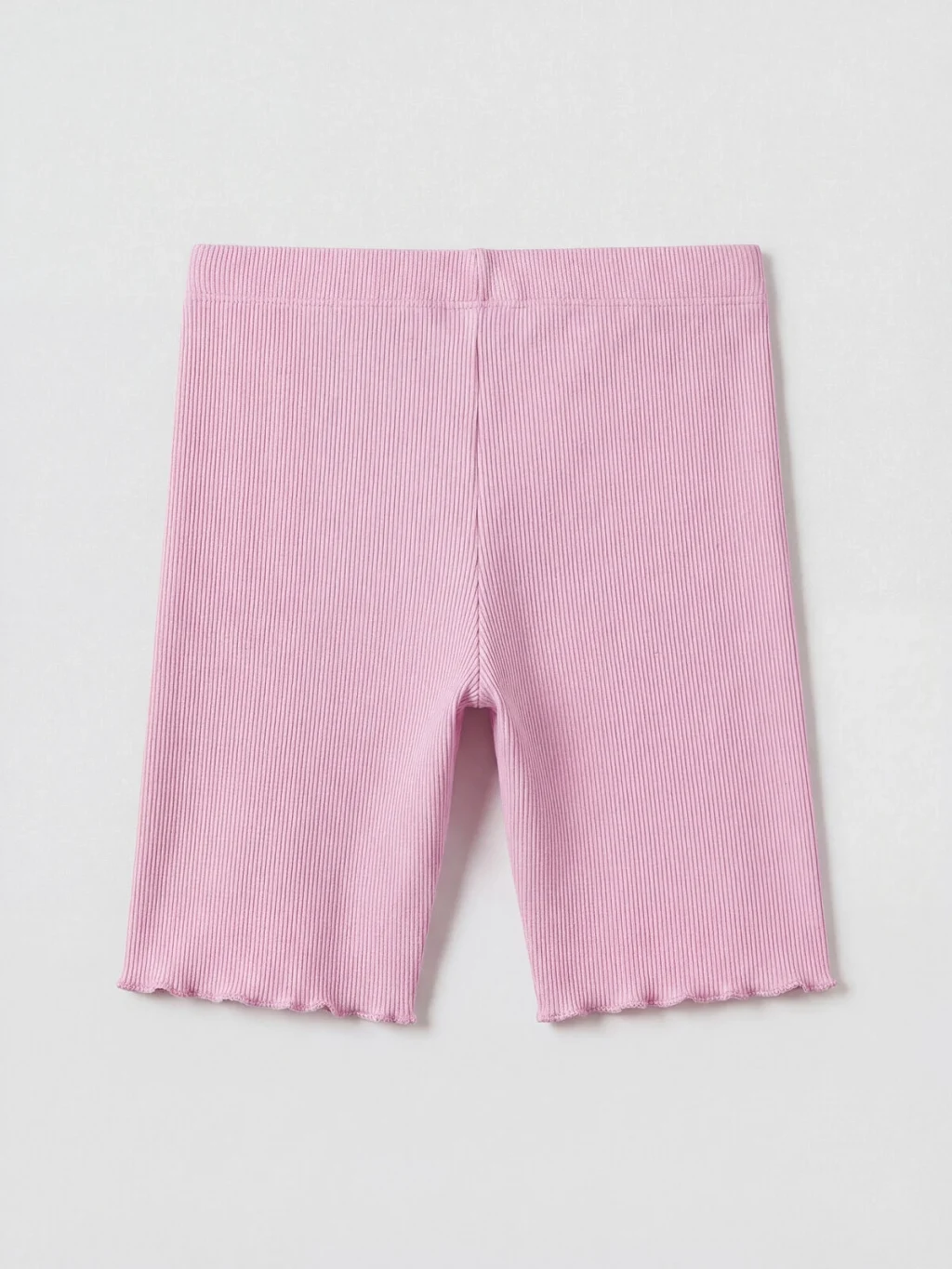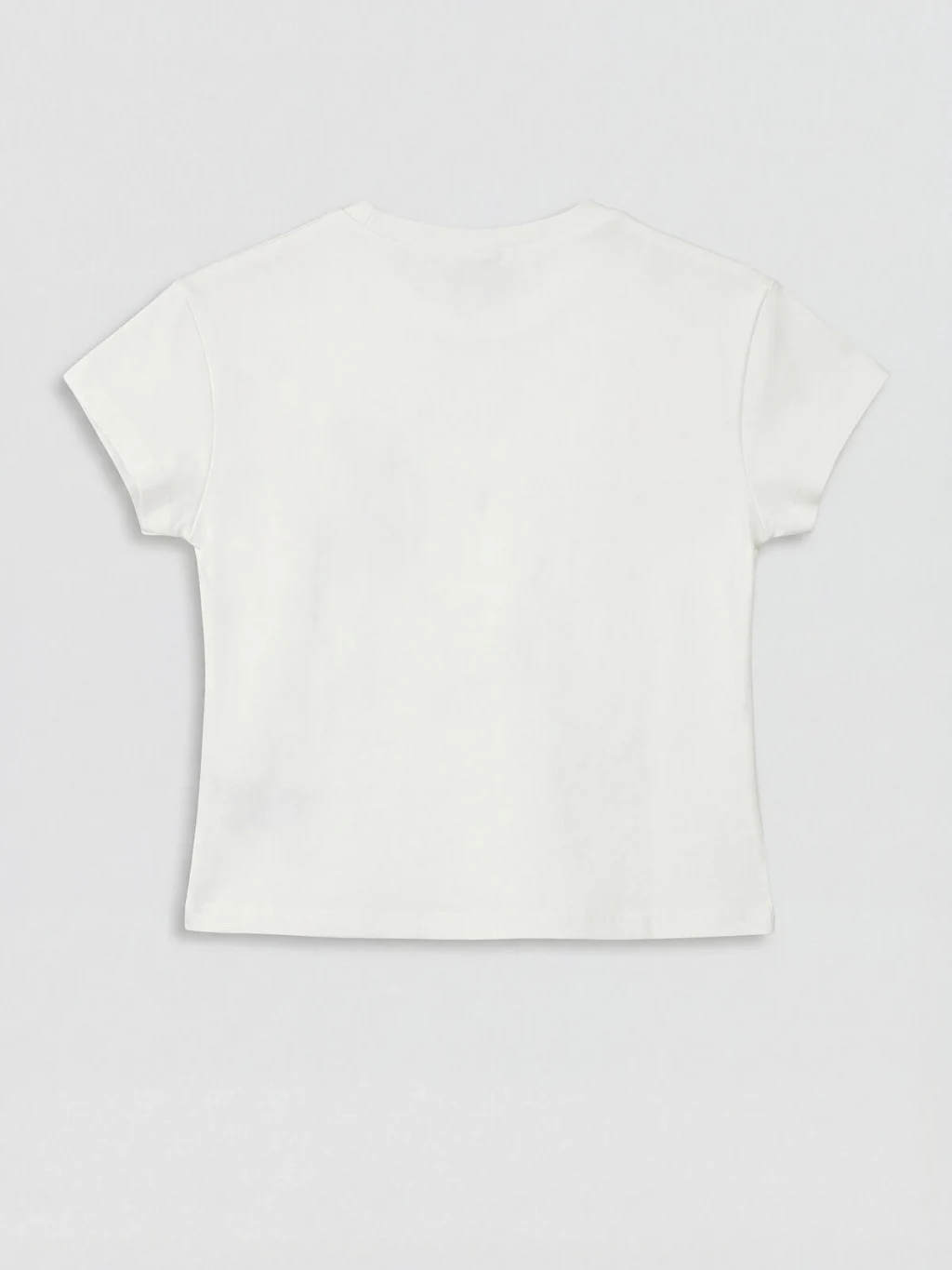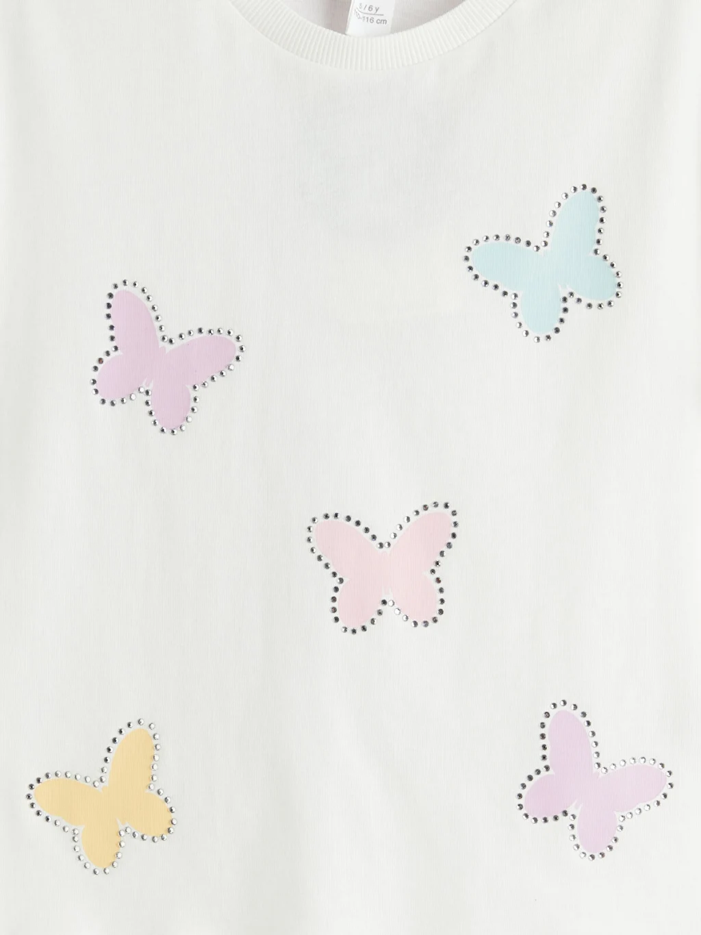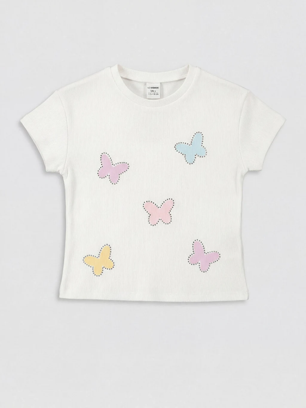 Bisiklet yaka, kısa kollu, baskılı tişört ve elastik belli, paçası dalgalı kesim şorttan oluşan kız çocuk takımı %100 pamuk kumaştan üretilmiştir.
