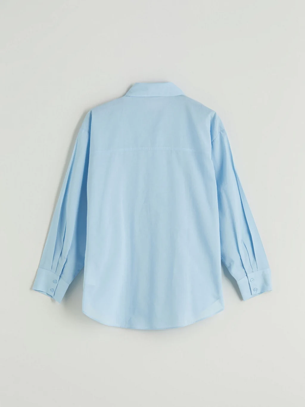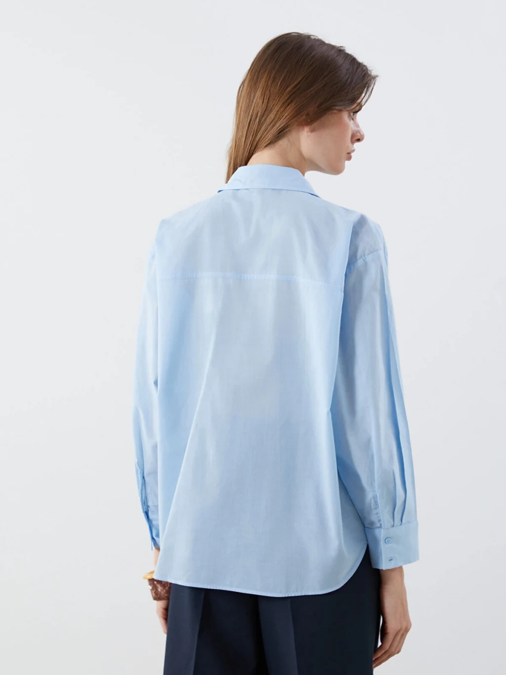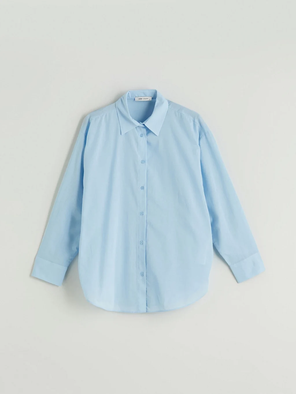 Gömlek yaka ve uzun kollu kadın gömlek, %100 pamuklu kumaştan üretilmiştir. Önden düğme kapamalıdır.
