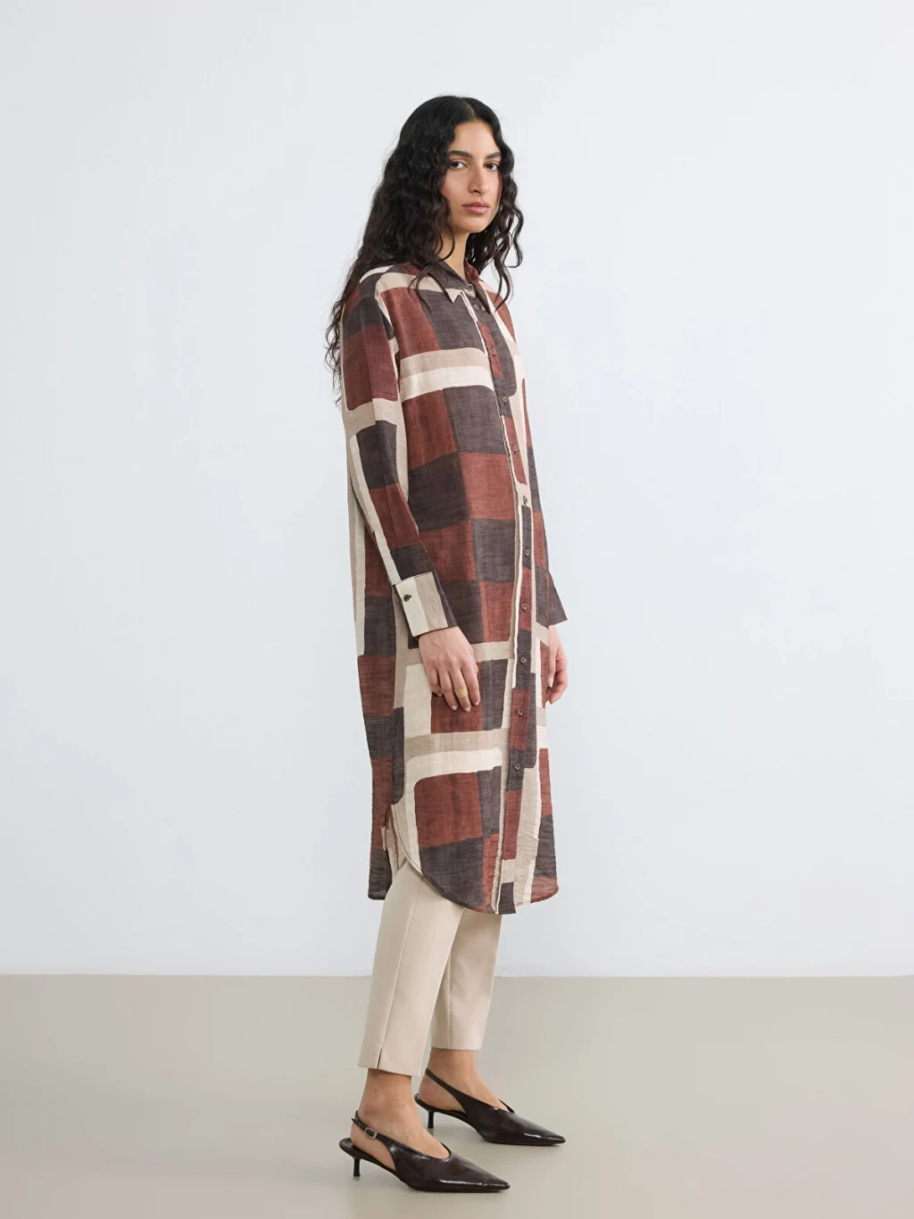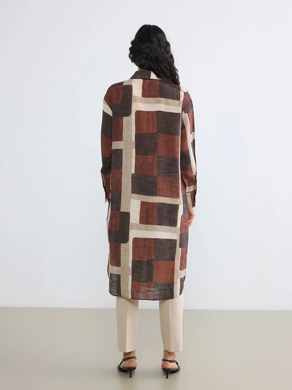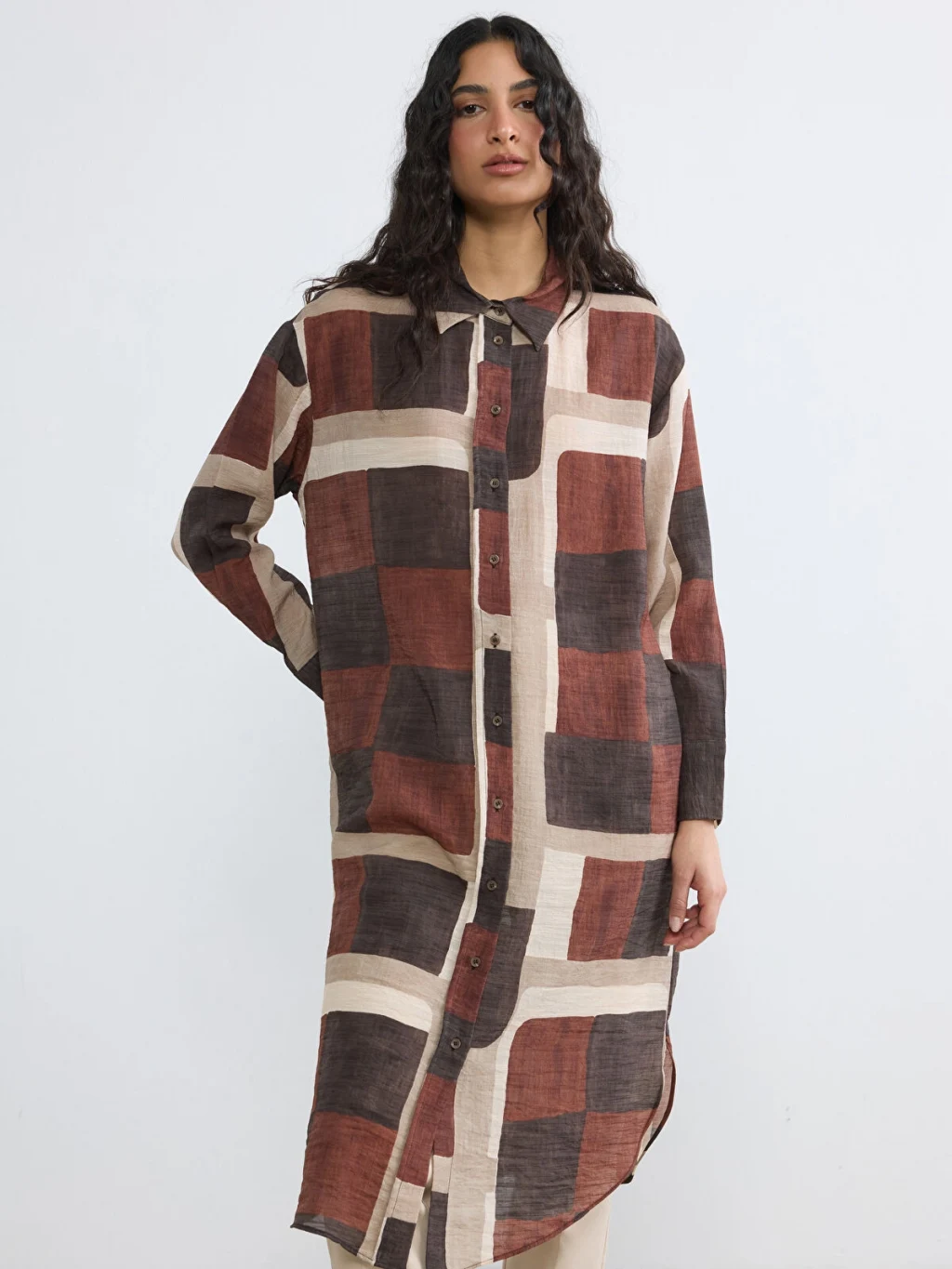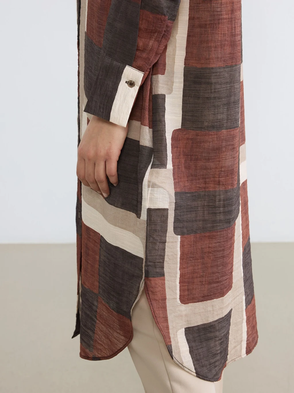 Uzun kollu kadın gömlek tunik, desenli kumaştan üretilmiştir. Önden düğme kapamalıdır ve manşetleri düğmelidir.
