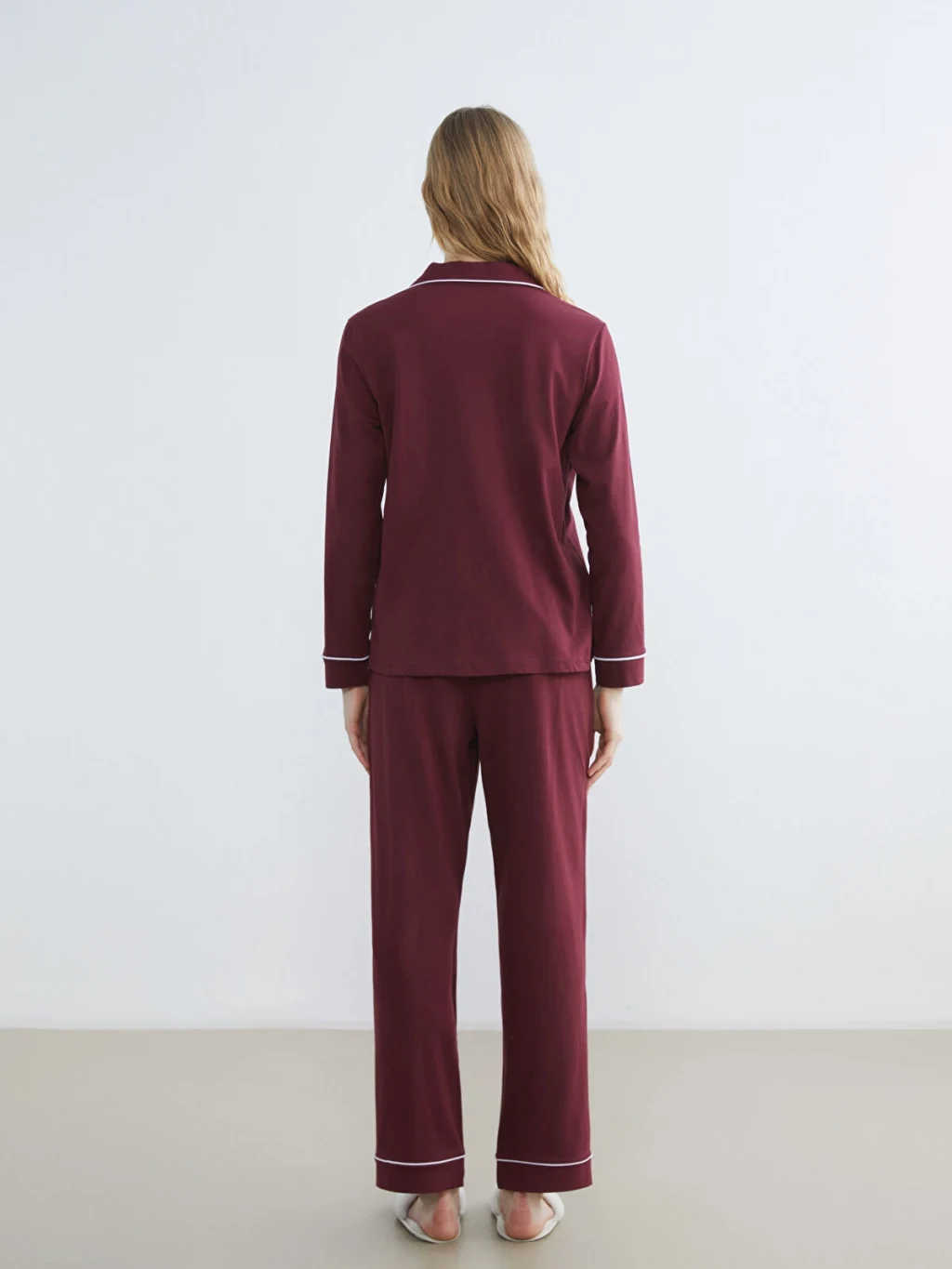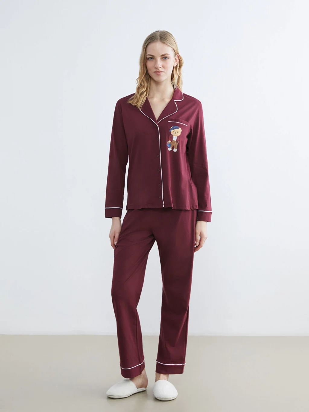 Gömlek yaka, uzun kollu, önden düğme kapamalı ve baskı detaylı cepli üst ile uzun pijama alttan oluşan kadın pijama takımı. %100 pamuk içerir.
