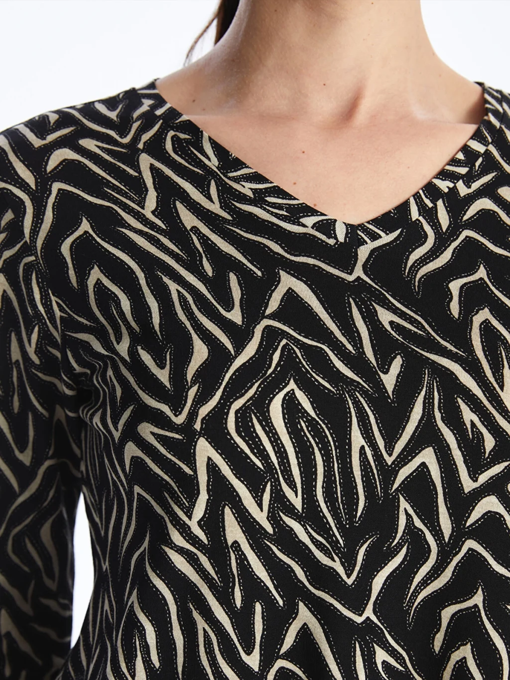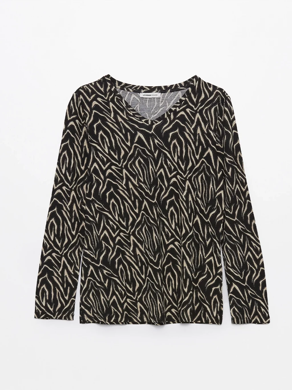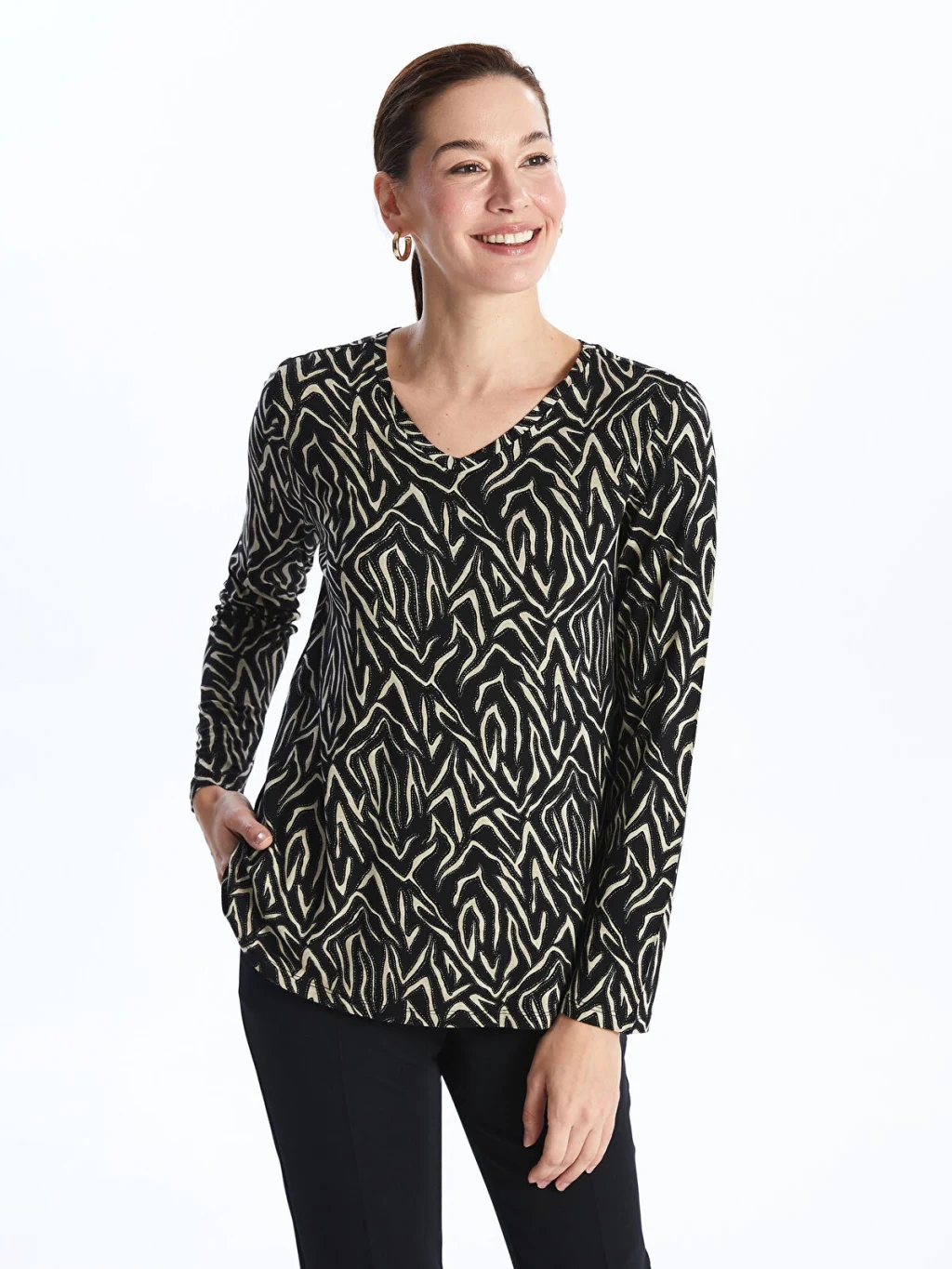 V yaka desenli uzun kollu kadın bluz, hafif ve yumuşak viskon karışımlı kumaştan üretilmiştir, gün boyu konfor ve rahatlık sağlar. Canlı ve şık deseni ile hem iş yerinde hem de sosyal etkinliklerde dikkat çeker.