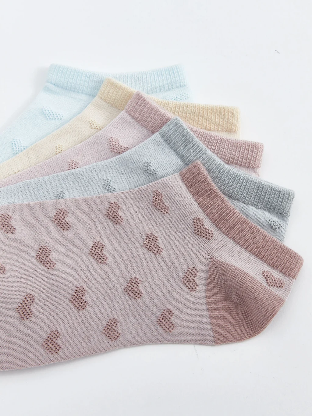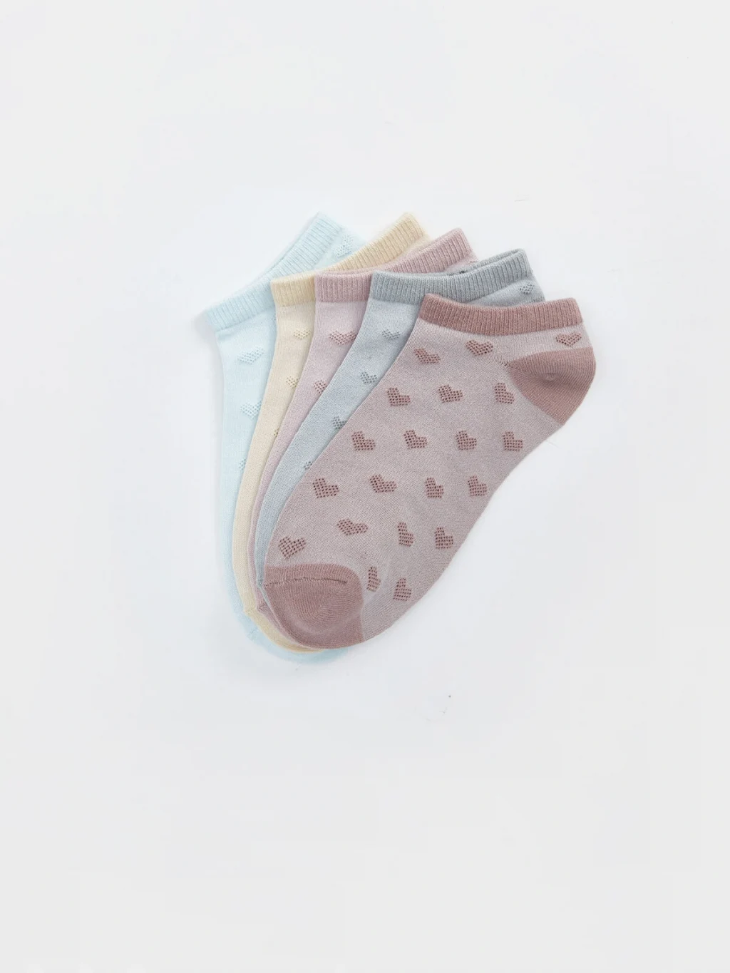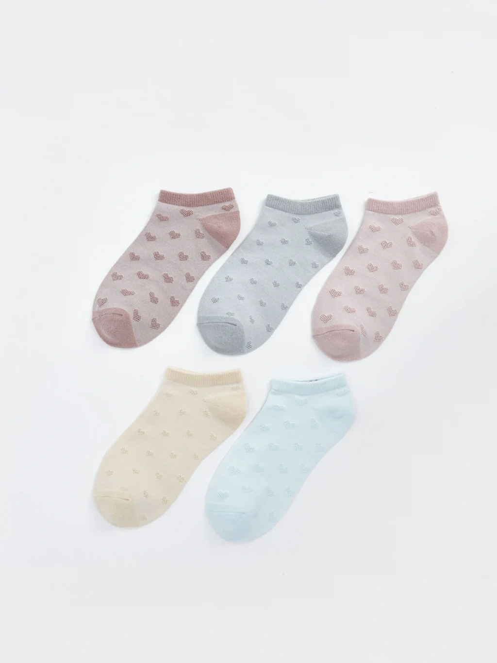 Kendinden desenli kadın patik çoraplar, kalpli desenleriyle tarzınıza renk katarken, yüksek kaliteli pamuk içeriğiyle ayaklarınızı konforlu tutar. Beşli paket halinde sunulan bu çoraplar, hem şık görünüm sunar hem de rahatlık sağlar.
