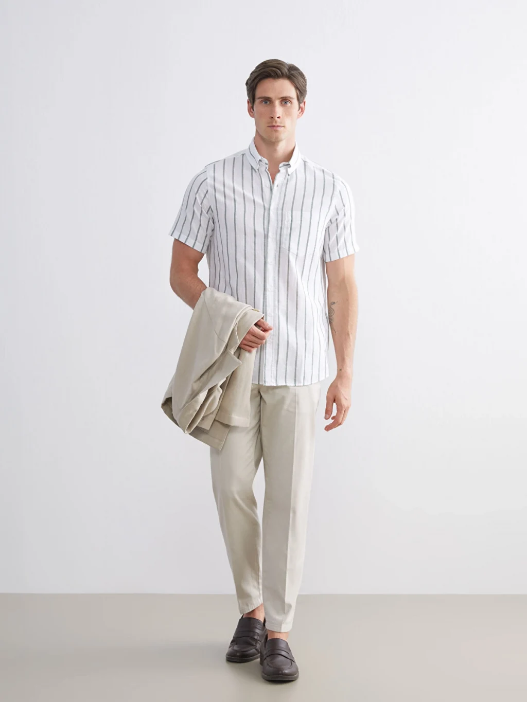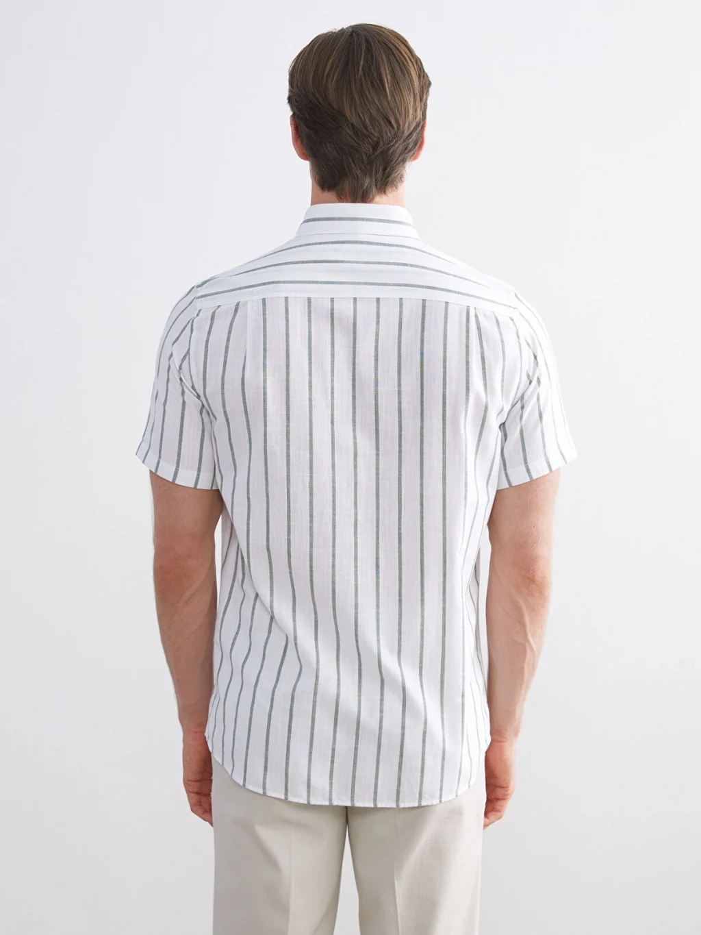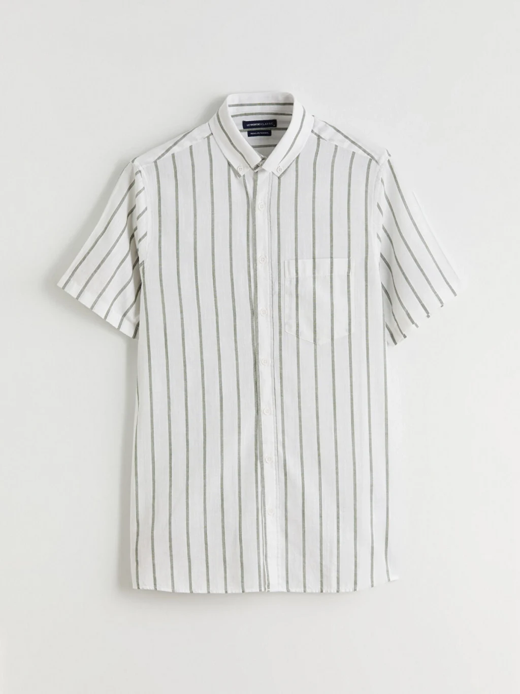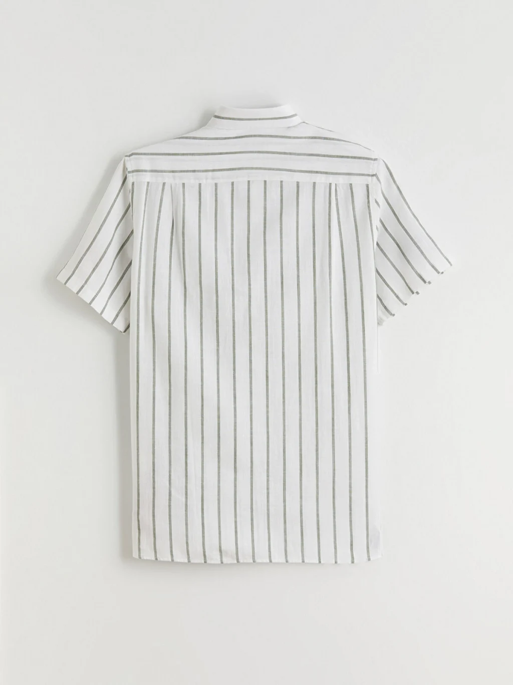 Gömlek yakalı, kısa kollu, çizgili desenli erkek gömlek, %100 pamuklu kumaştan üretilmiştir; önden düğme kapamalıdır ve tek göğüs cebi bulunur.