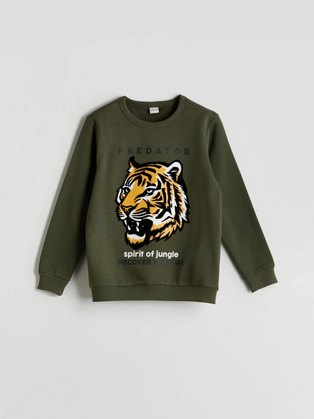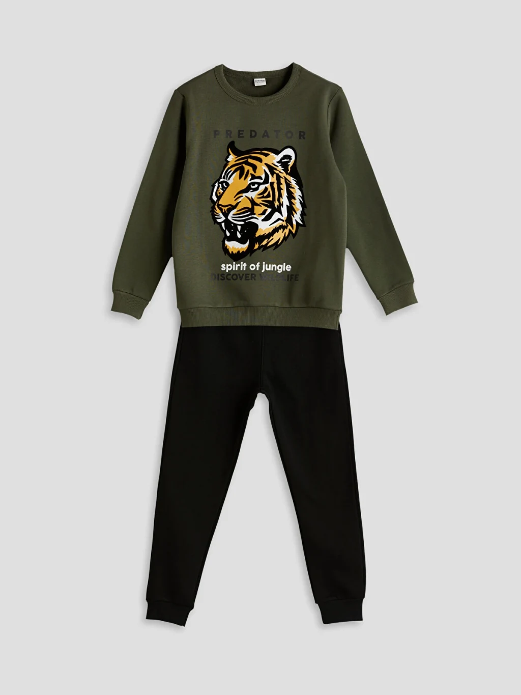 3 iplik şardonlu kumaştan üretilmiş, kaplan baskılı, paça ve manşetlerde ribanalı eşofman takımı.