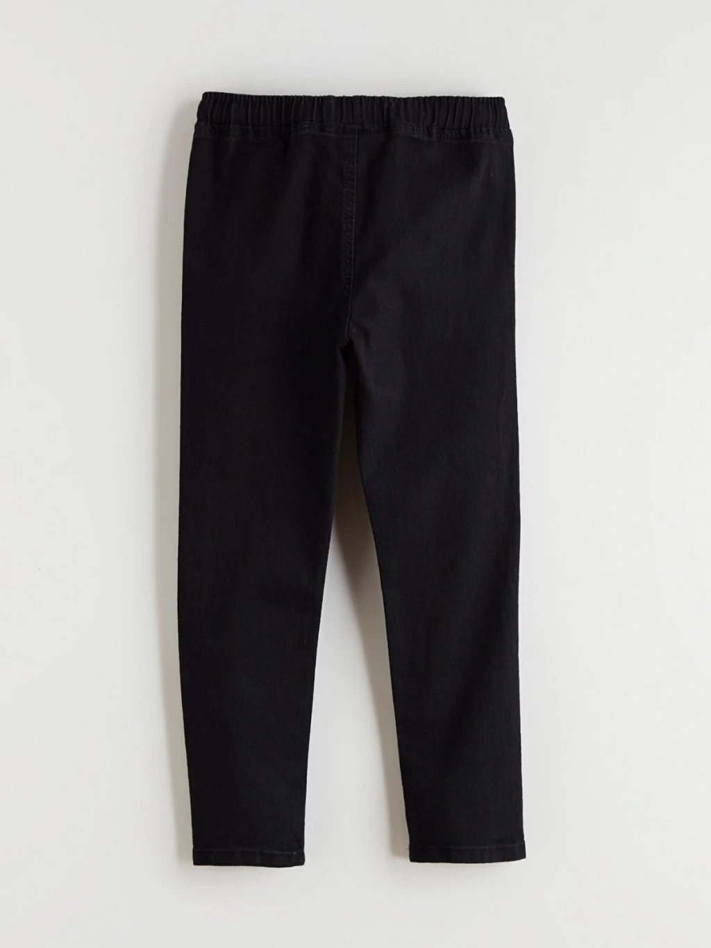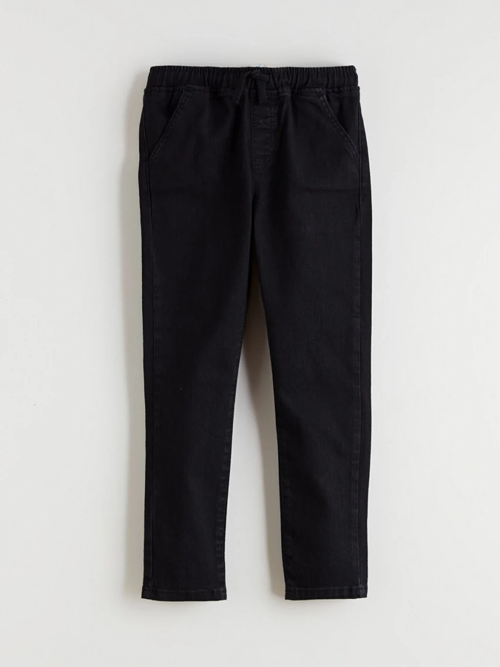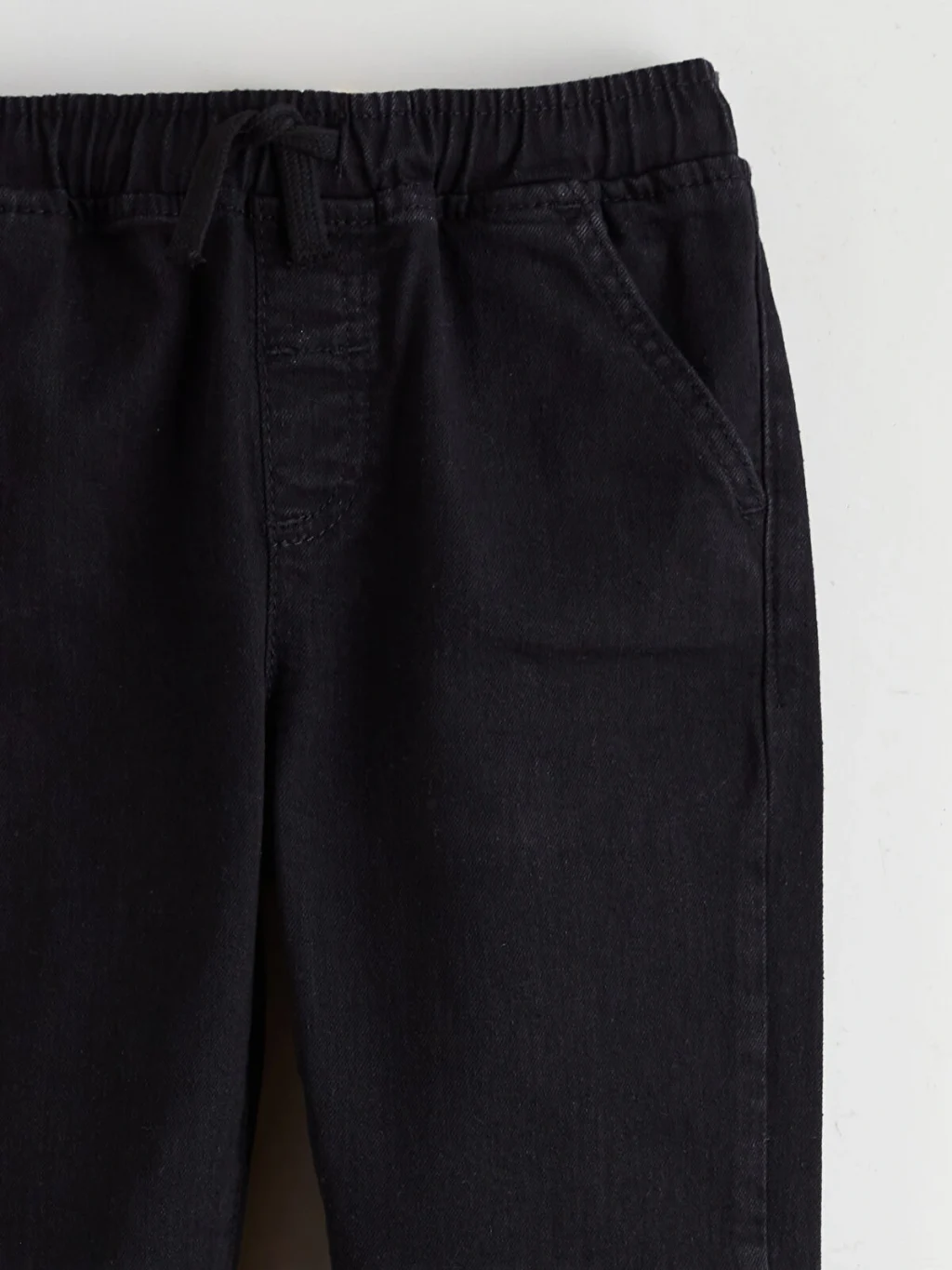 Yüksek pamuk içeren kumaştan üretilen dar kalıp erkek çocuk jean pantolon, beli lastikli ve ayarlanabilir bağcıklıdır. İki adet ön cebi bulunur.