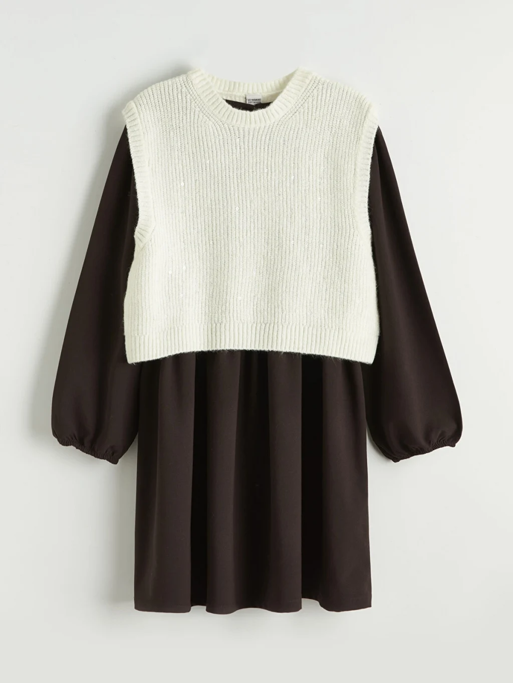 Triko süveterli elbise takımı, bisiklet yaka ve uzun kollu tasarıma sahiptir. Elbise arkadan düğme kapamalı, süveter pul işlemelidir.
