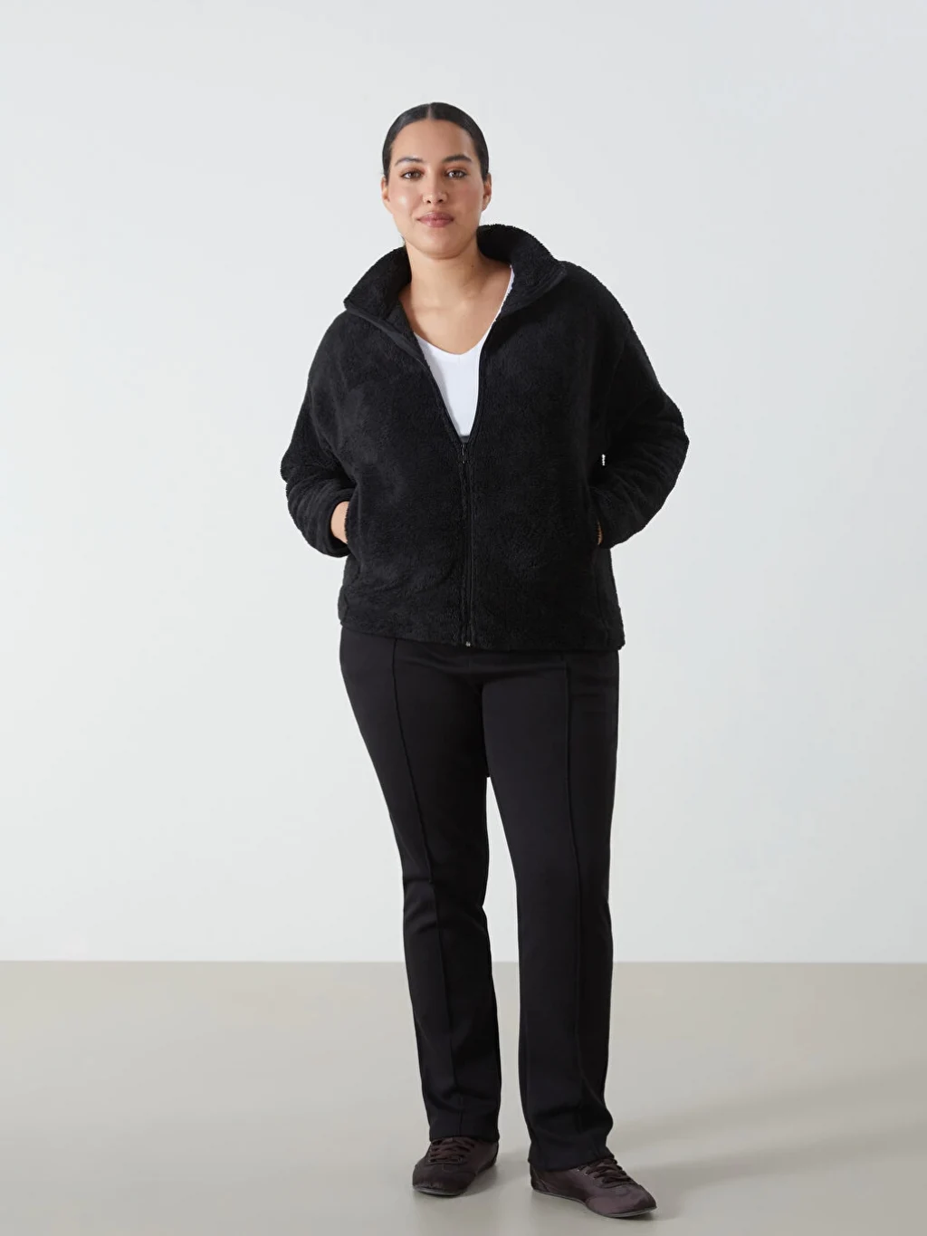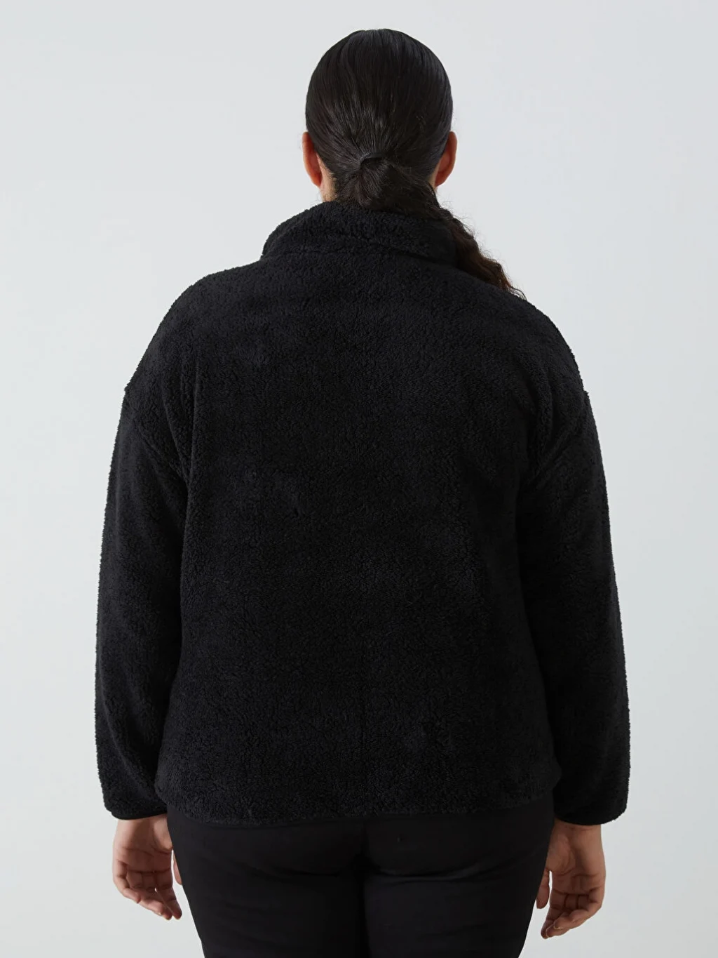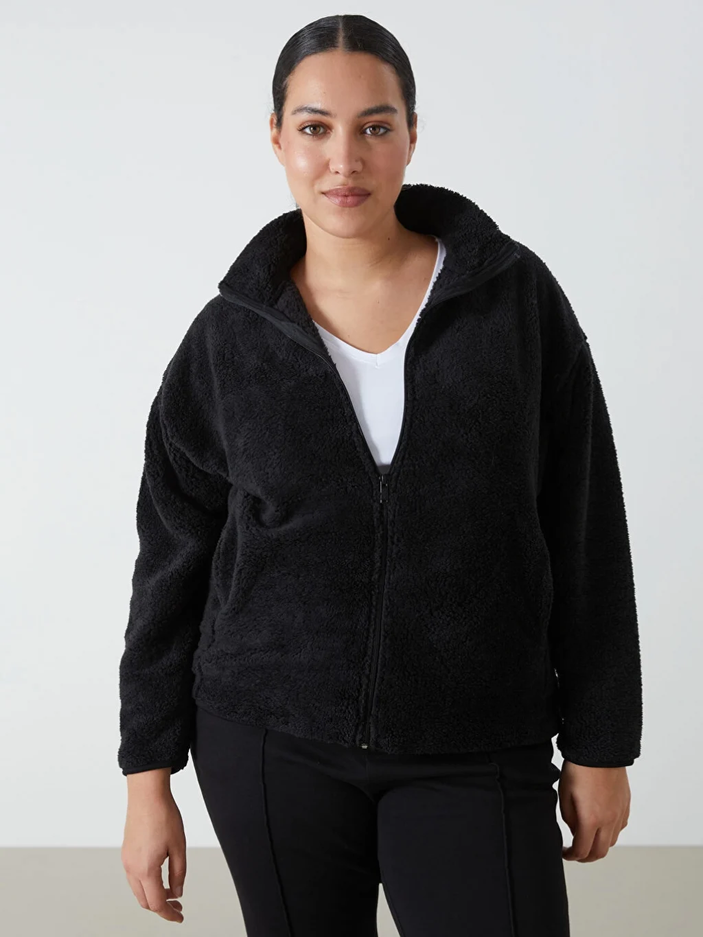 Dik yaka pelüş kadın sweatshirt, önden fermuar kapamalı tasarımıyla kolayca giyilip çıkarılabilir. İki yandan cepli olması, hem şıklık hem de işlevsellik sunarken, pelüş dokusu sayesinde sizi sıcacık tutar.