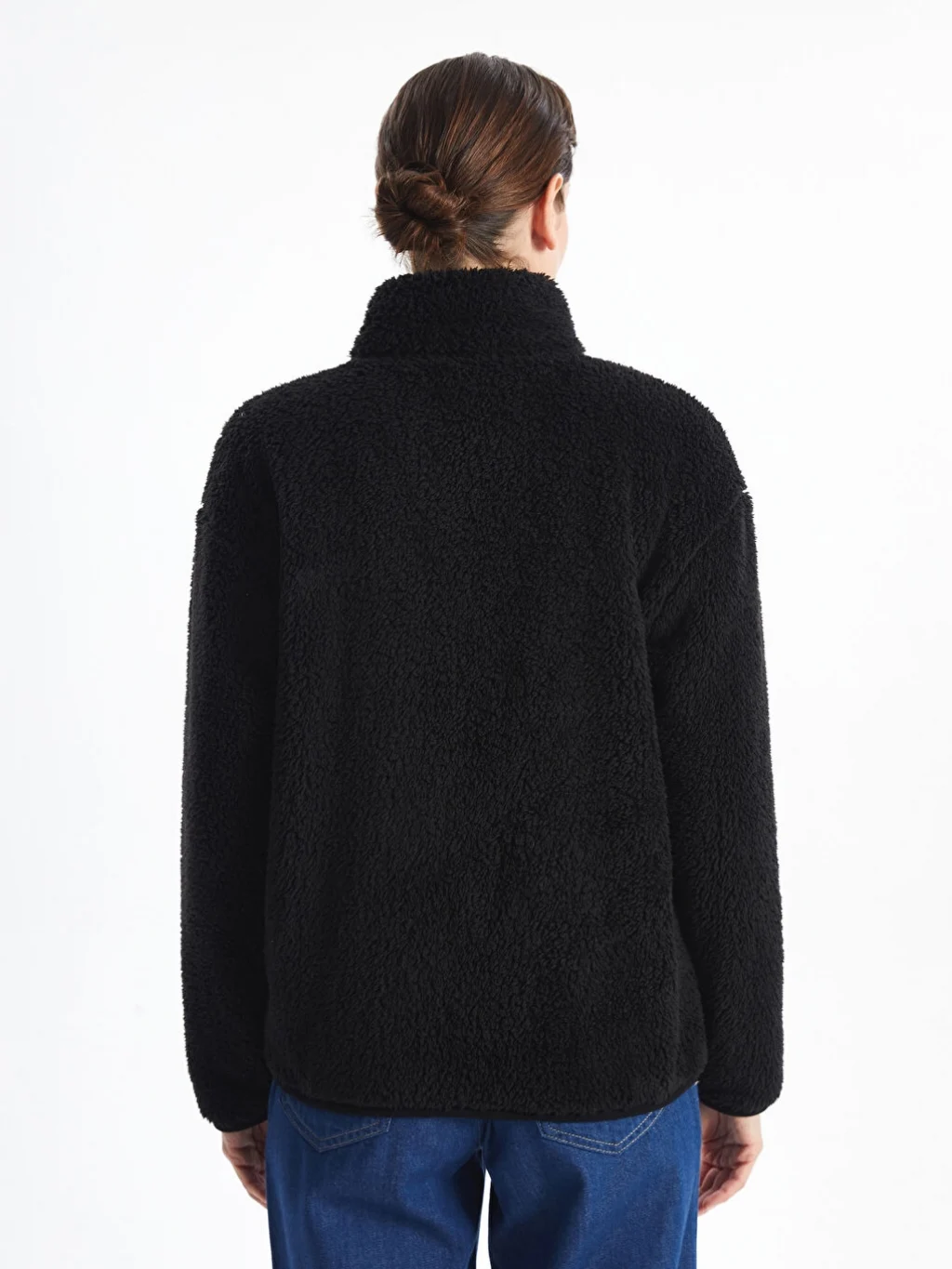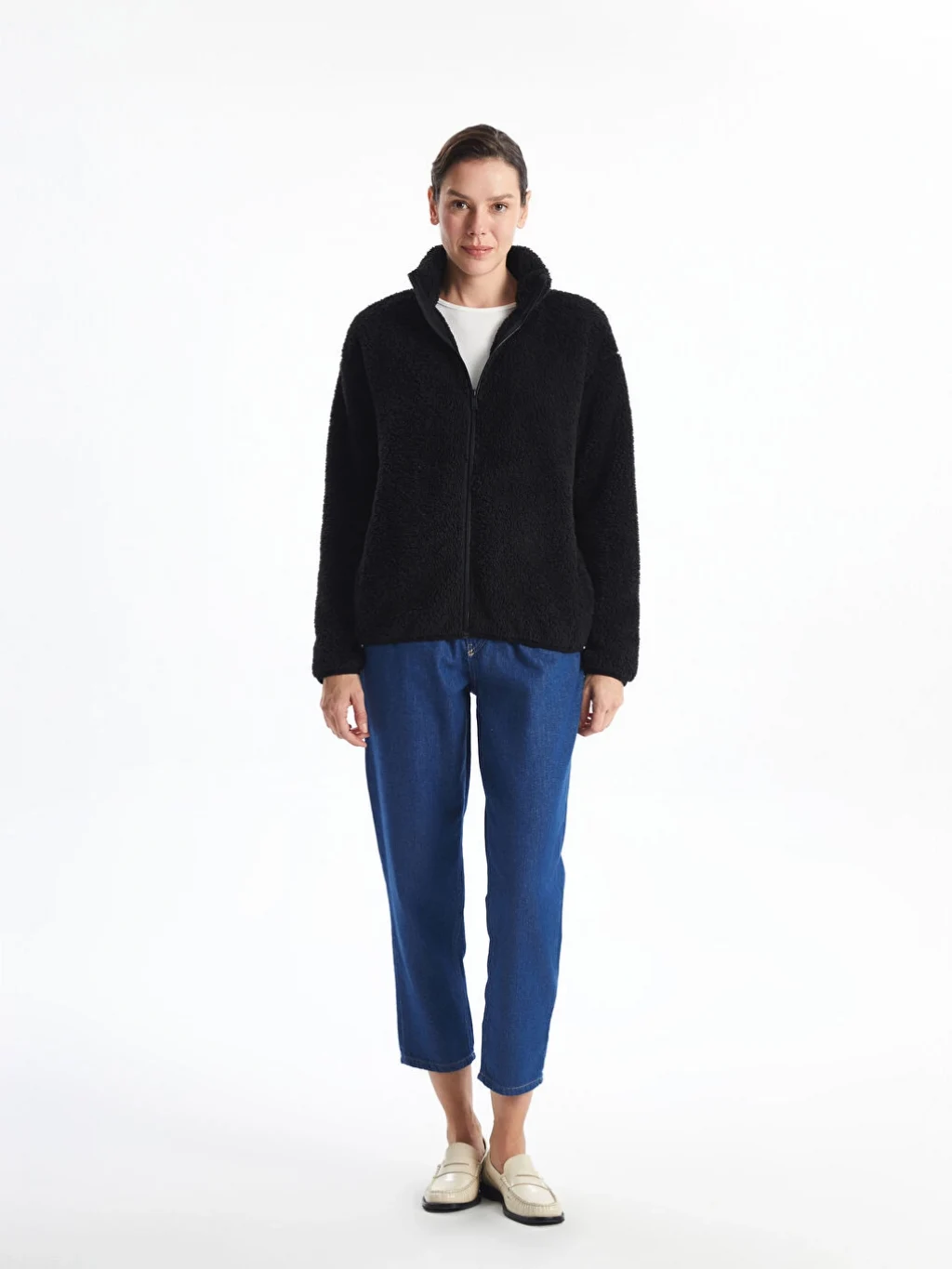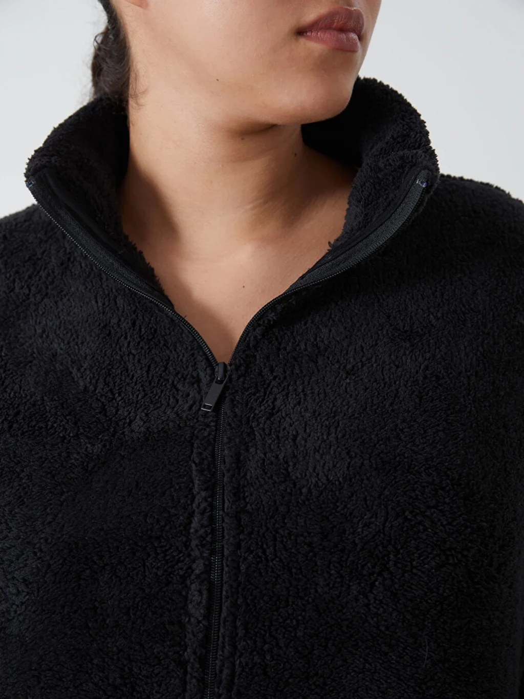 Dik yaka pelüş kadın sweatshirt, önden fermuar kapamalı tasarımıyla kolayca giyilip çıkarılabilir. İki yandan cepli olması, hem şıklık hem de işlevsellik sunarken, pelüş dokusu sayesinde sizi sıcacık tutar.