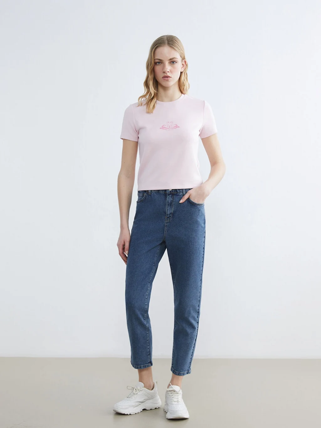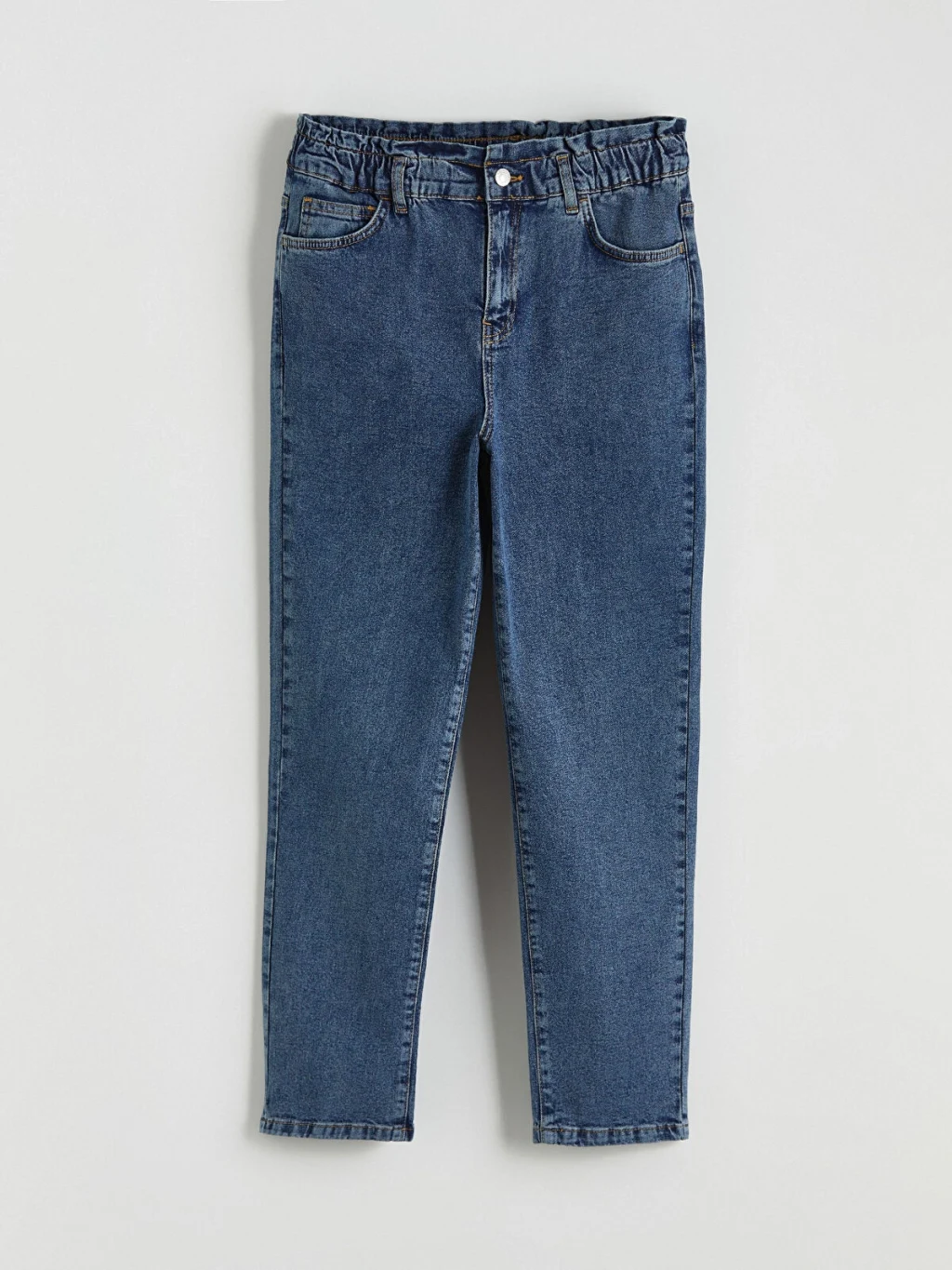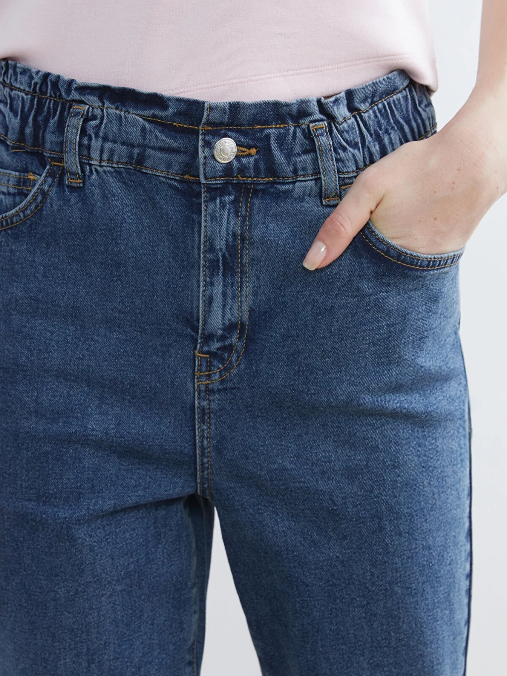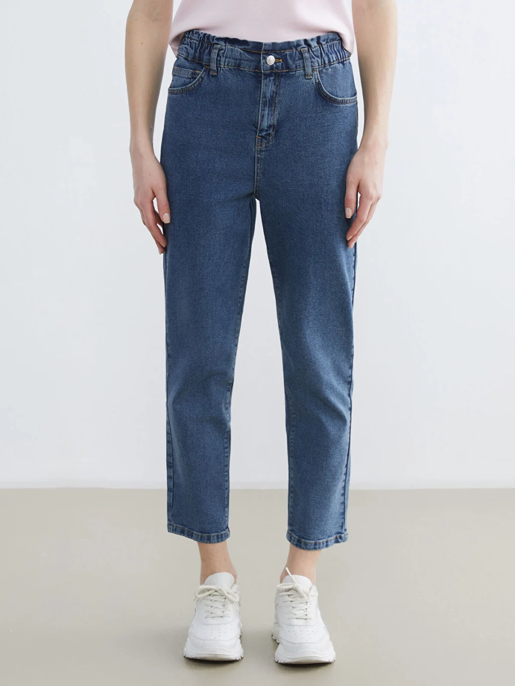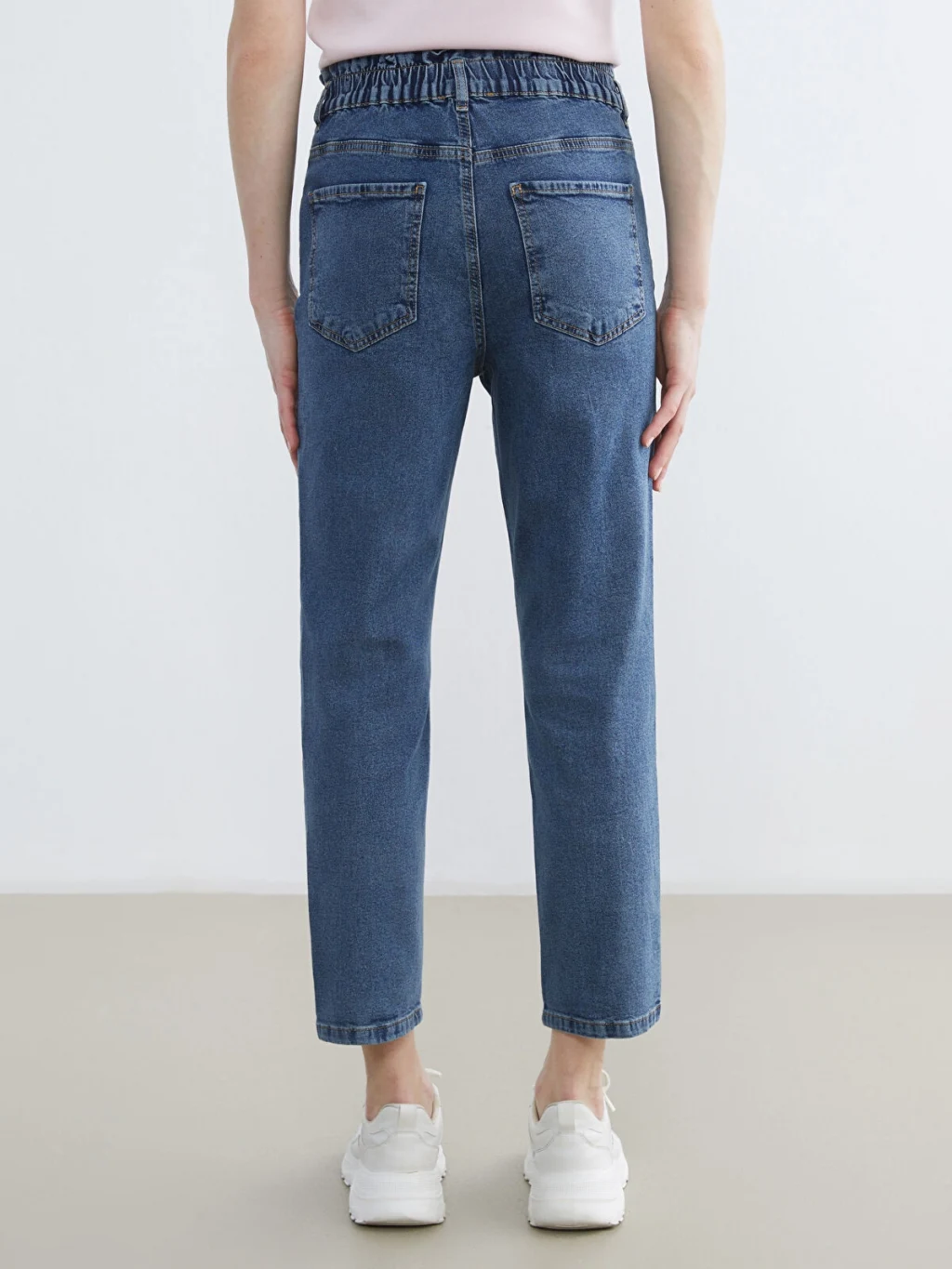 Slim fit jean pantolon, vücuda uyumlu bir şekilde otururarak şık bir görünüm sağlar. Giyinme kolaylığı sunmak için beli lastikli olarak tasarlanmıştır.