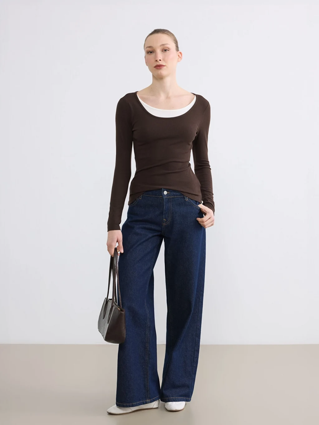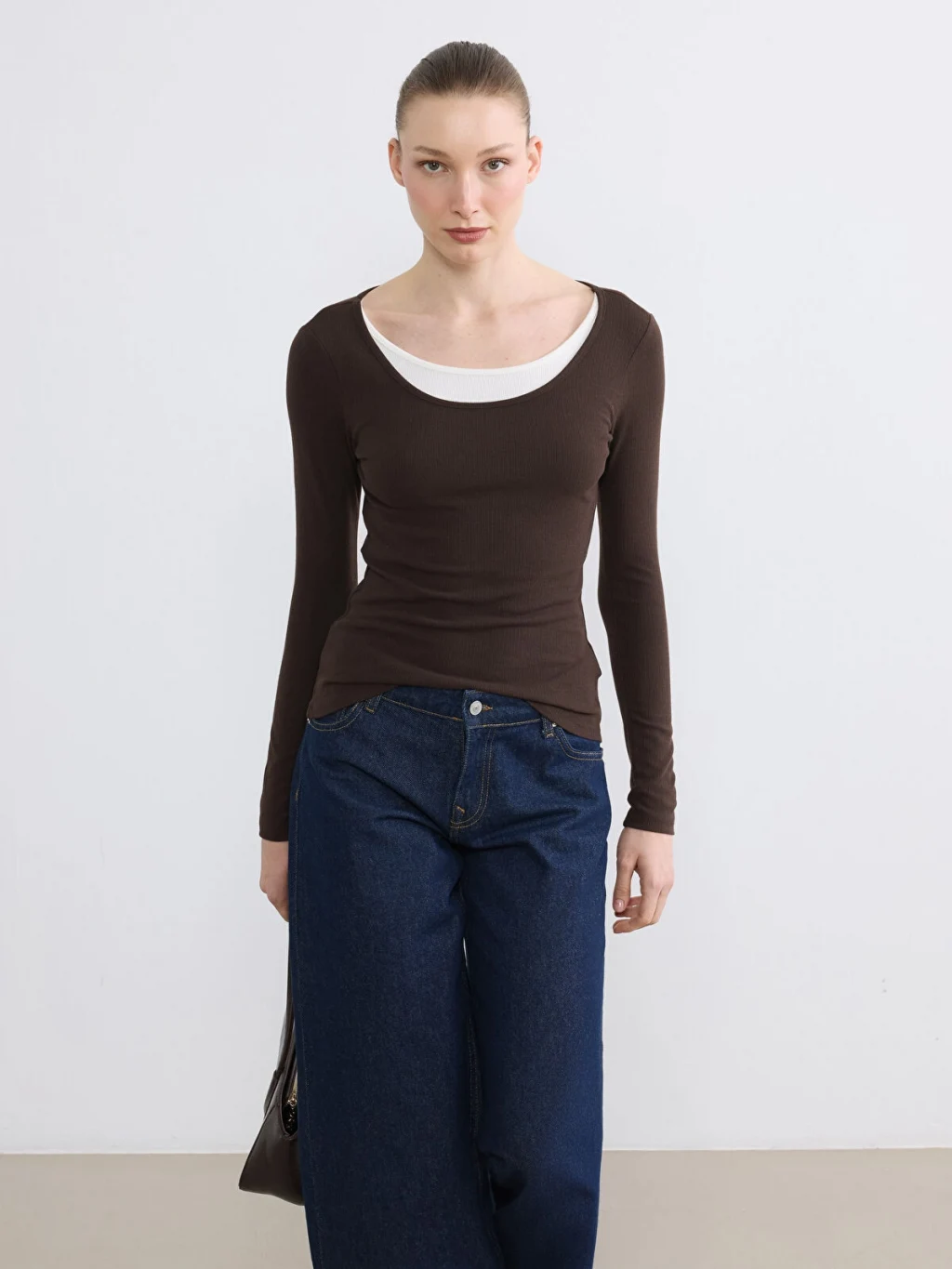Kadın body, u yaka ve uzun kollu tasarıma sahiptir. İçten atlet görünümlü olup fitilli kumaştan üretilmiştir.