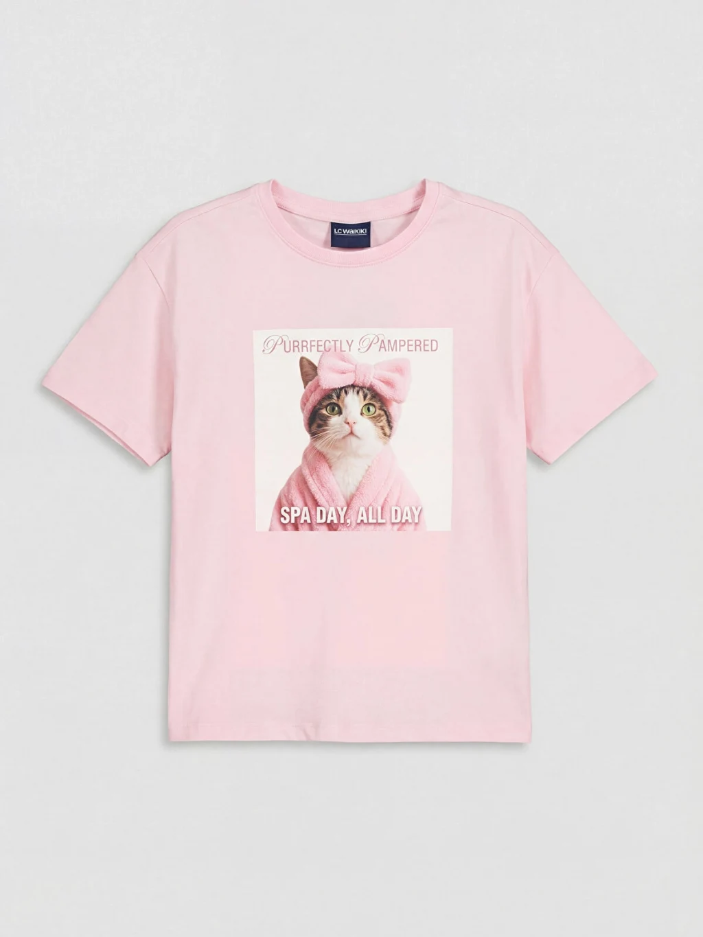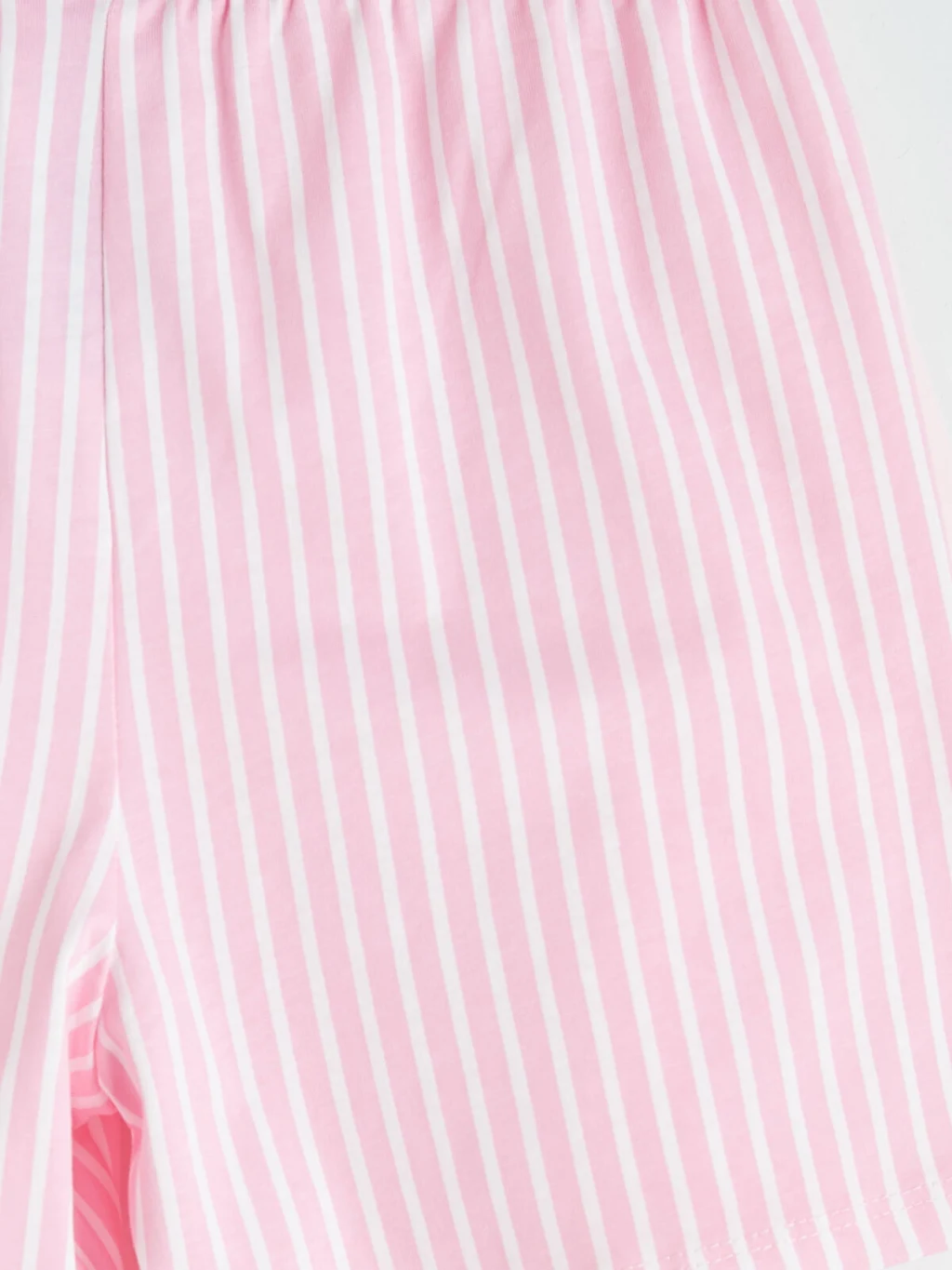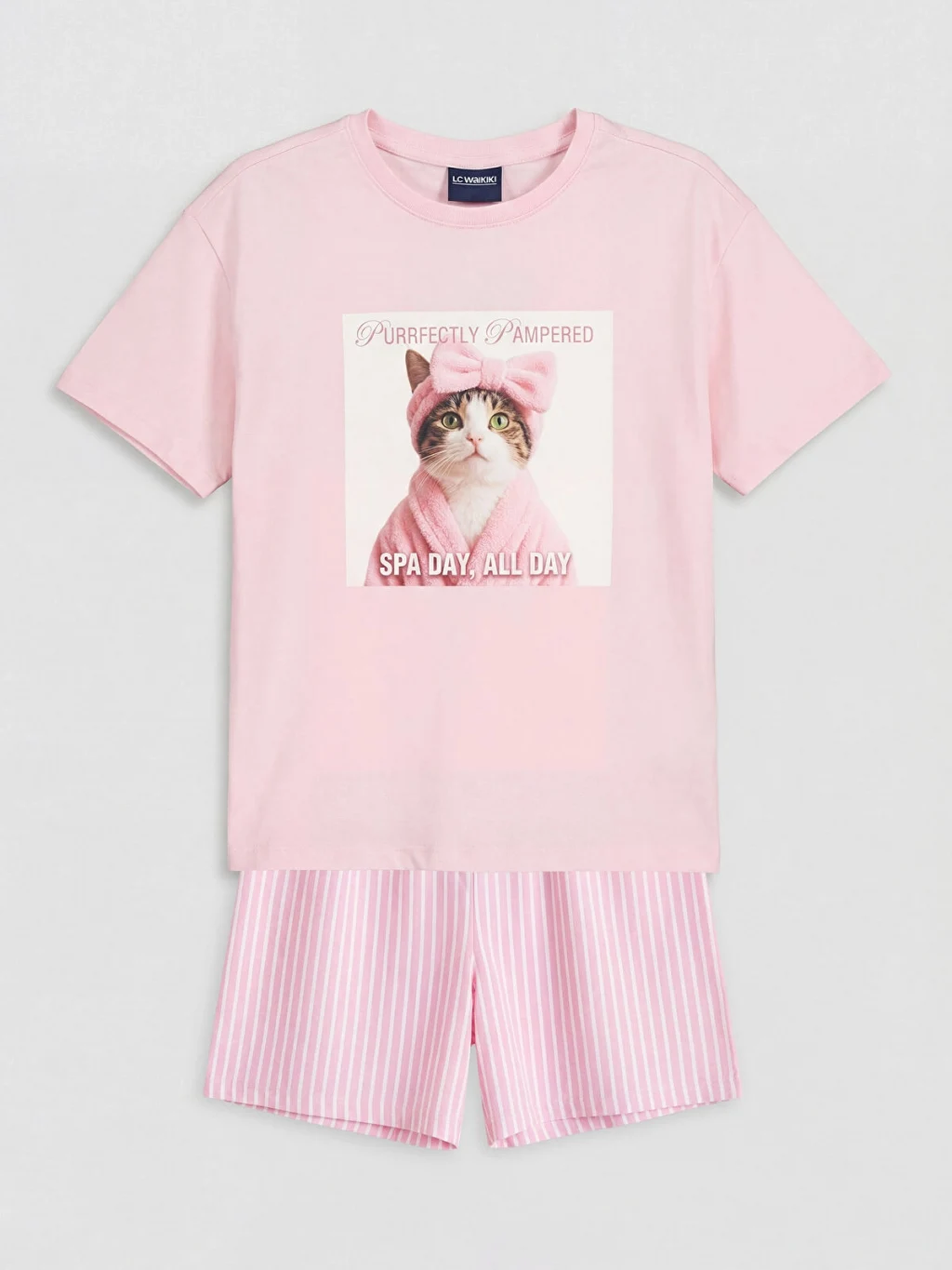 Kız çocuk pijama takımı, %100 pamuk penye kumaştan üretilmiştir. Bisiklet yaka, kısa kollu, baskılı tişört ve çizgili şorttan oluşur.