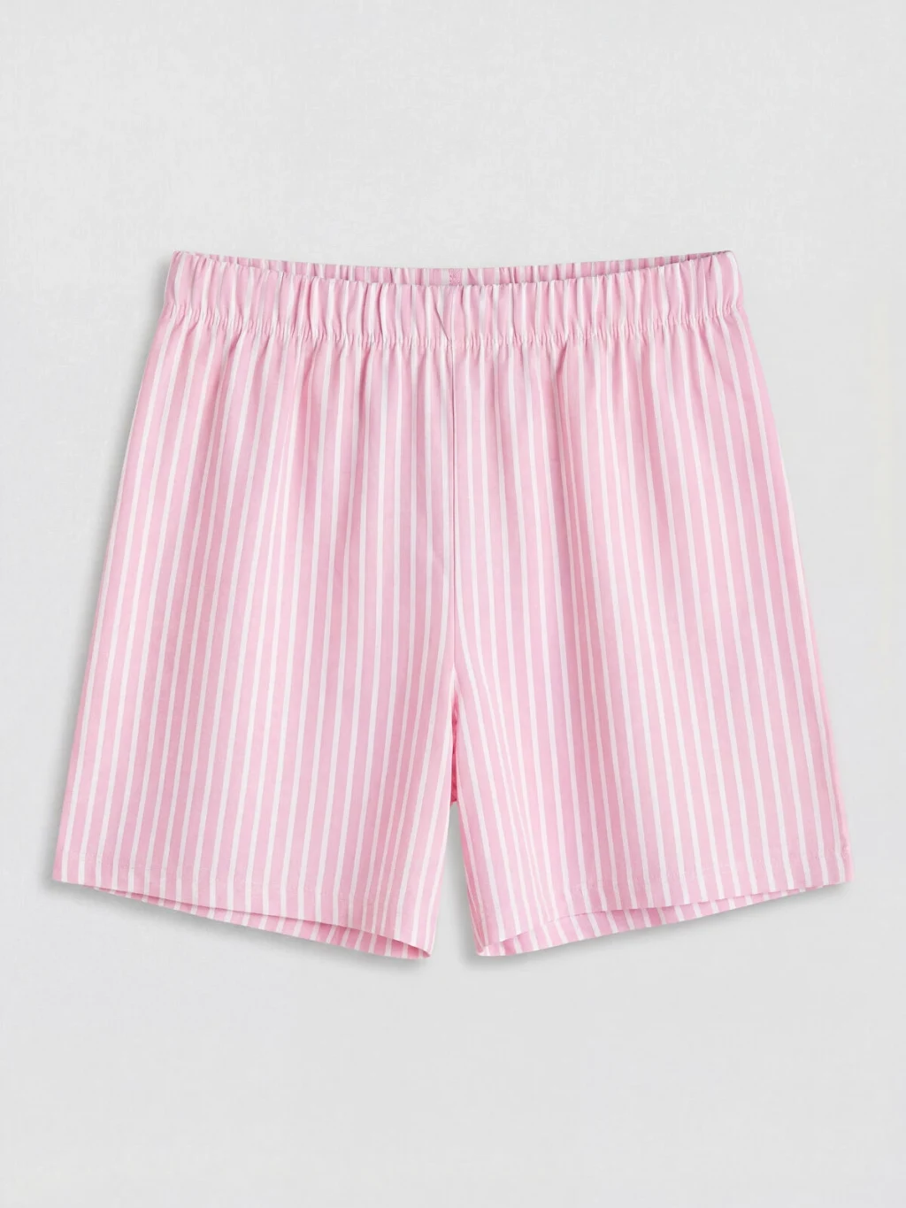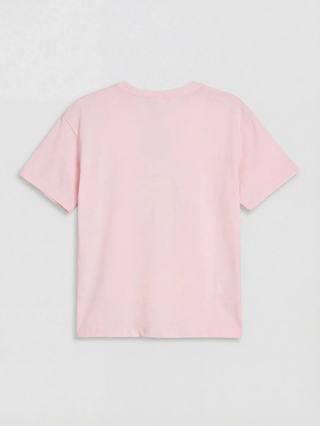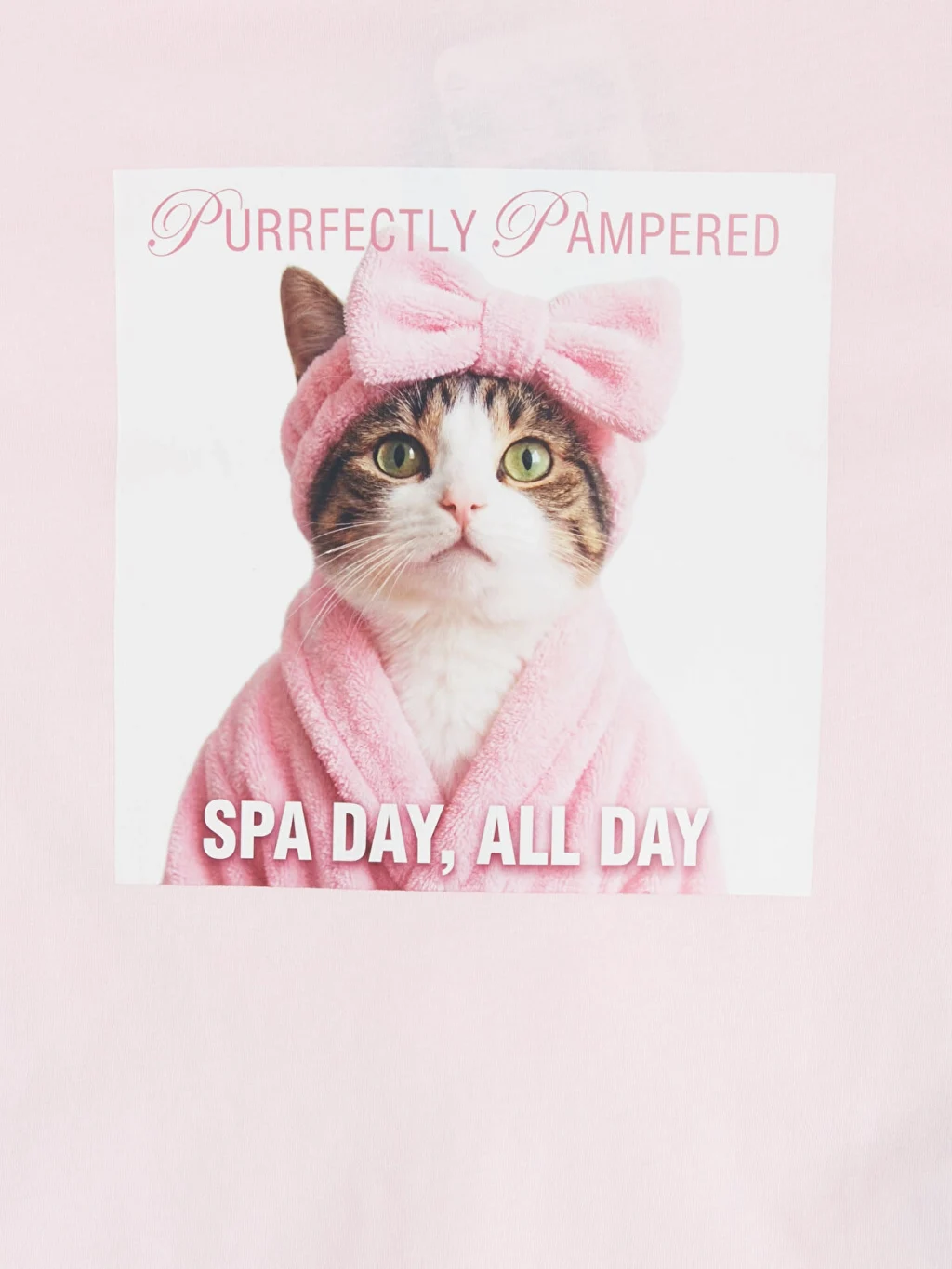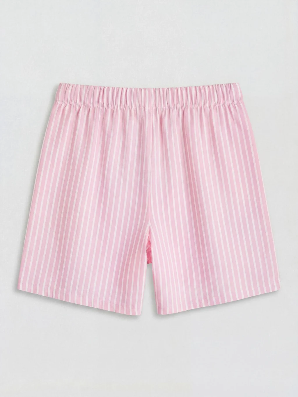 Kız çocuk pijama takımı, %100 pamuk penye kumaştan üretilmiştir. Bisiklet yaka, kısa kollu, baskılı tişört ve çizgili şorttan oluşur.