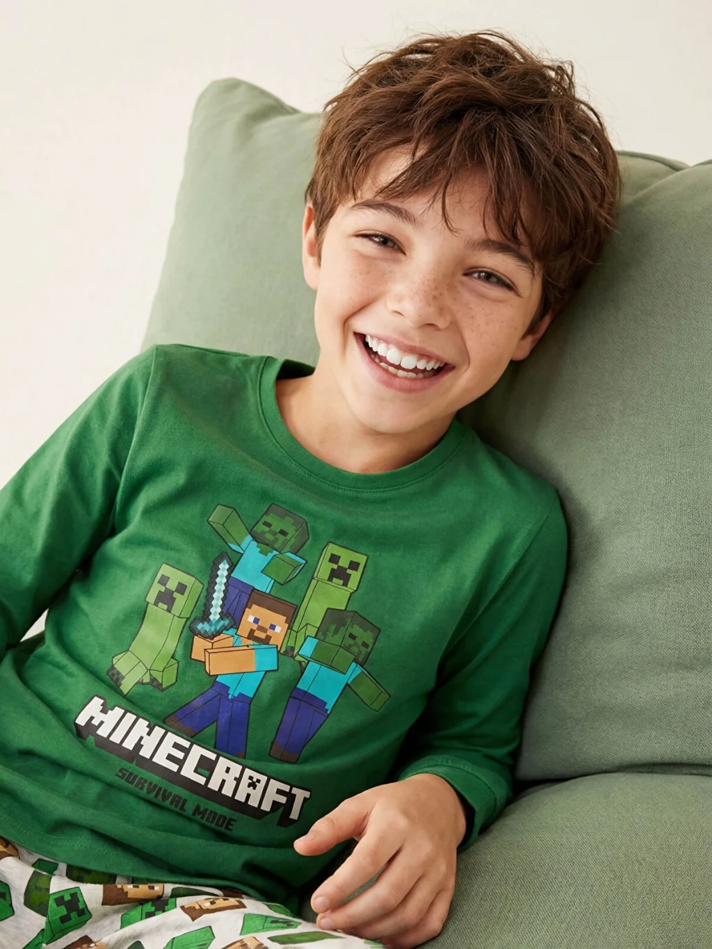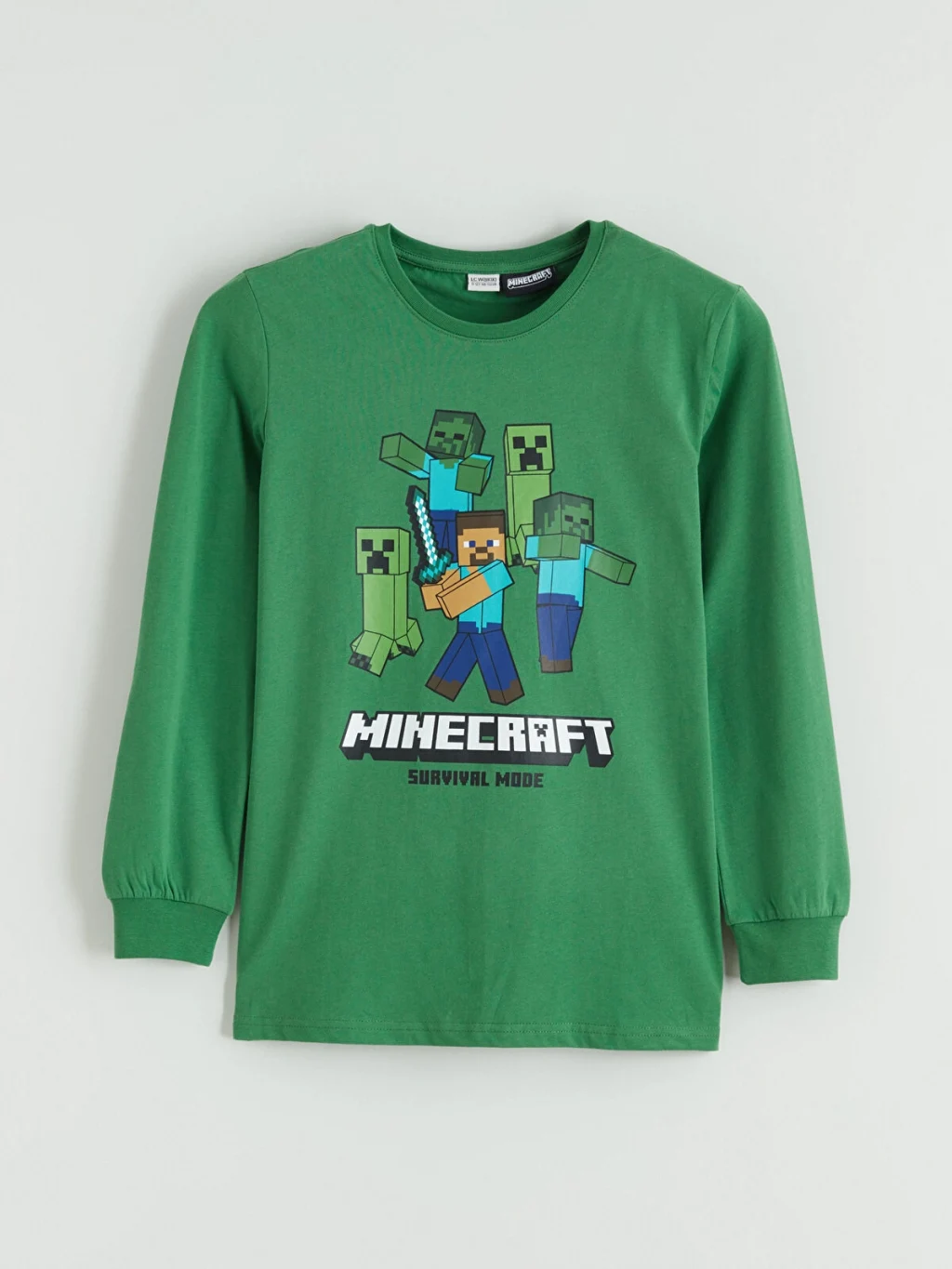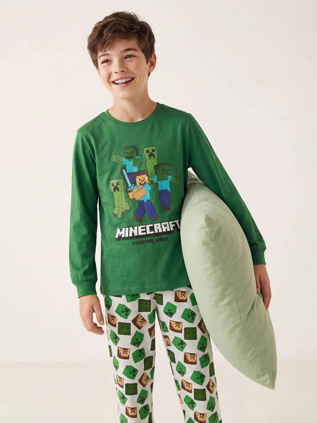 Minecraft lisanslı erkek çocuk pijama takımı, yüksek pamuk içerikli kumaştan üretilmiştir. Bisiklet yaka ve uzun kollu üst parçası baskılıdır.