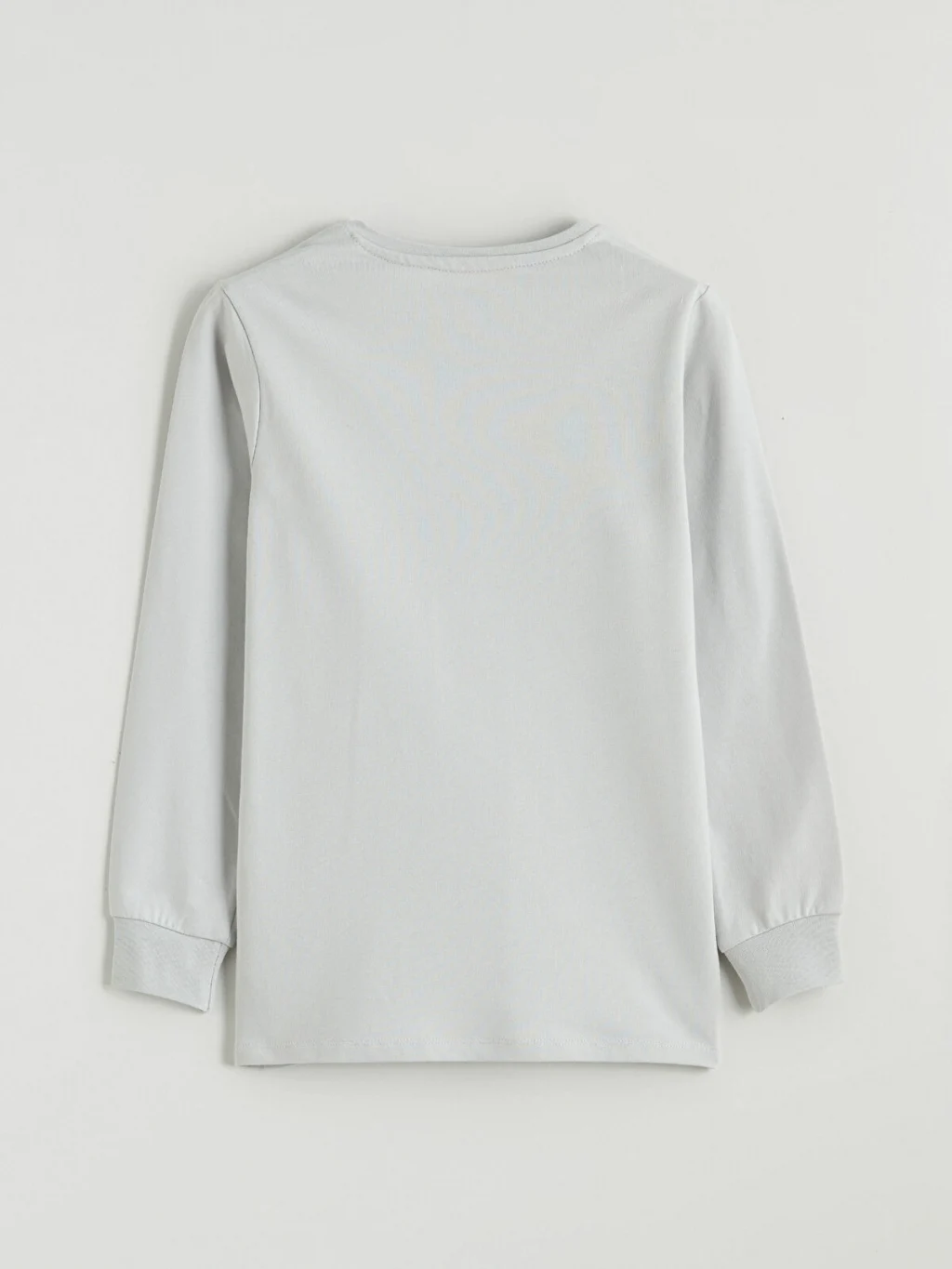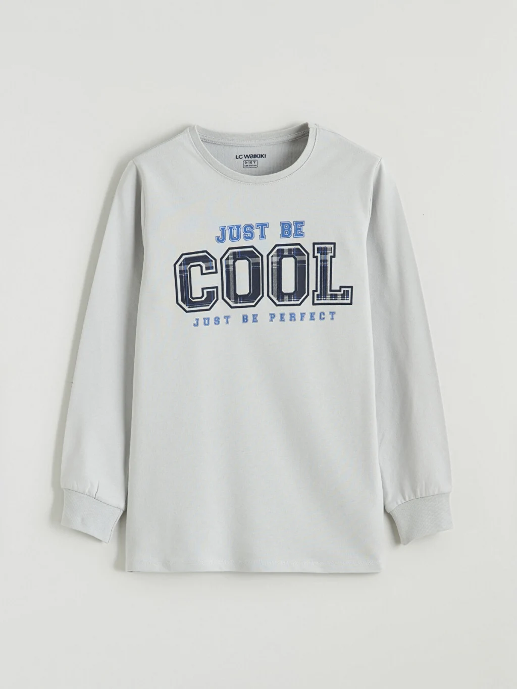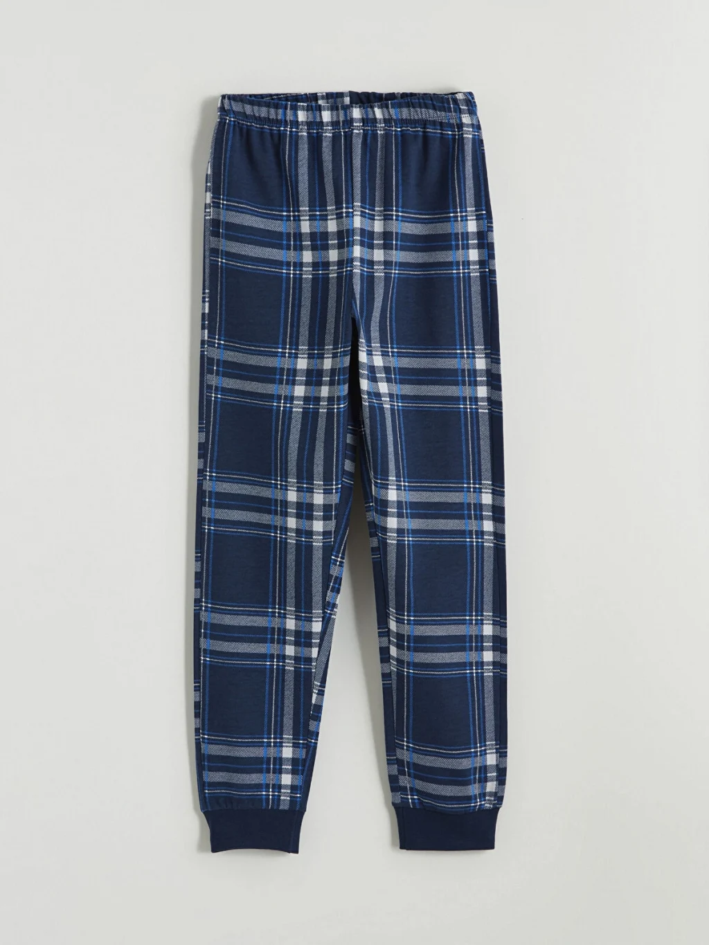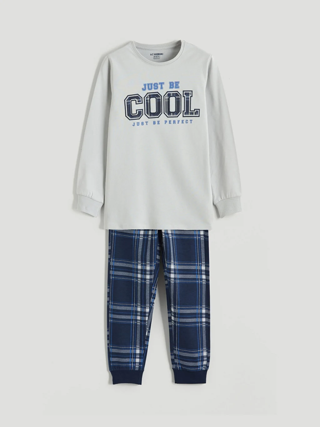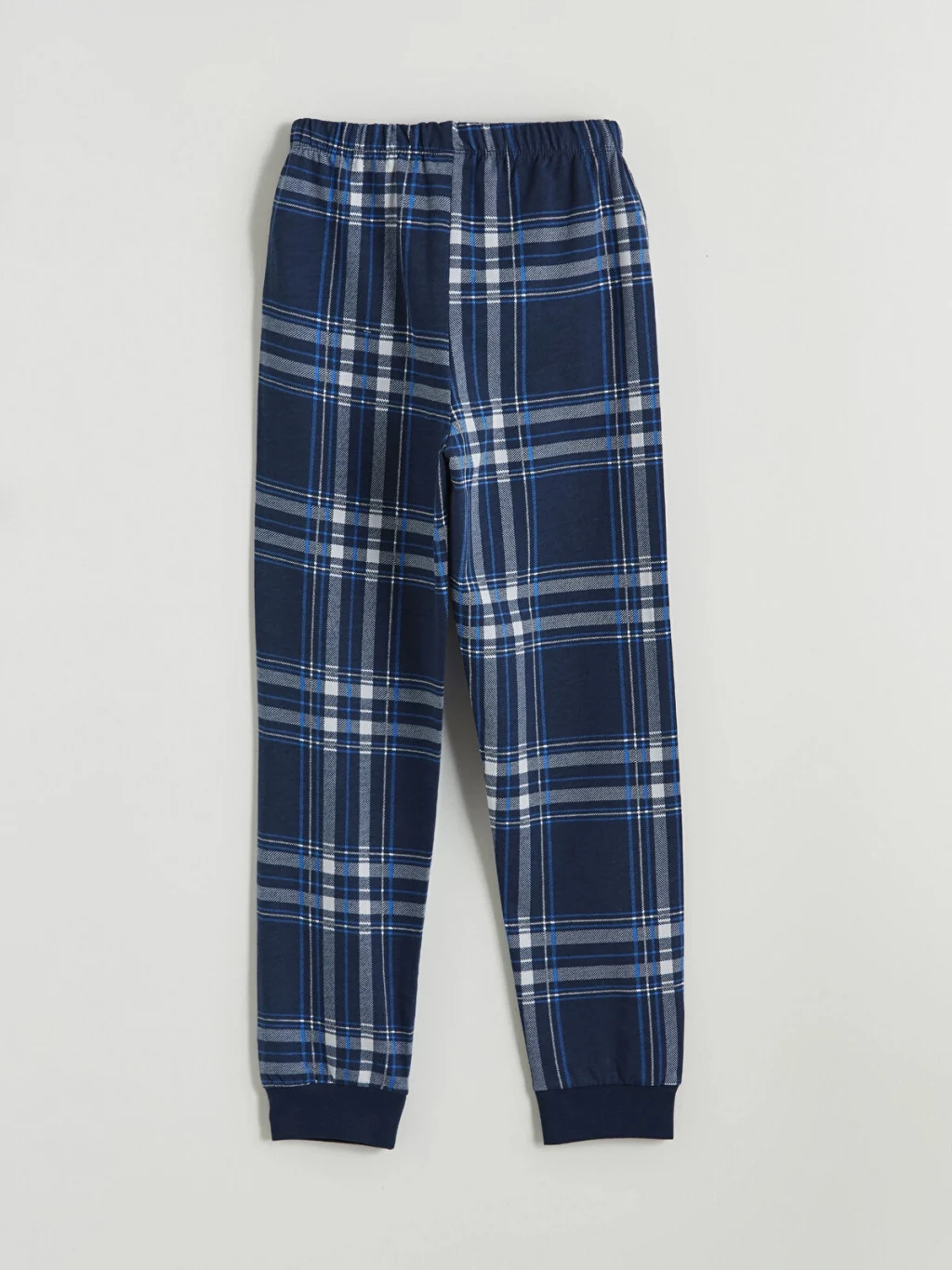 Erkek çocuk pijama takımı, bisiklet yaka, uzun kollu, baskılı üst ve ekose desenli, paçaları ribanalı alttan oluşur. %100 pamuklu kumaşa sahiptir.