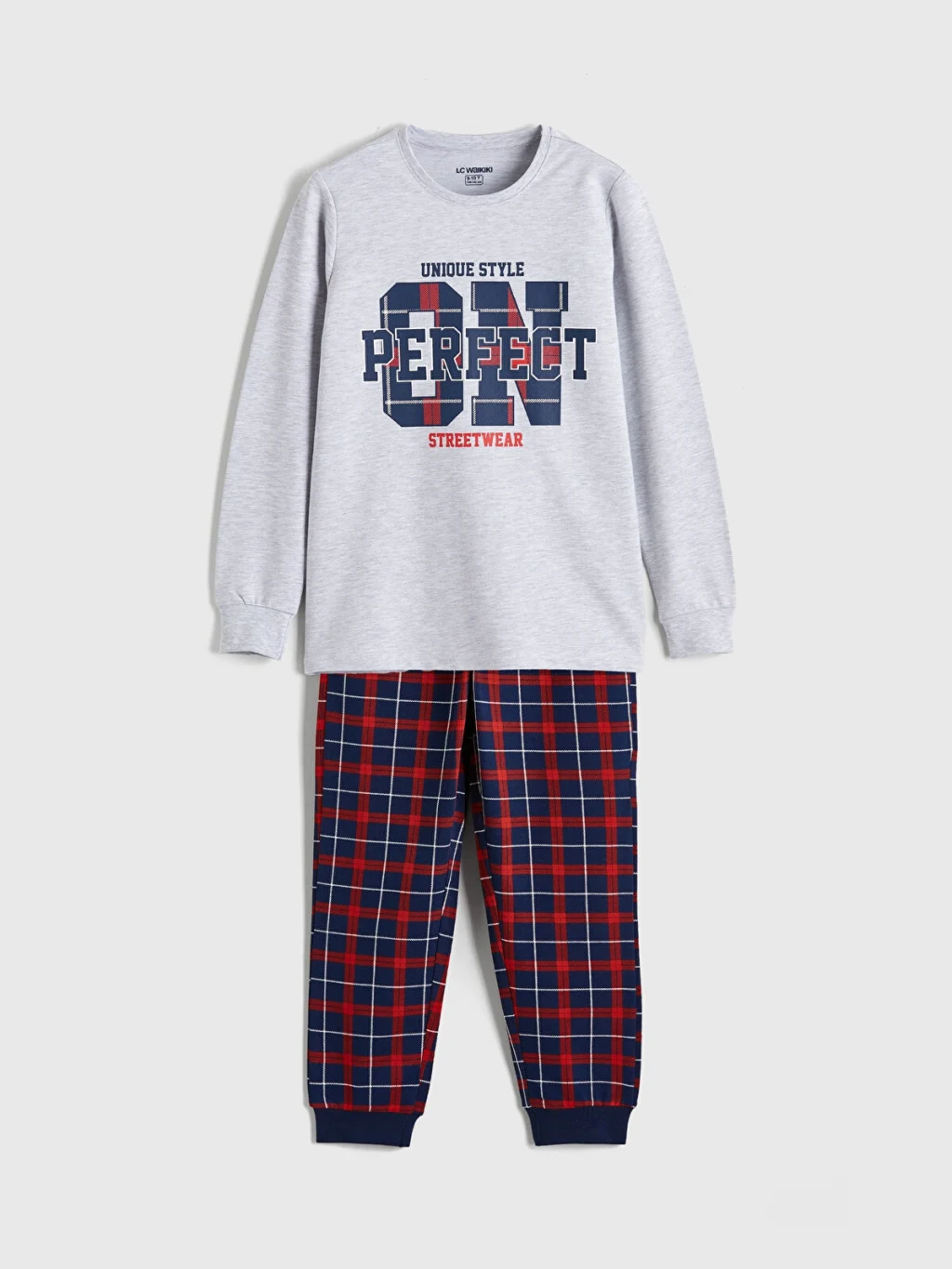 Bisiklet yaka ve uzun kollu üst ile kareli desenli, paçaları ribanalı alttan oluşan erkek çocuk pijama takımı, %100 pamuklu kumaştan üretilmiştir.