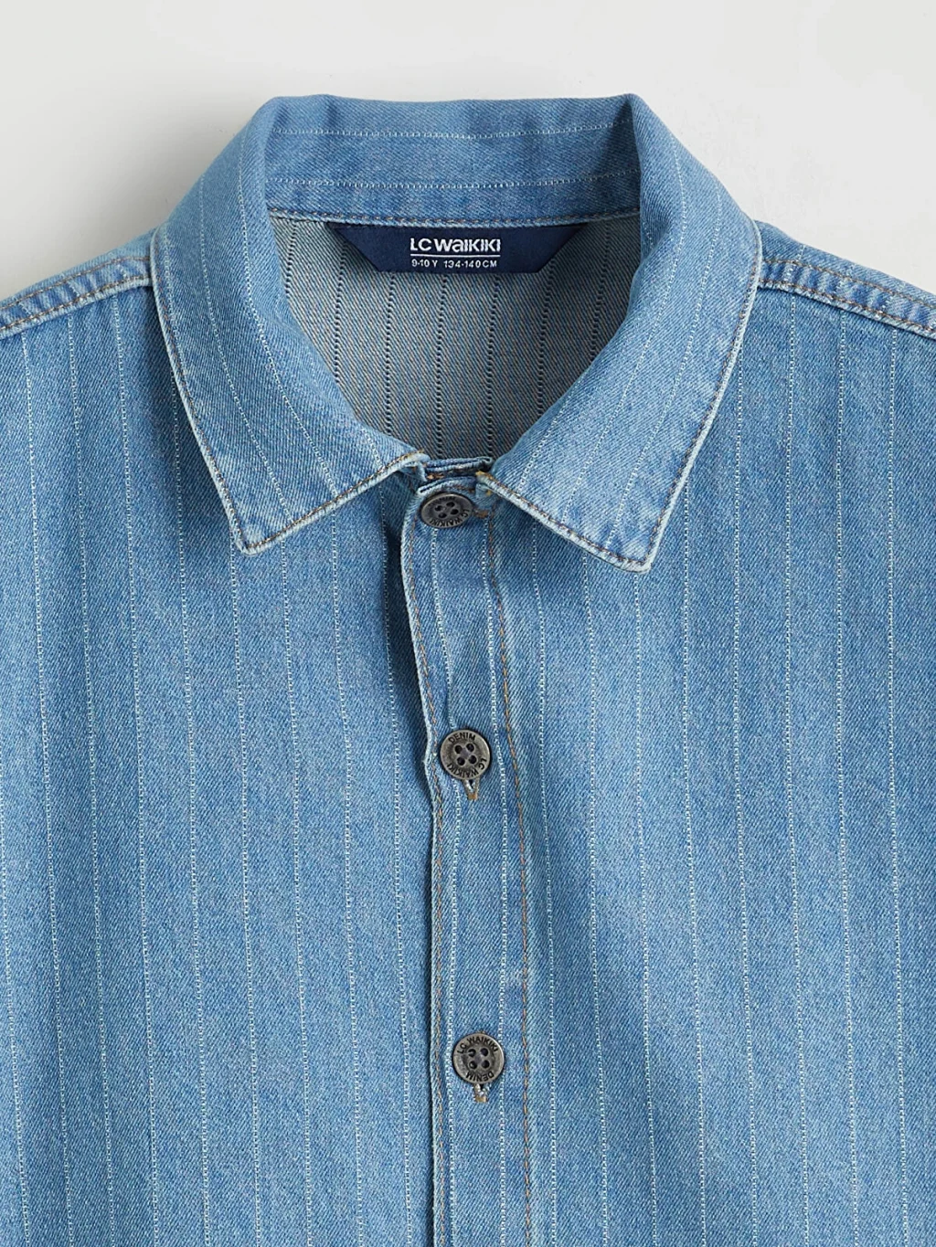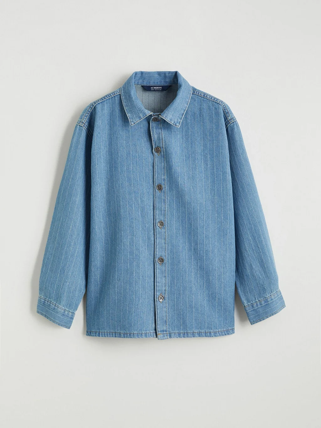 Çizgili desenli, uzun kollu erkek çocuk gömlek, %100 pamuklu denim kumaştan üretilmiştir ve önden düğme kapamalıdır.