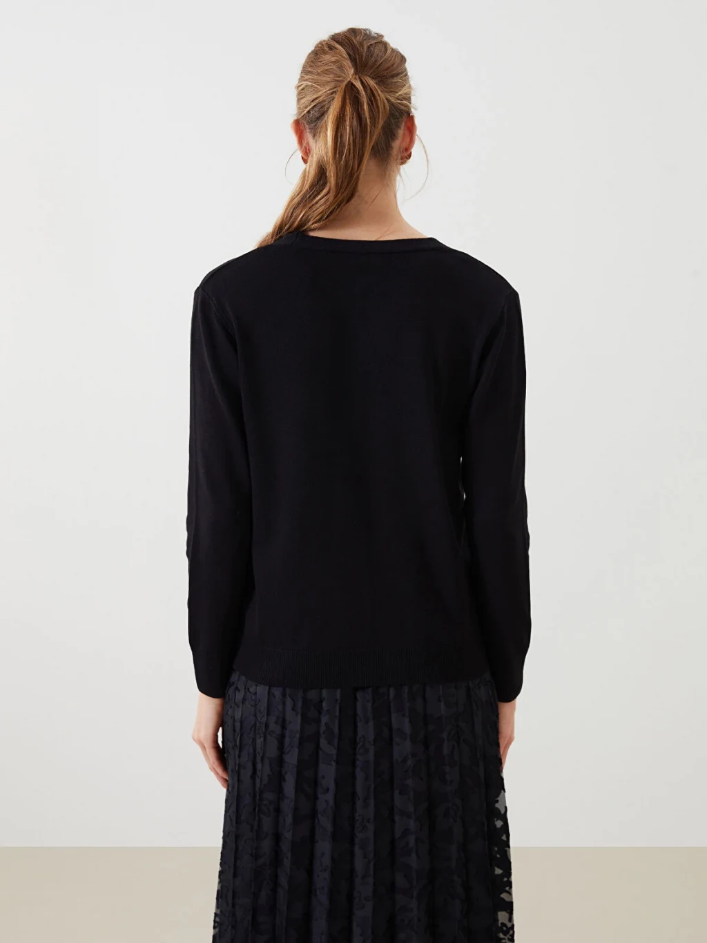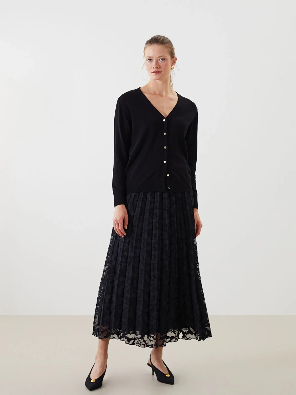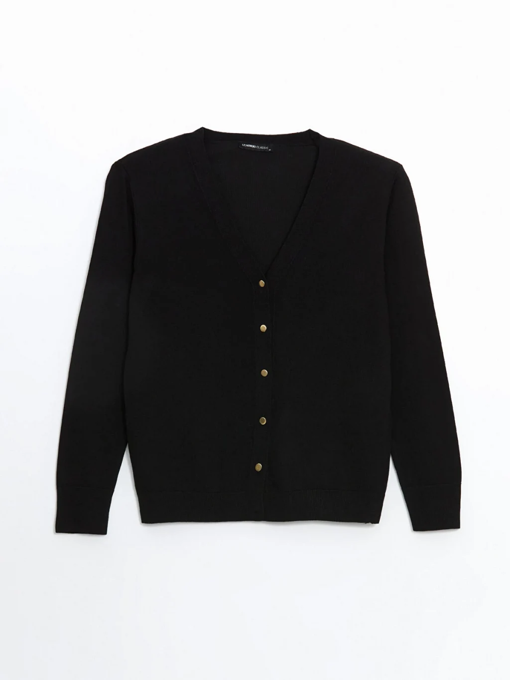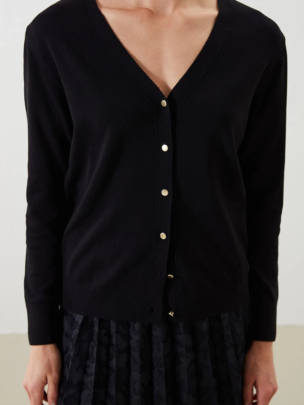 V yaka düz uzun kollu hırka, triko kumaştan üretilmiştir. Bilek ve alt kısmındaki ribanalı detayı, hırkanın daha zarif görünmesini sağlar ve soğuk havayı engeller. Önden düğme kapamalı tasarımı ile pratik ve kolay kullanım sağlar.