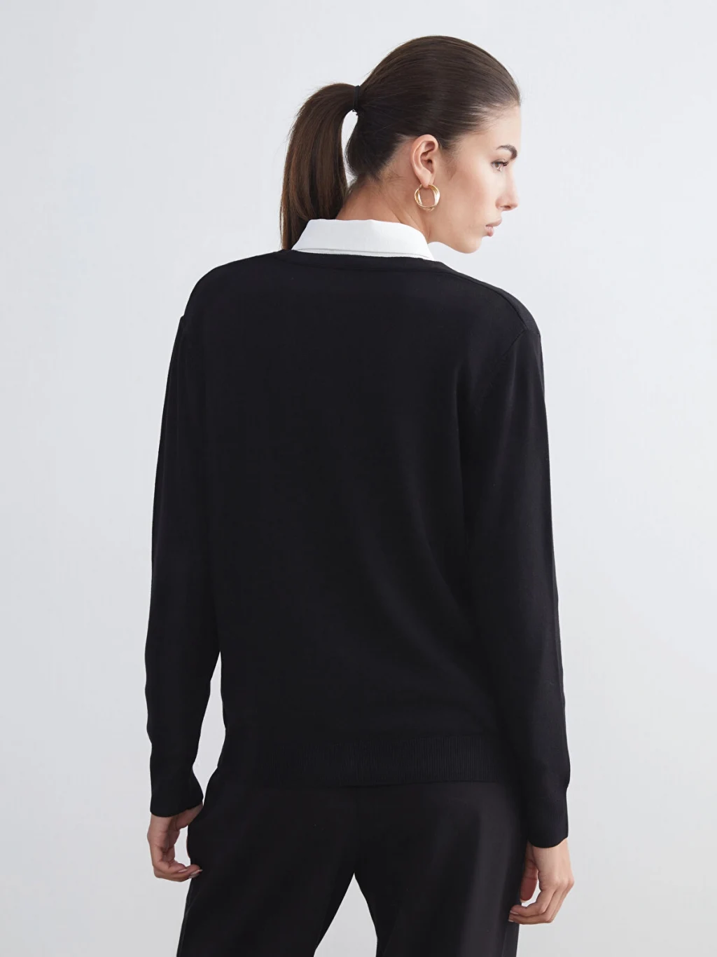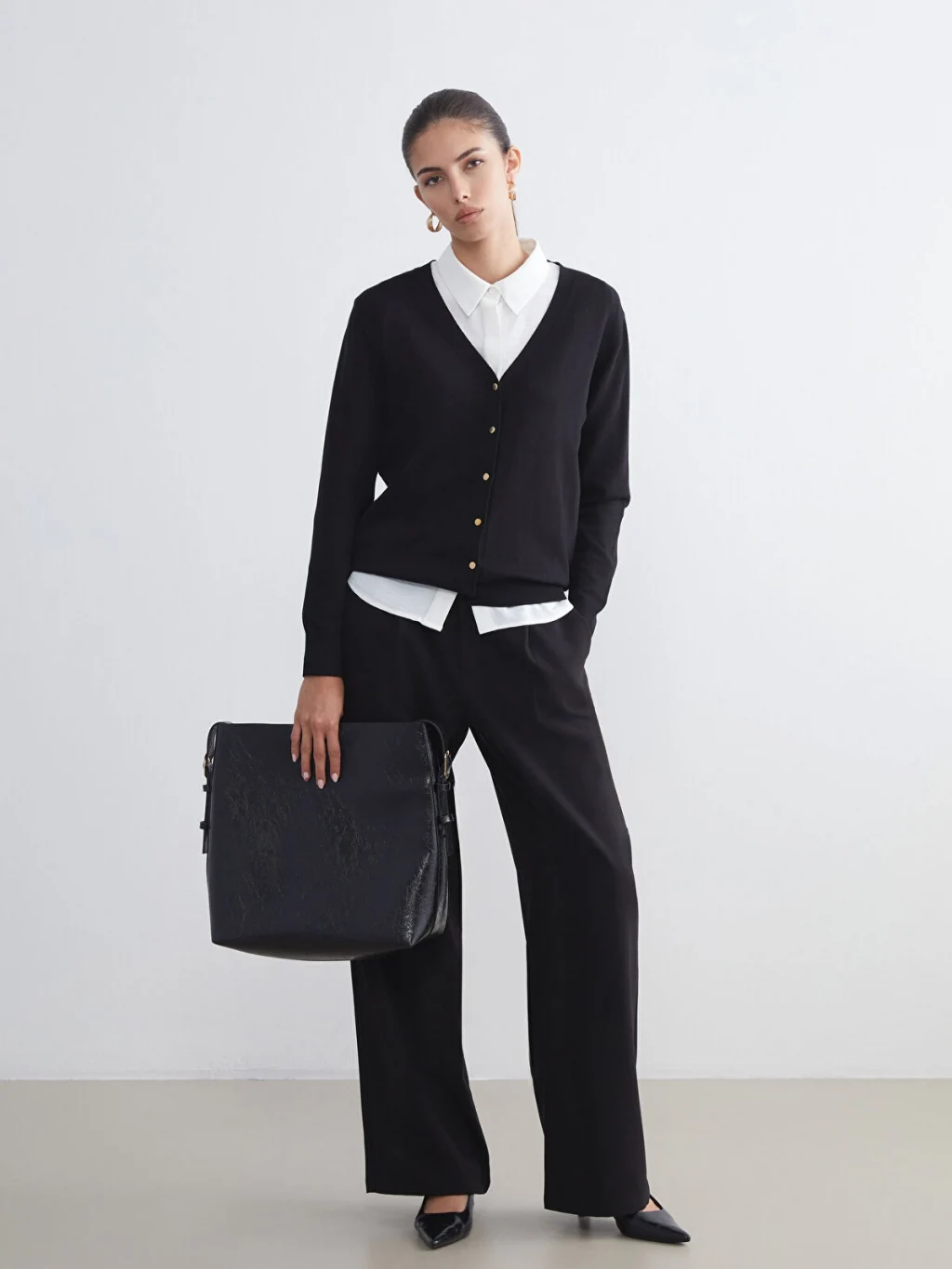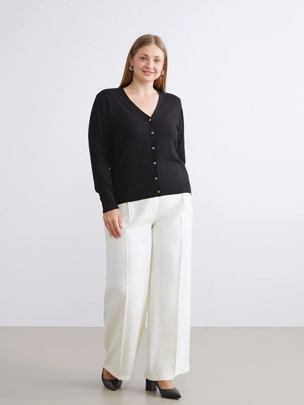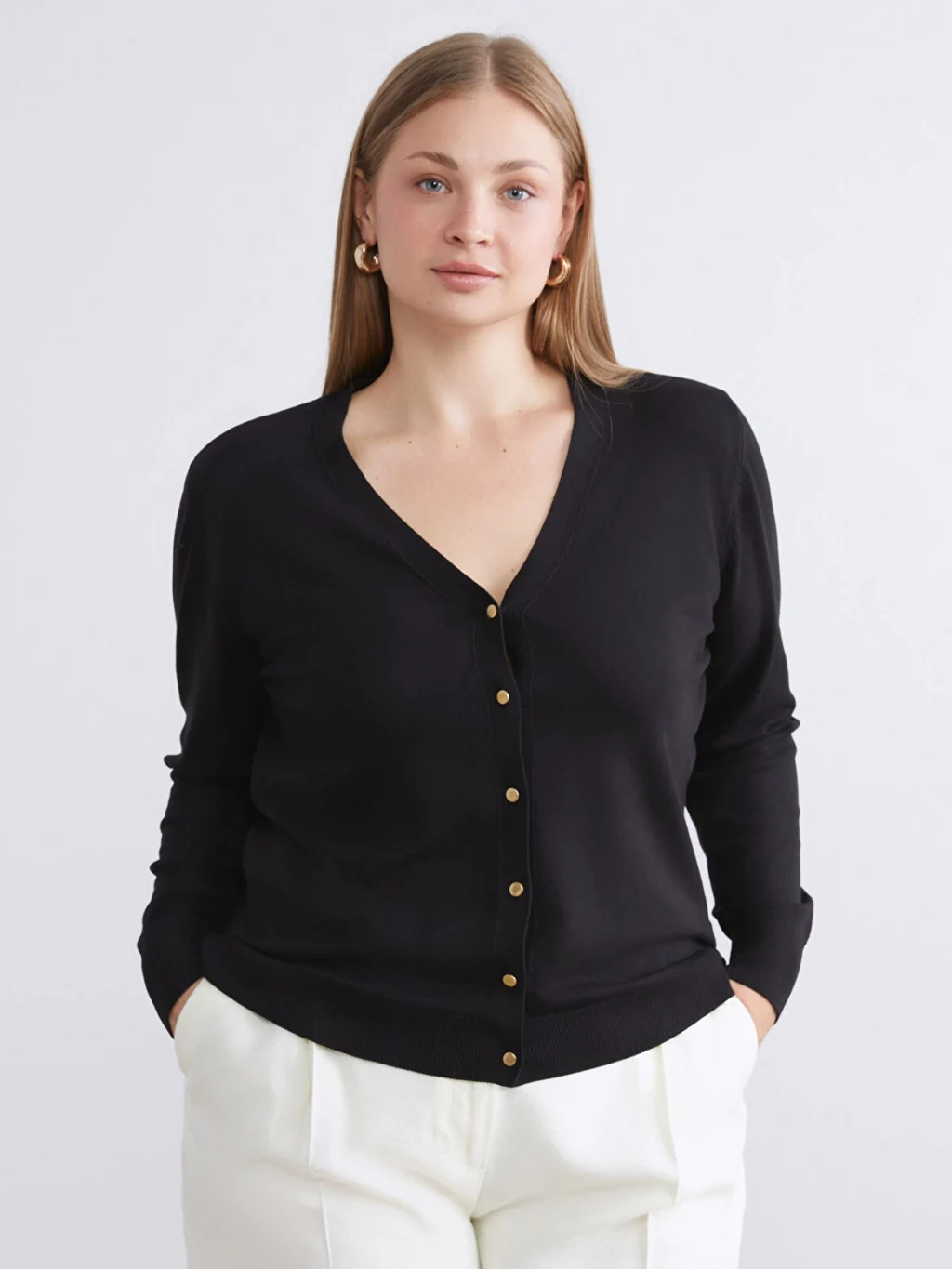 V yaka düz uzun kollu hırka, triko kumaştan üretilmiştir. Bu sayede sizi sıcak tutar. Önden düğme kapamalı tasarımıyla kolay giyilip çıkarılabilir ve kullanımı pratiktir.