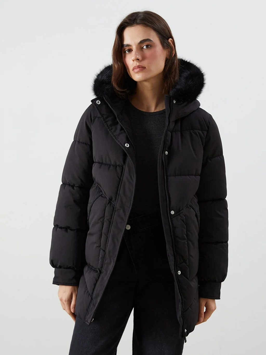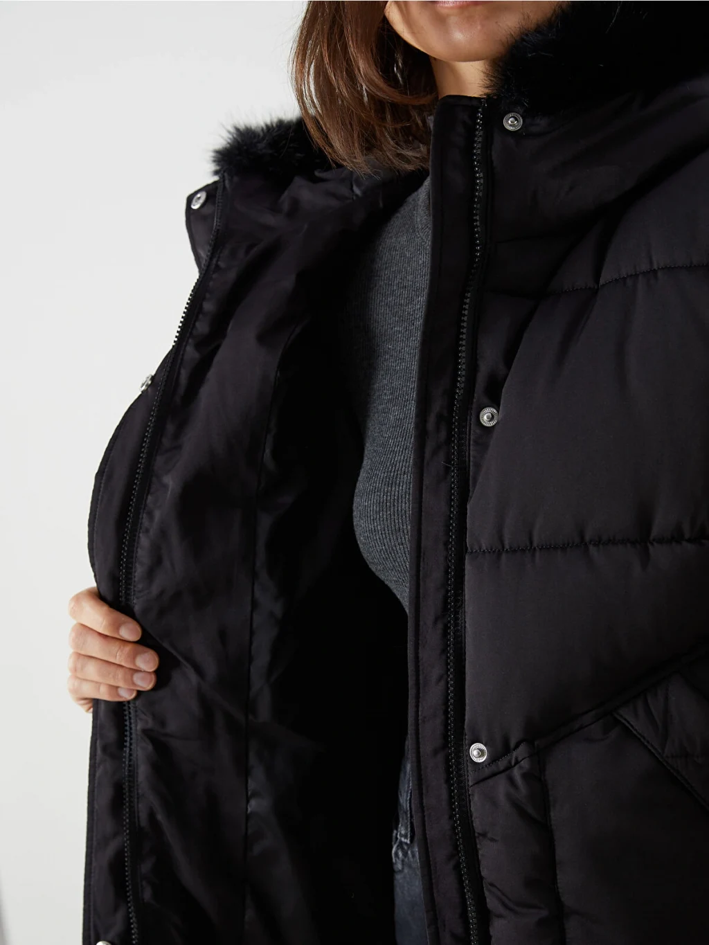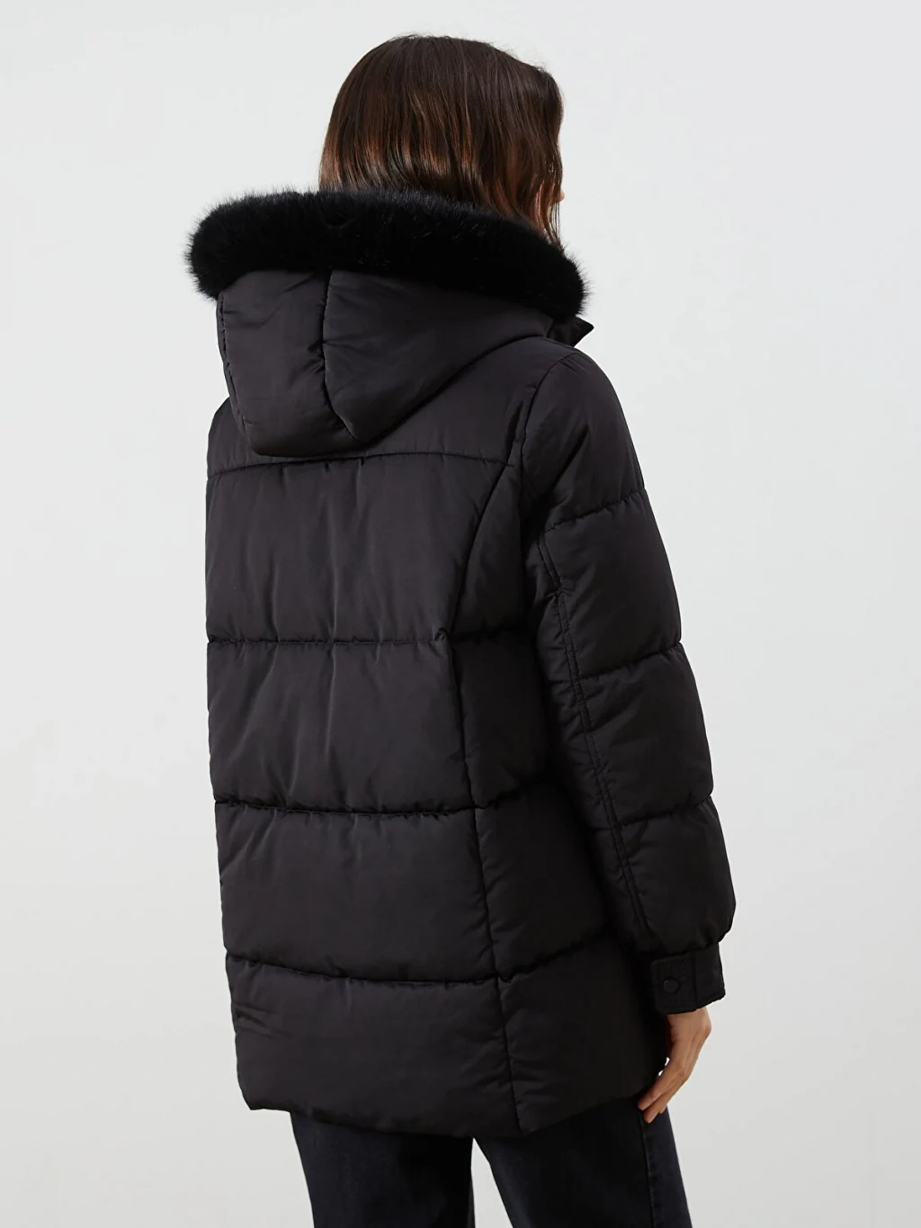 Suni kürklü sabit kapüşonlu kadın şişme mont, uzun kollu ve ribanalı manşetlidir. Önden fermuar ve çıtçıt kapamalıdır.