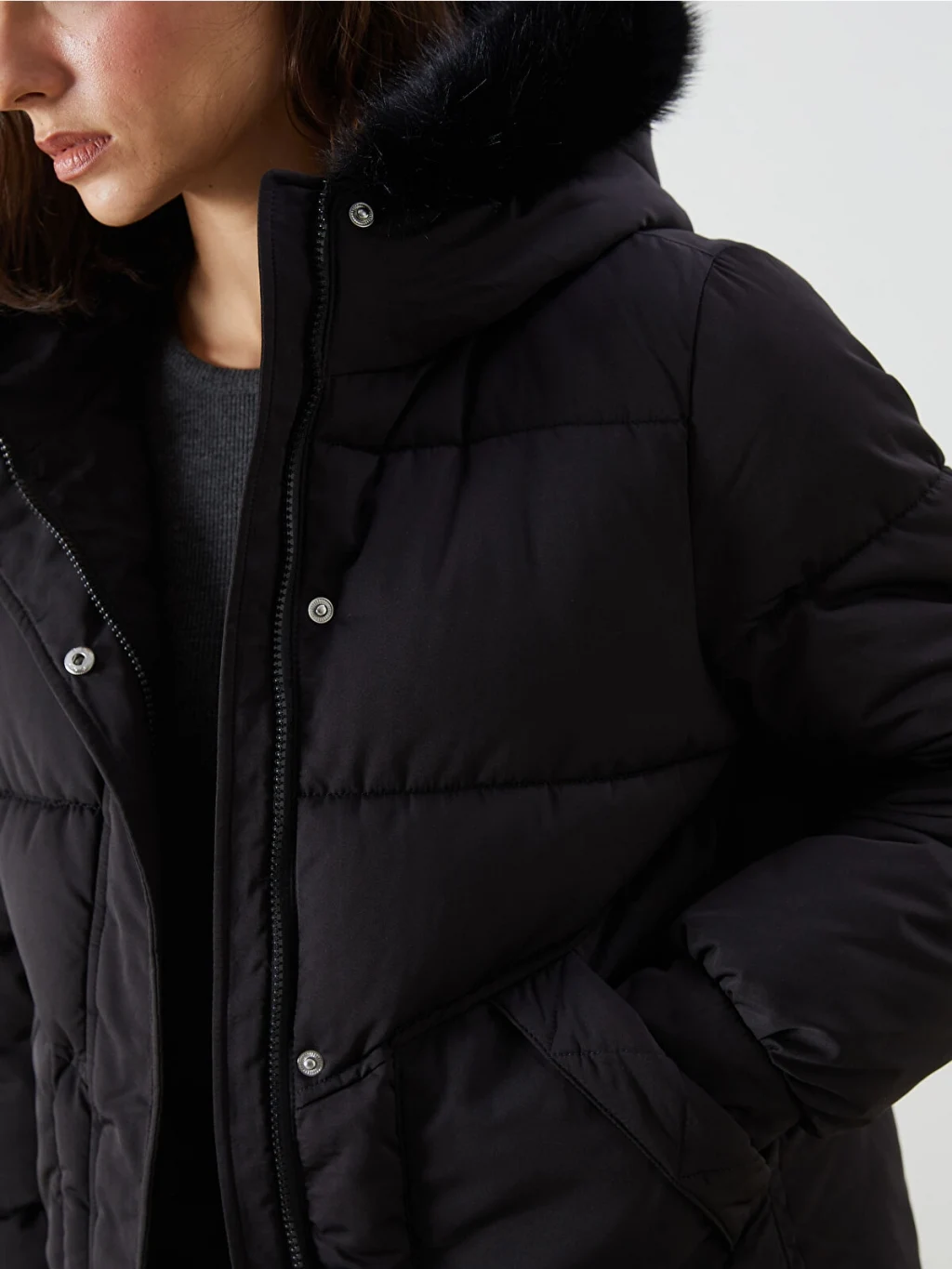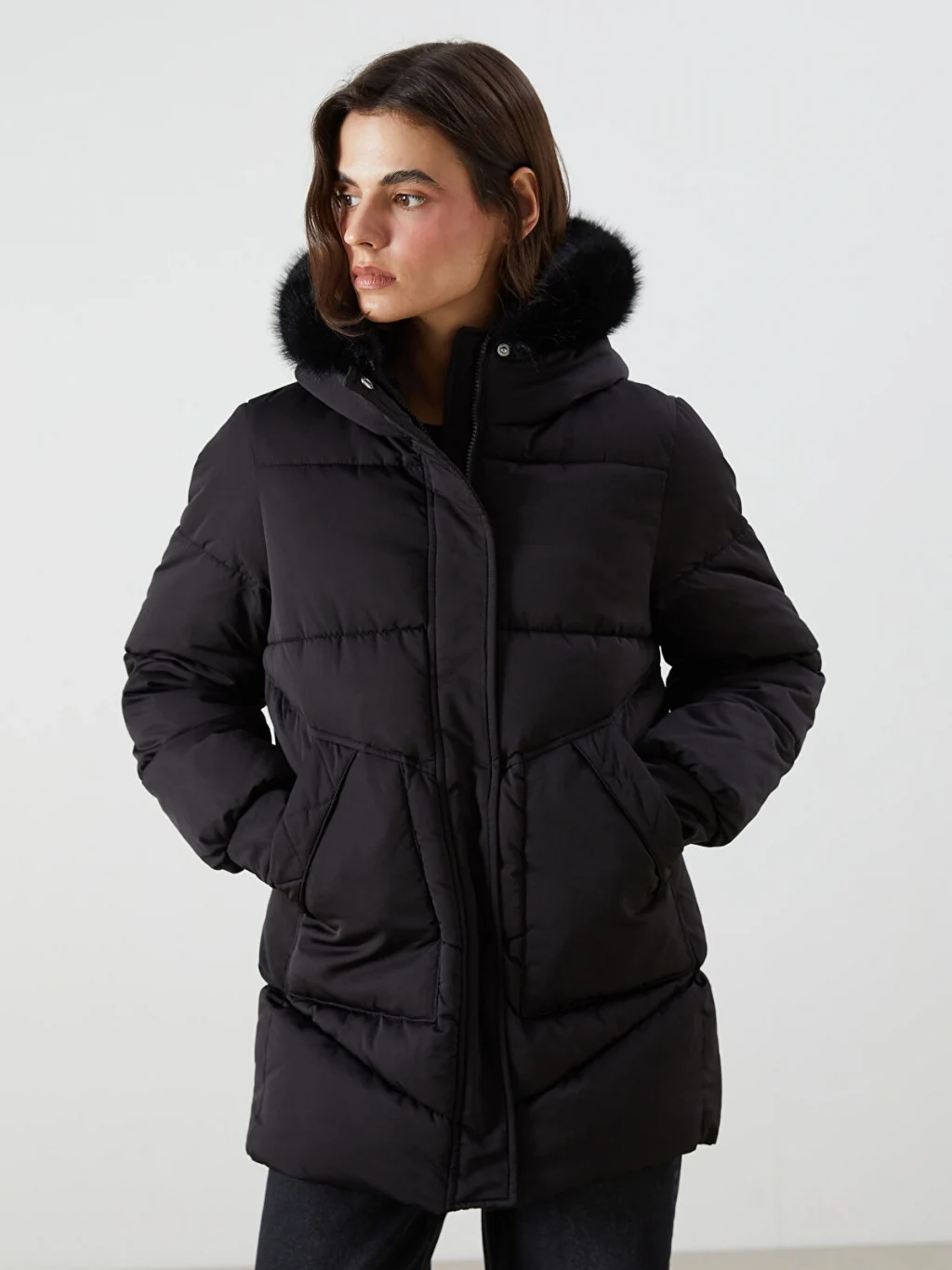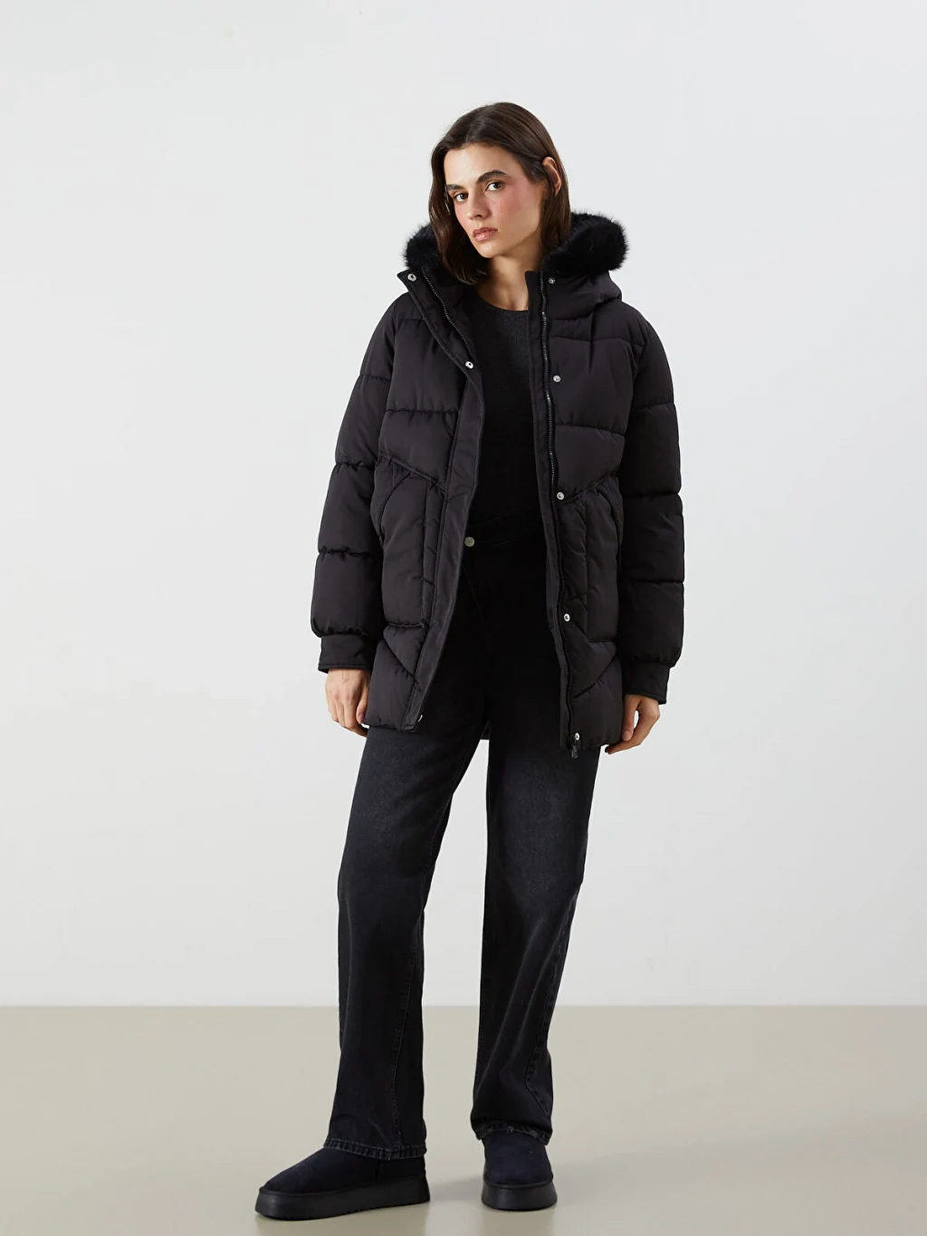 Suni kürklü sabit kapüşonlu kadın şişme mont, uzun kollu ve ribanalı manşetlidir. Önden fermuar ve çıtçıt kapamalıdır.