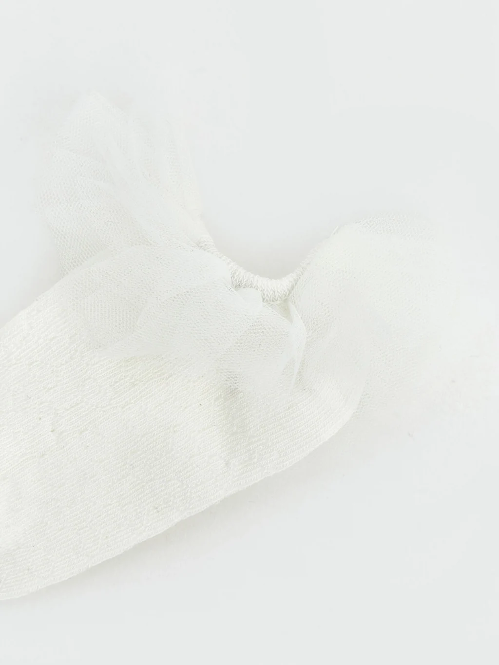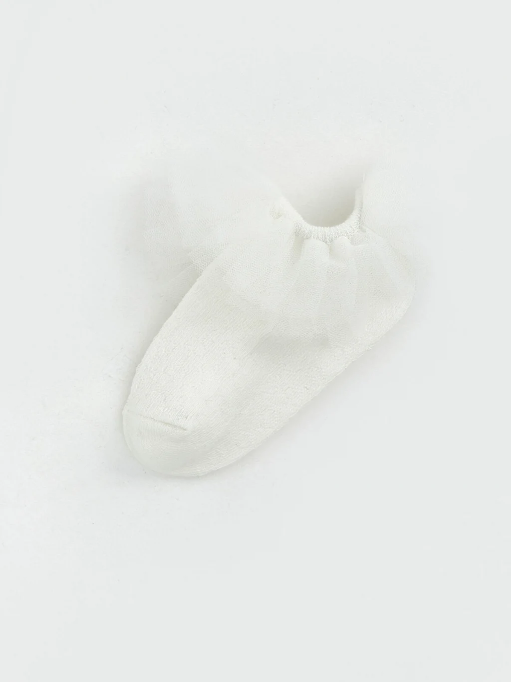 Kız bebek patik çorap, lastikli bilek kısmına sahiptir ve çevresi tül fırfır ile detaylandırılmıştır.