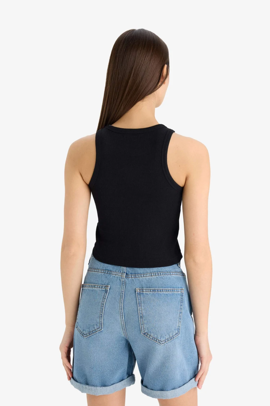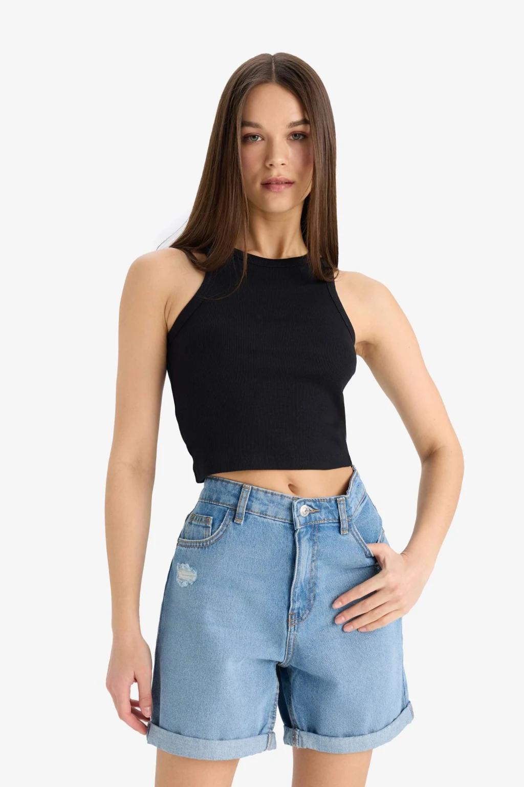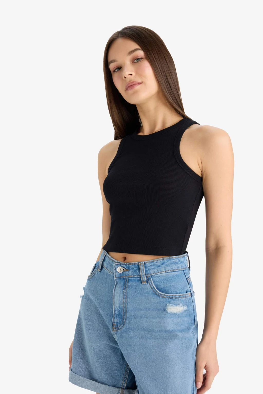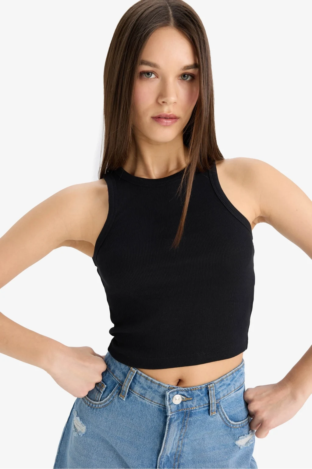 Yetişkin kadınlar için siyah halter yaka crop atlet. Fitilli kaşkorse kumaştan üretilmiş, sürdürülebilir yaz koleksiyonu. Fitted kesimi ile vücudu sararken özgürlük hissi verir. Şıklığı ve konforu bir arada sunar. Bu örme atlet, kadınların gardıroplarında vazgeçilmez olacak.