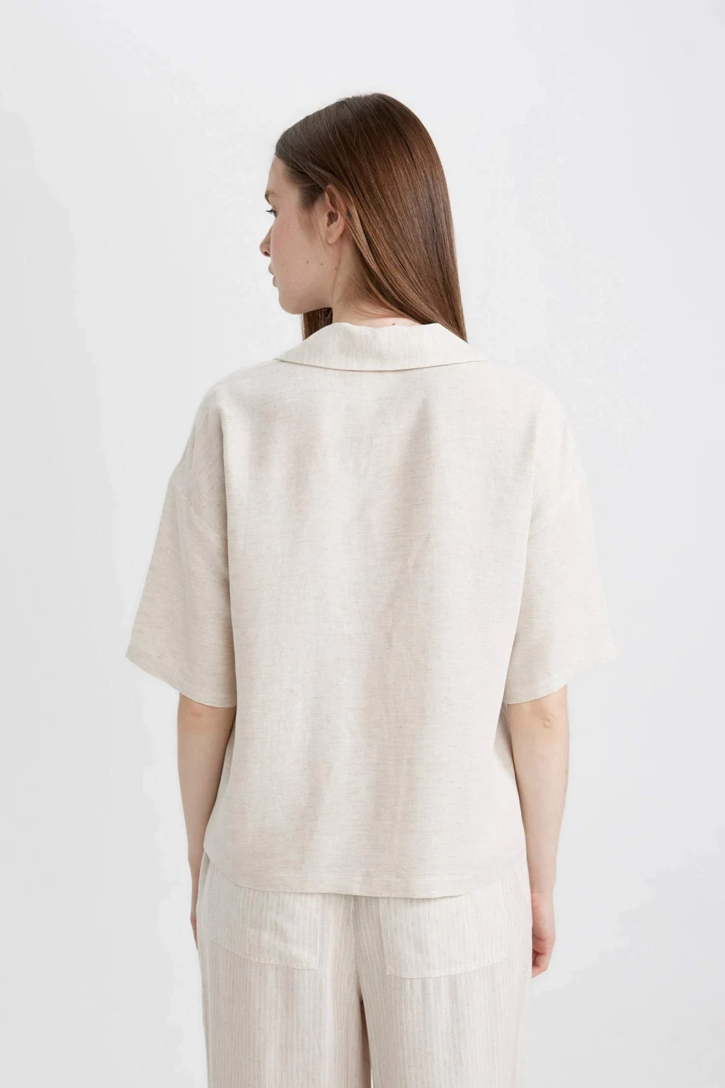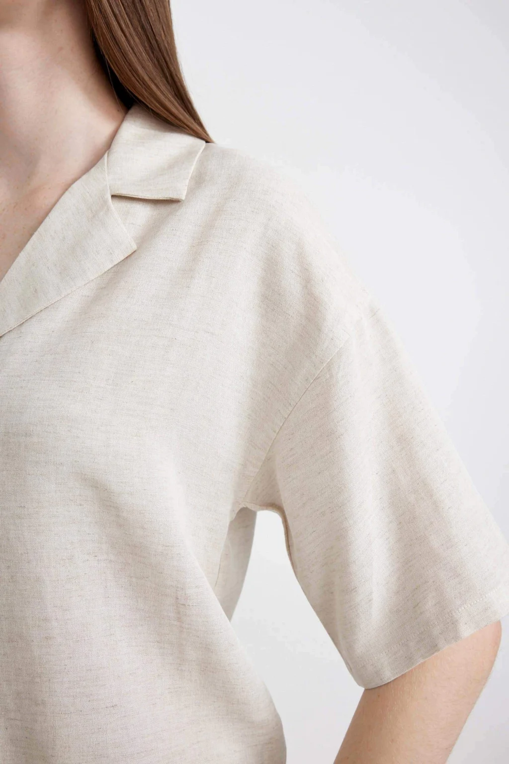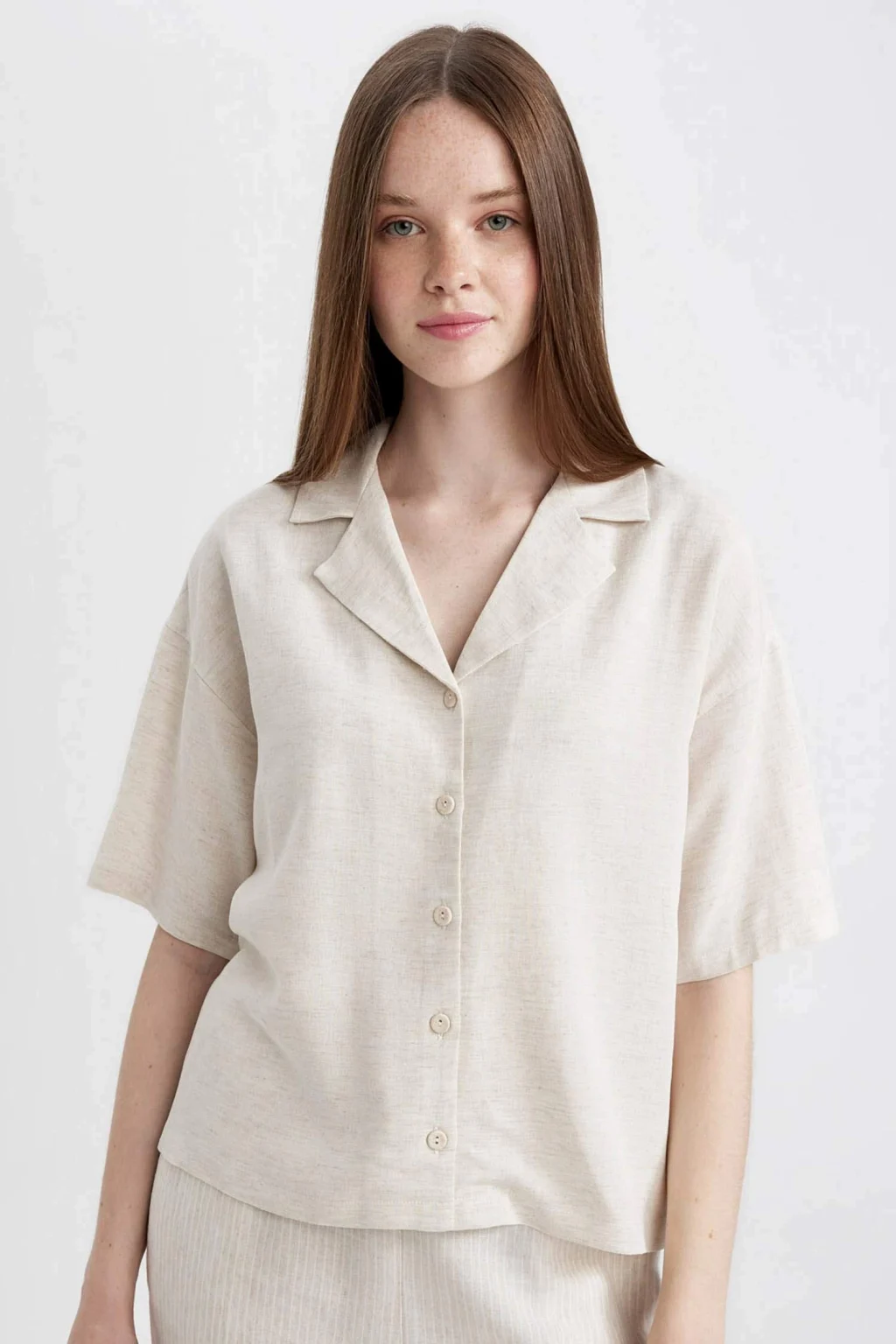 Oversize Fit Pijama Yaka Keten Karışımlı Kısa Kollu Gömlek: Rahatlığı ve şıklığı bir arada sunan oversize kesimli gömlek, keten karışımıyla öne çıkıyor. Kısa kollu tasarımıyla yaz aylarında tercih edebileceğiniz şık bir parça. Hem günlük kullanıma hem de özel günlerde kombinlenebilecek şık bir seçenek.
