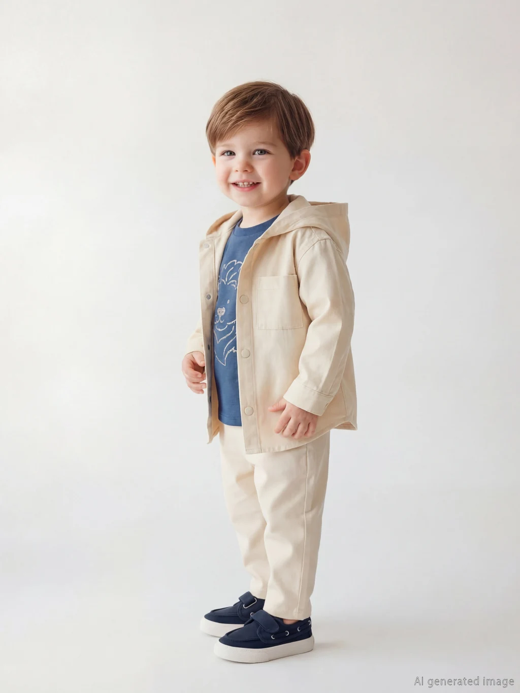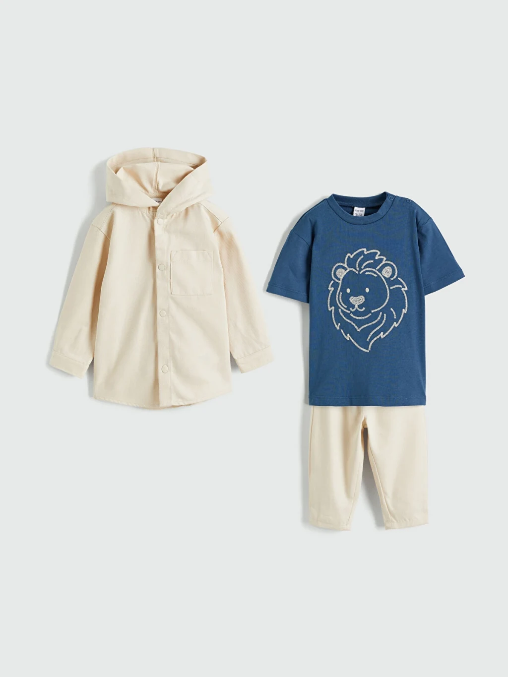 Erkek bebek 3'lü takım; kapüşonlu, uzun kollu, düğmeli gömlek, bisiklet yaka, kısa kollu, baskılı tişört ve pantolondan oluşur.