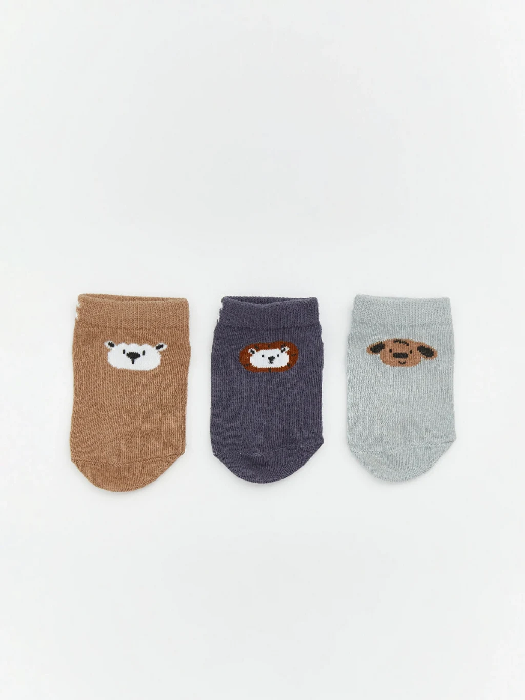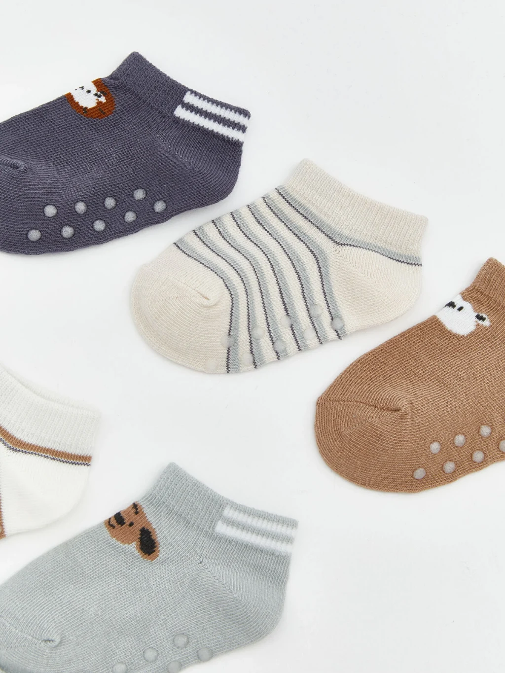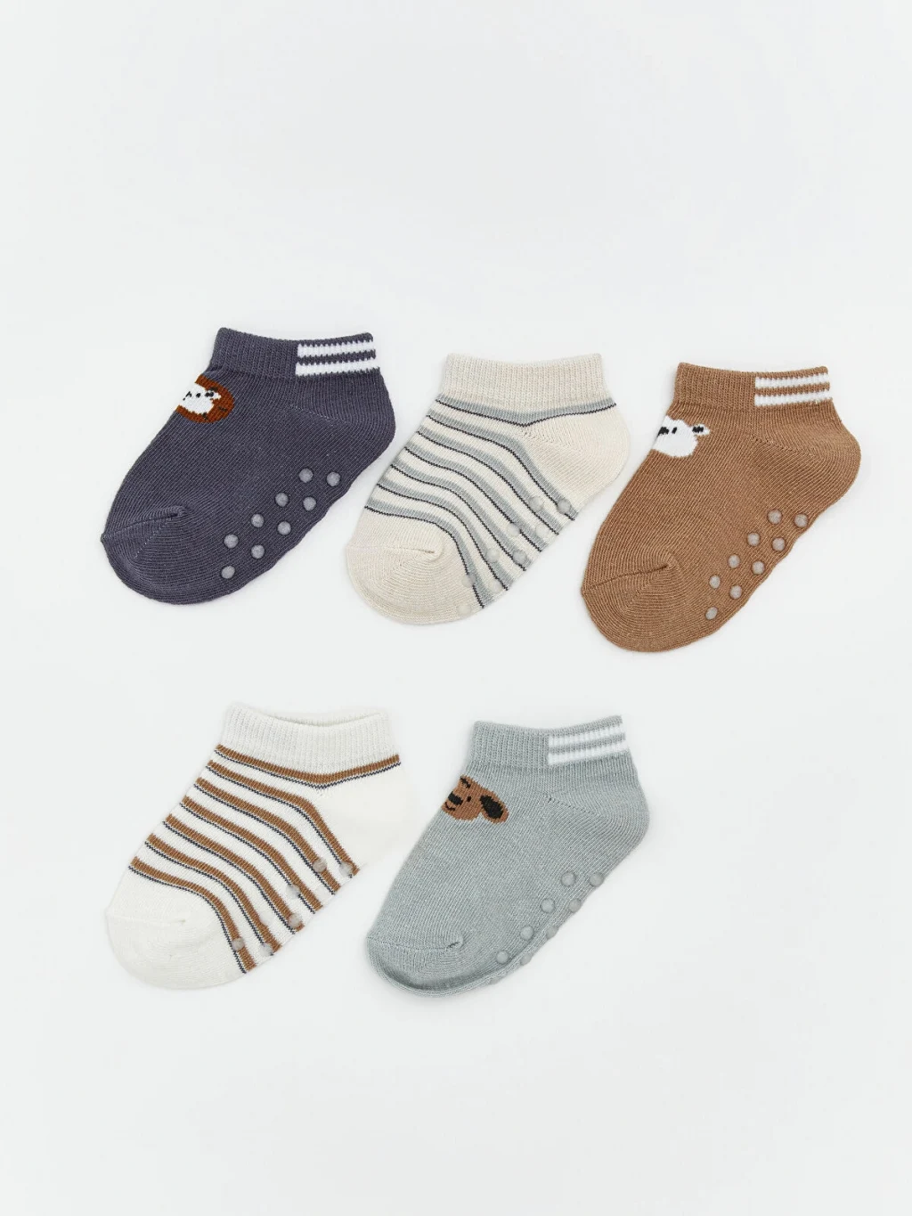 Kaydırmaz tabanlı erkek bebek patik çorap, çizgili ve hayvan figürlü desenlere ve ribanalı bilek kısmına sahiptir.