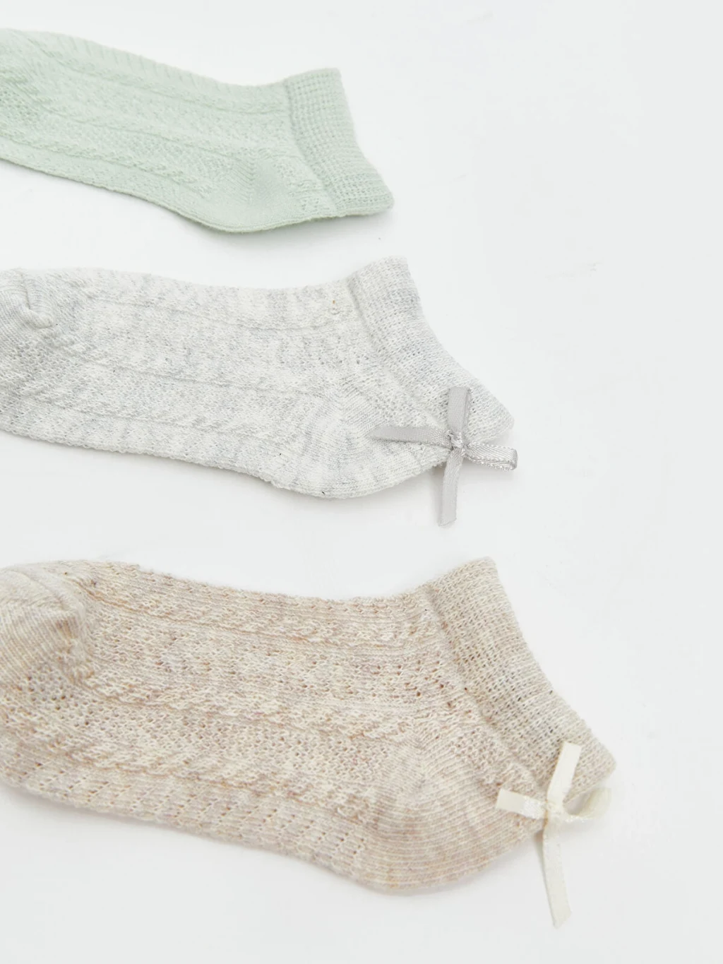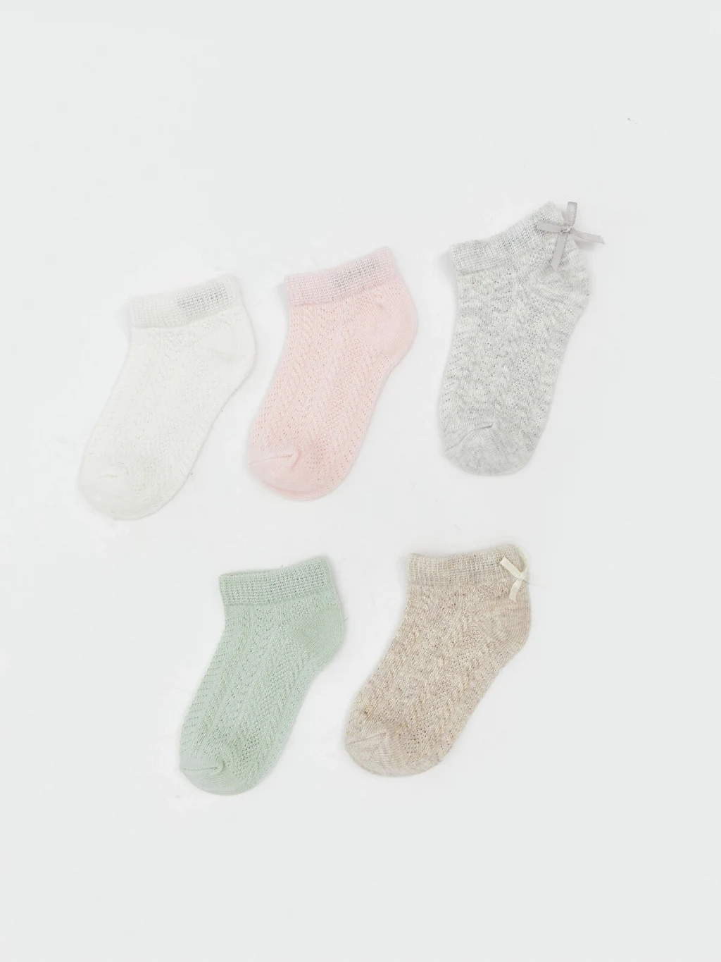 Kız bebek patik çorap, ajurlu örgü desenli olup bilek arkasında fiyonk detayı bulunur.
