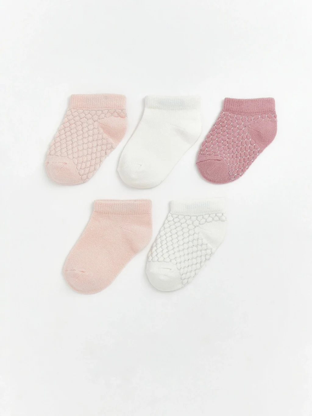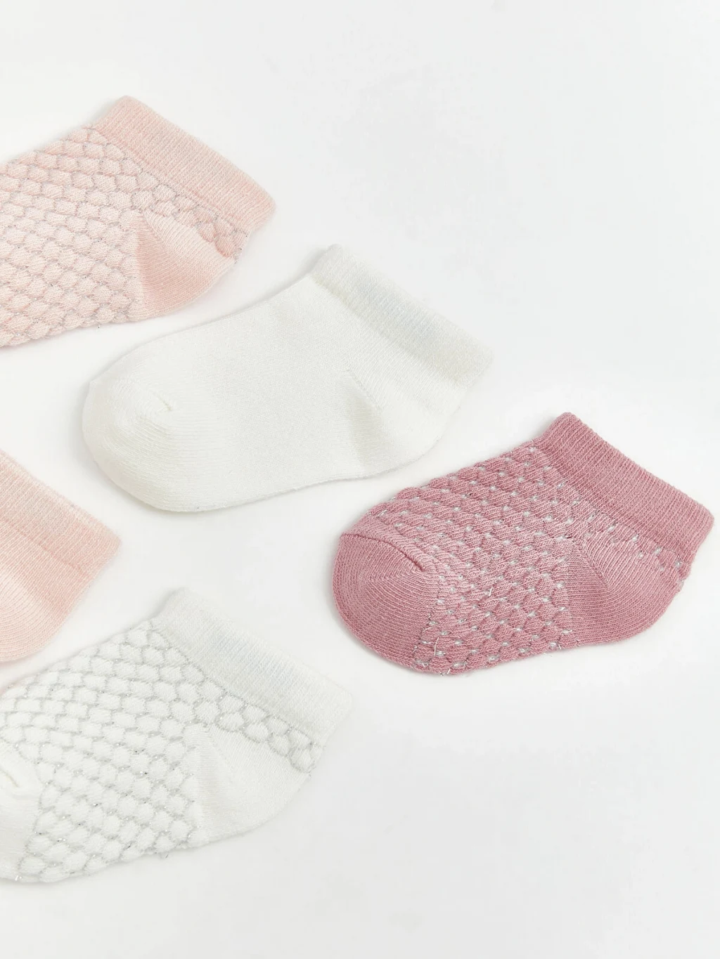 Kız bebek için tasarlanmış, bazıları desenli, bazıları desensiz olmak üzere beş çift patik çoraptan oluşur.