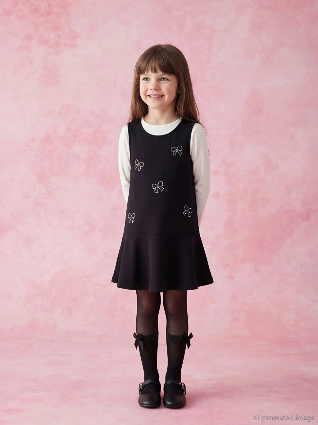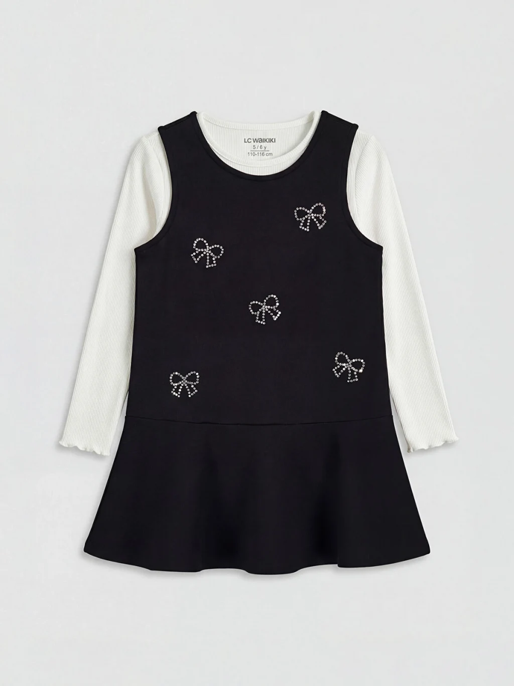 Kız çocuk elbise takımı, bisiklet yaka uzun kollu tişört ve üzerinde taş işlemeli fiyonk desenleri bulunan kolsuz elbiseden oluşur.