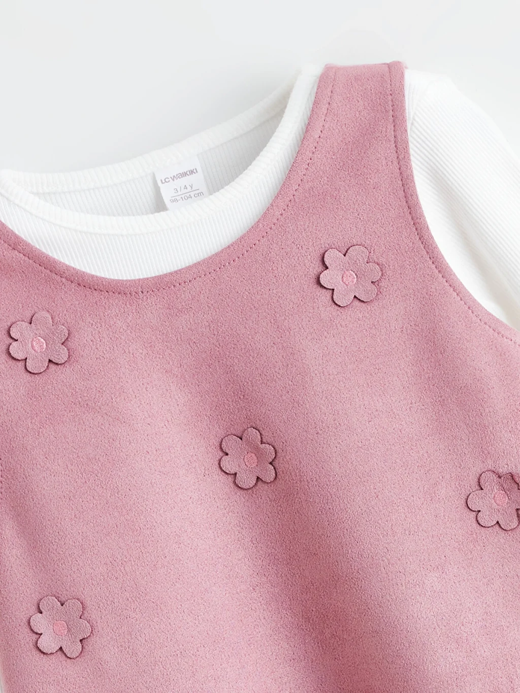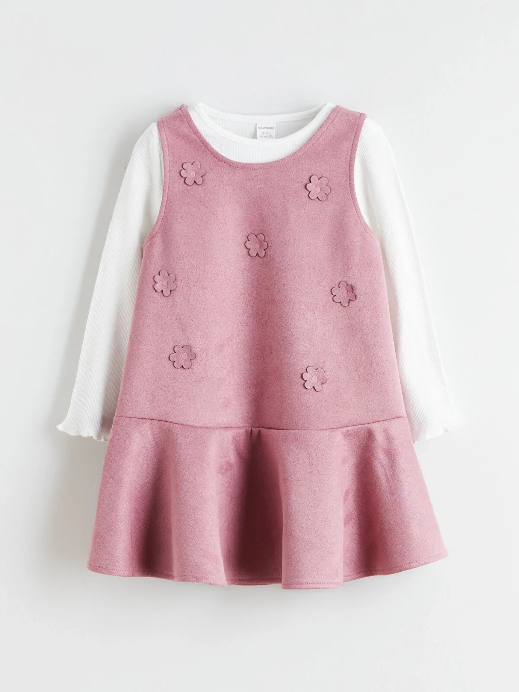 Yüksek pamuk içeren, uzun kollu, bisiklet yaka tişört ve süet kumaştan, çiçek aplikeli, etek ucu volanlı kız çocuk jile elbise takımı.