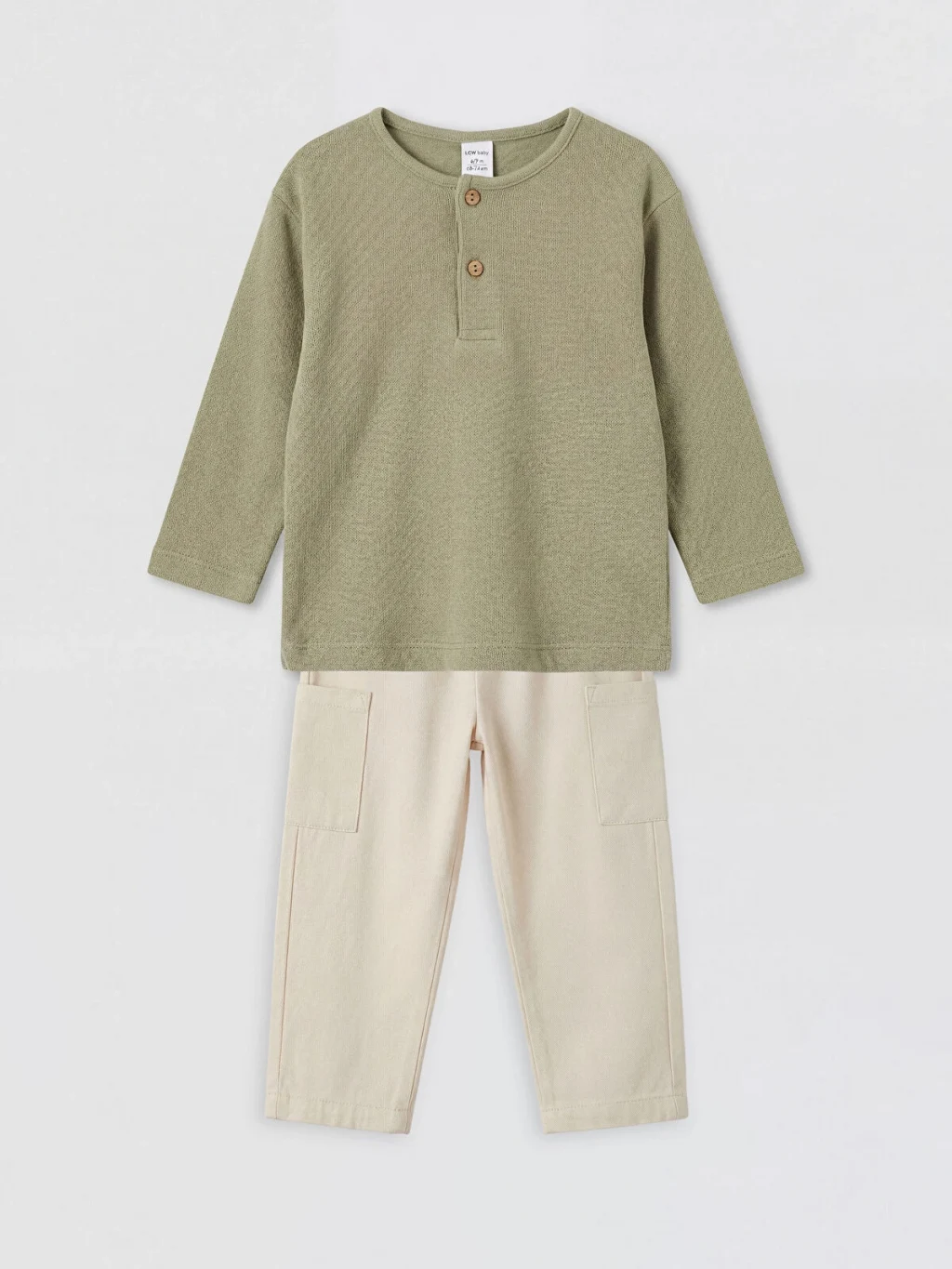 Erkek bebek takım, %100 pamuk strüktürlü kumaştan üretilmiştir. Bisiklet yaka, uzun kollu, düğme kapamalı üst ve cepli pantolondan oluşur.