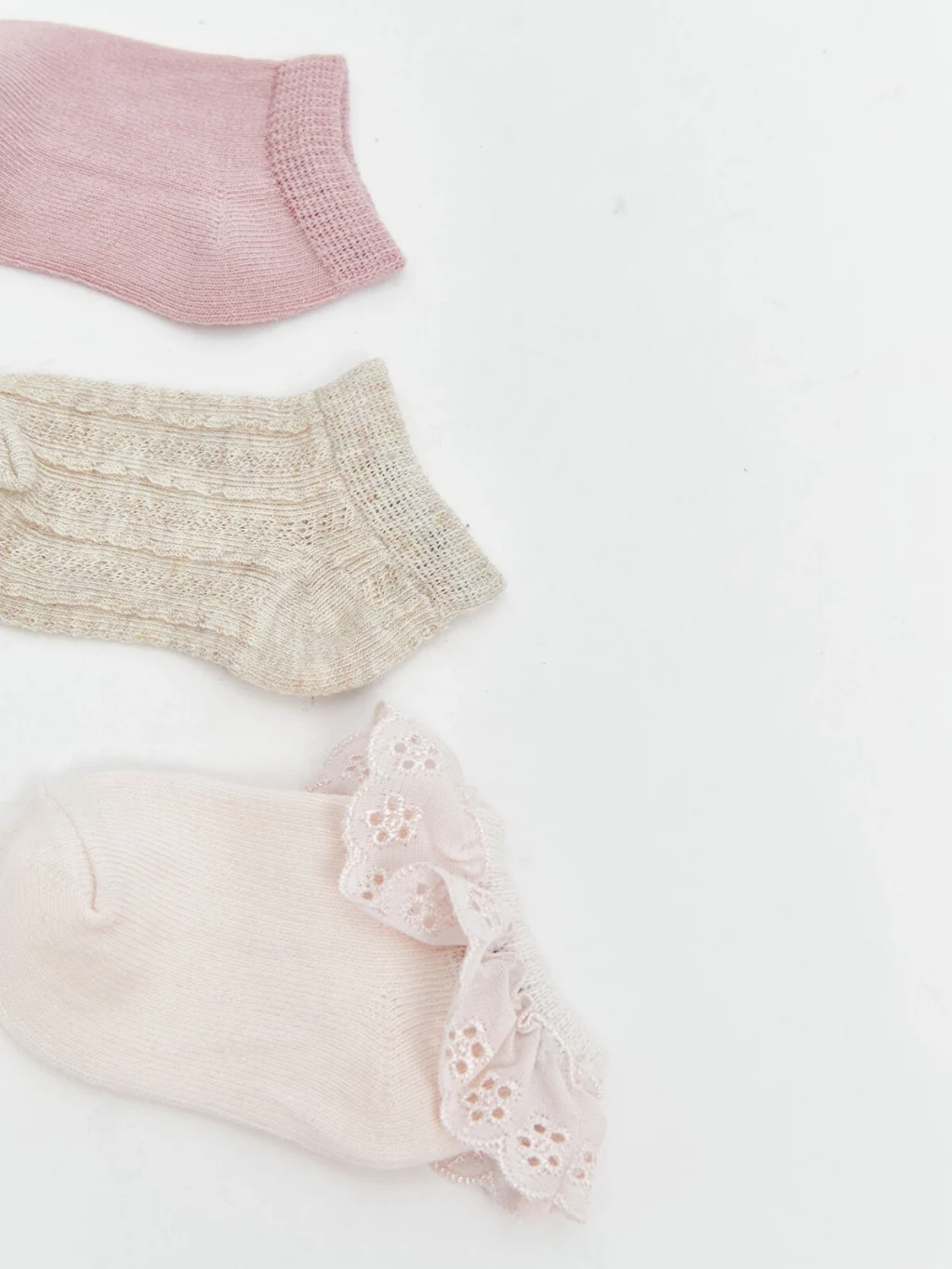 Farklı örgü desenlerine sahip kız bebek patik çorap seti, bir adedi bilek kısmı brode fırfırlı tasarıma sahiptir.