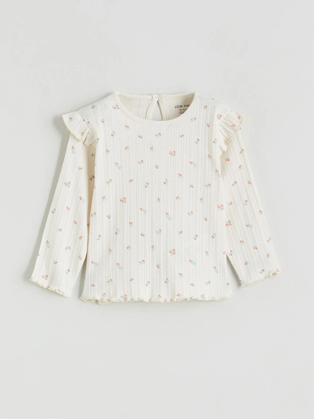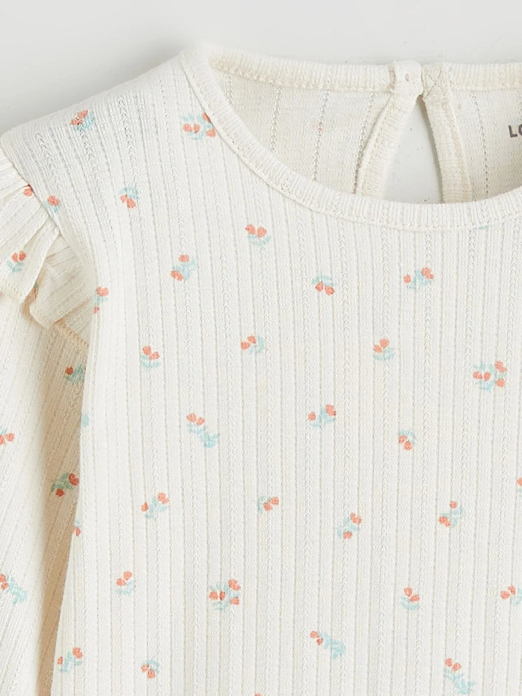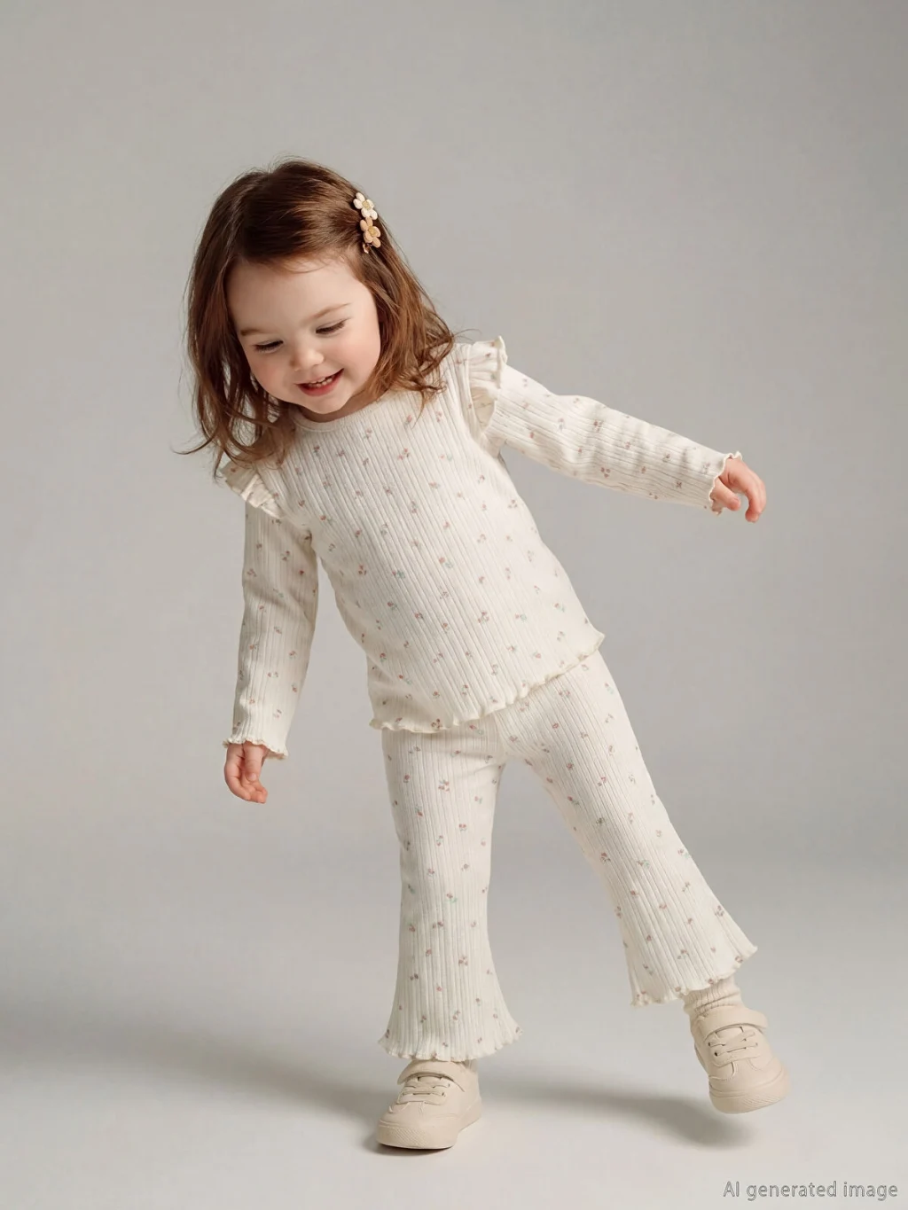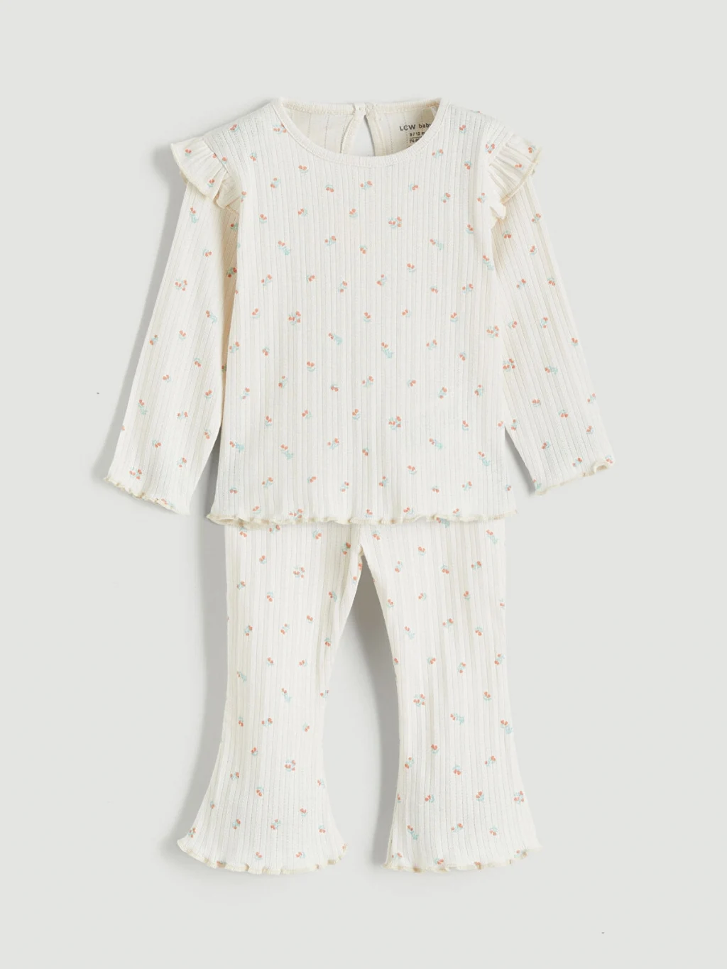Desenli kız bebek takım; bisiklet yaka, omuzları fırfırlı, uzun kollu üst ve İspanyol paça pantolondan oluşur. %100 pamuklu kaşkorse kumaştan üretilmiştir.