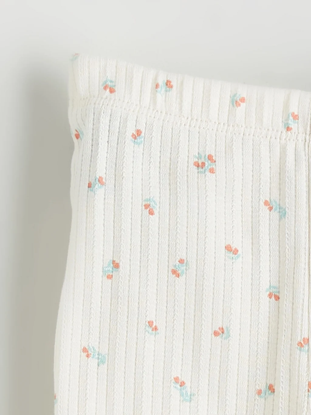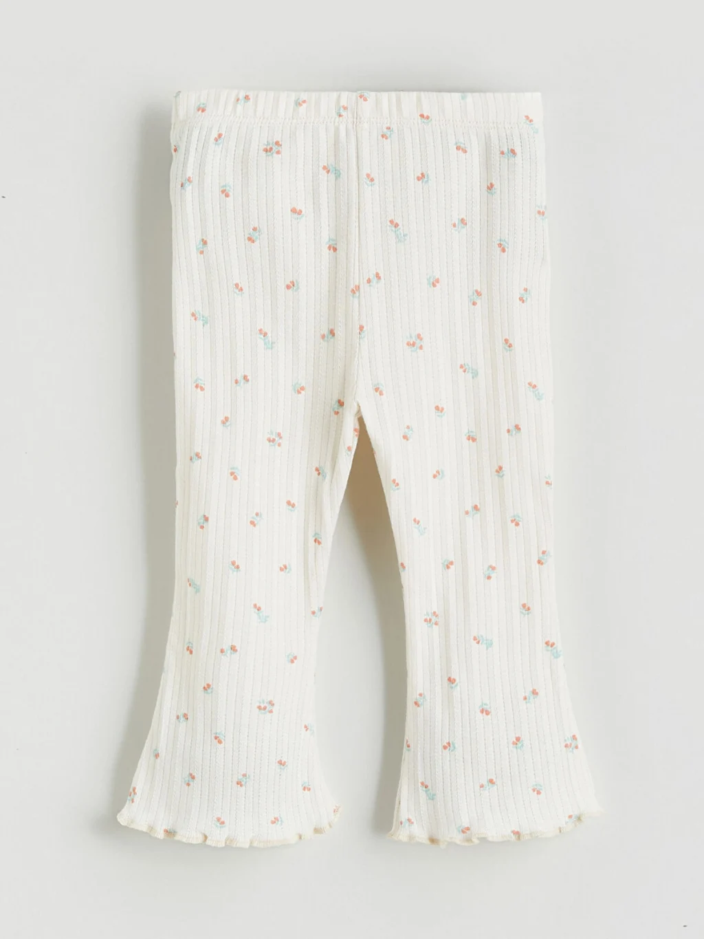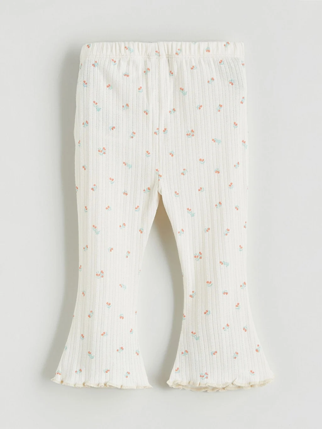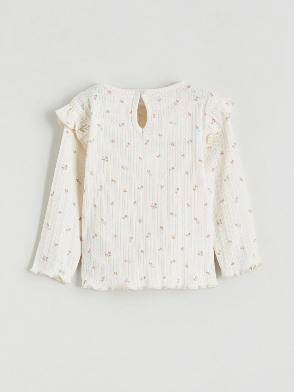 Desenli kız bebek takım; bisiklet yaka, omuzları fırfırlı, uzun kollu üst ve İspanyol paça pantolondan oluşur. %100 pamuklu kaşkorse kumaştan üretilmiştir.