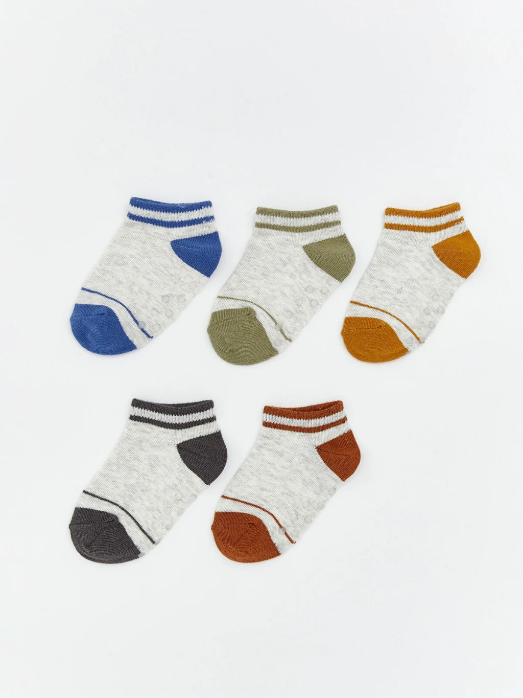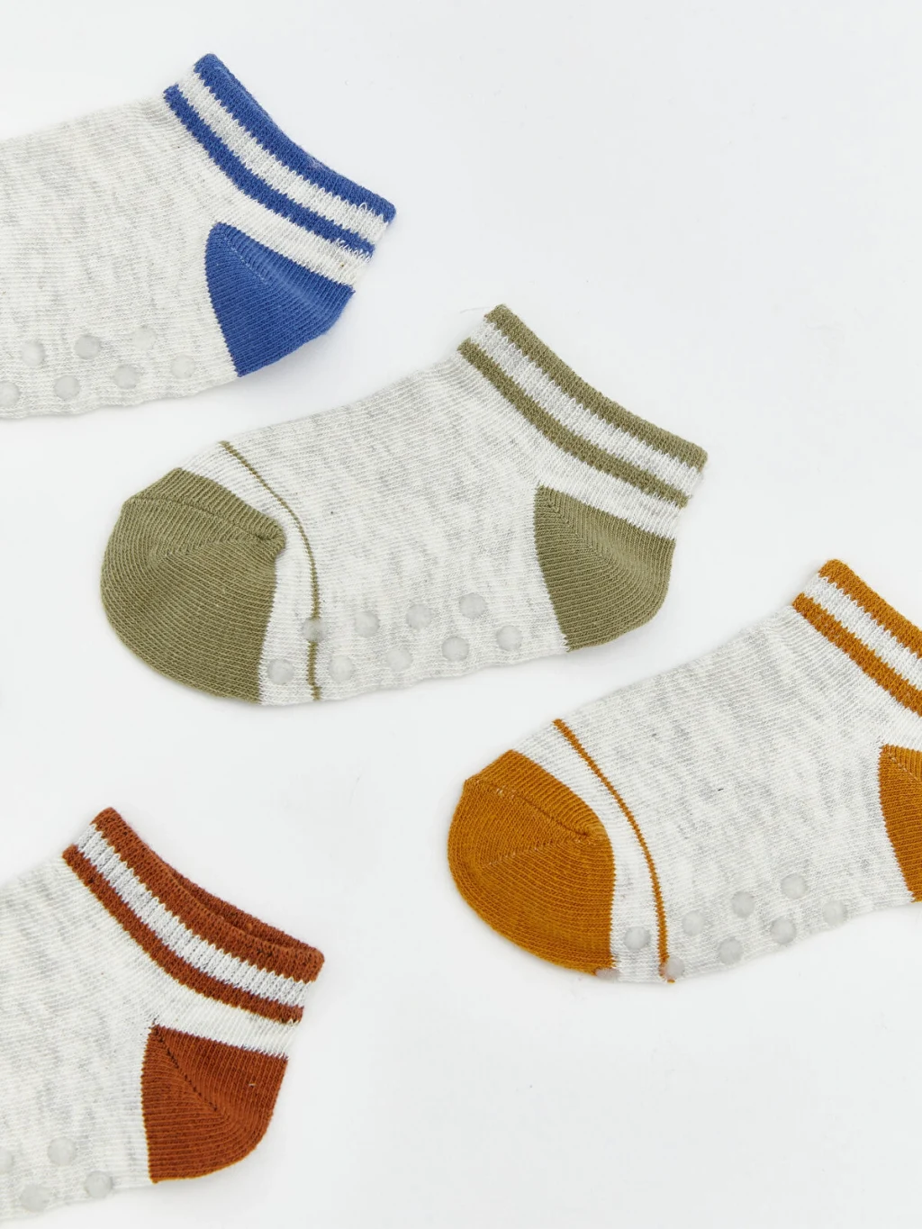 Erkek bebek patik çorap. Ribana bilek kısmı çizgili, burun ve topuk kısımları blok tasarımlıdır. Kaydırmaz tabanlı ve kendinden desenlidir.
