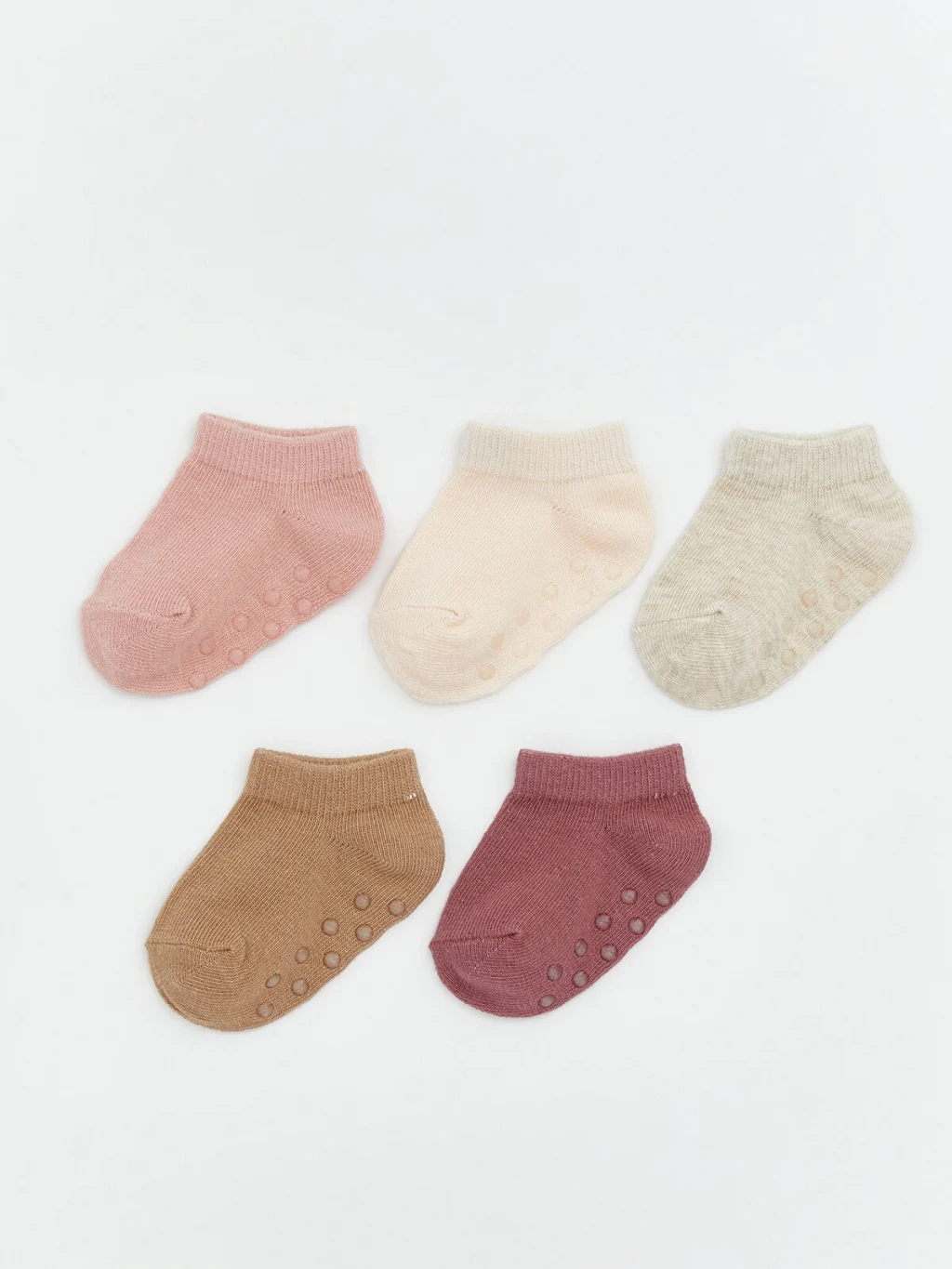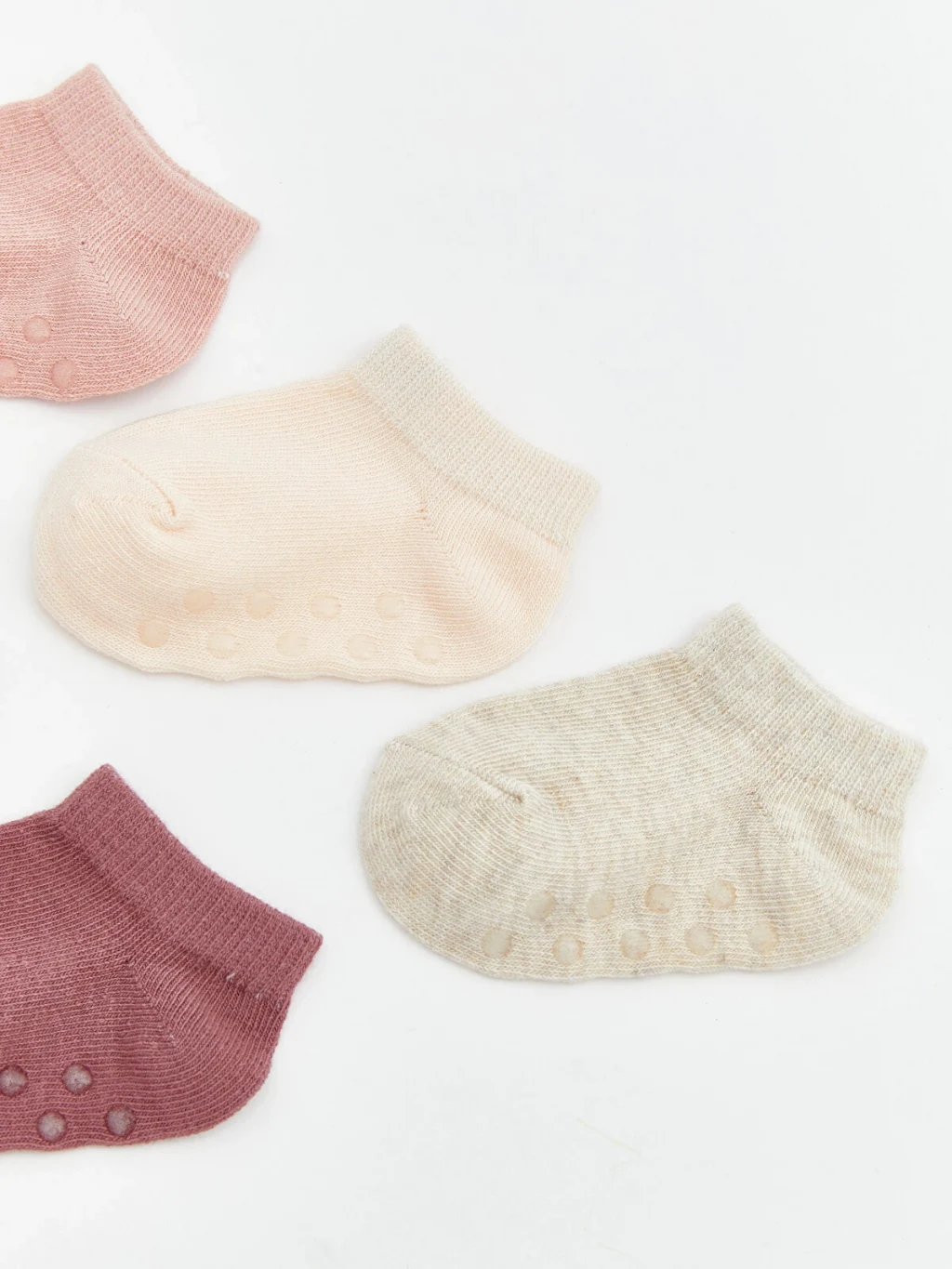 Düz ve desensiz kız bebek patik çorap, ribana bileklidir ve kaymayı önleyici noktalı tabana sahiptir.