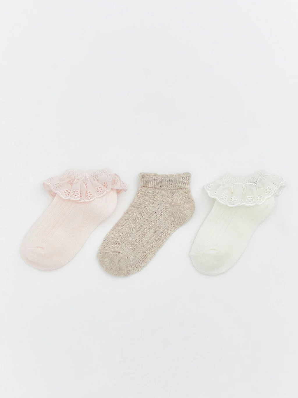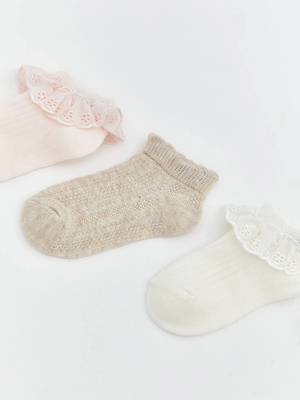 Bilek kısmı dantel fırfırlı ve ribana manşetli farklı tasarımlardan oluşan kız bebek patik çorap seti.