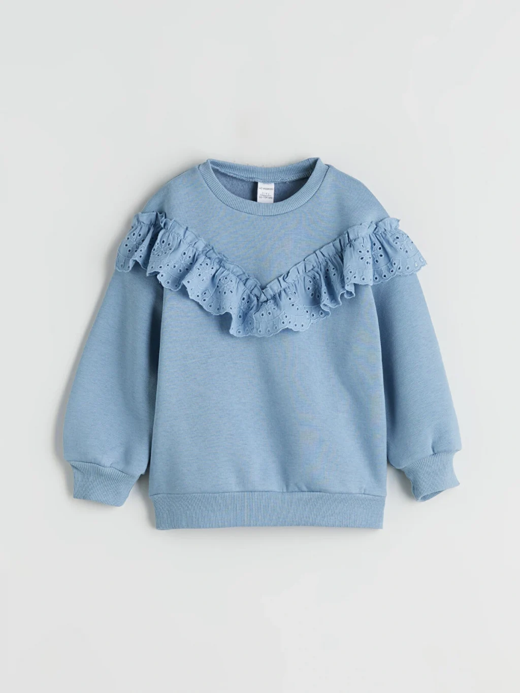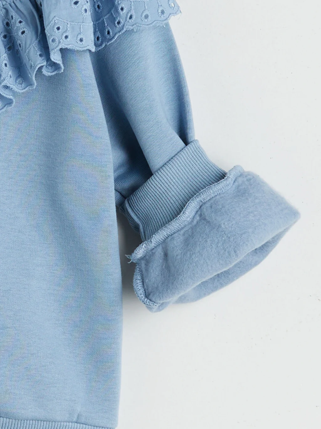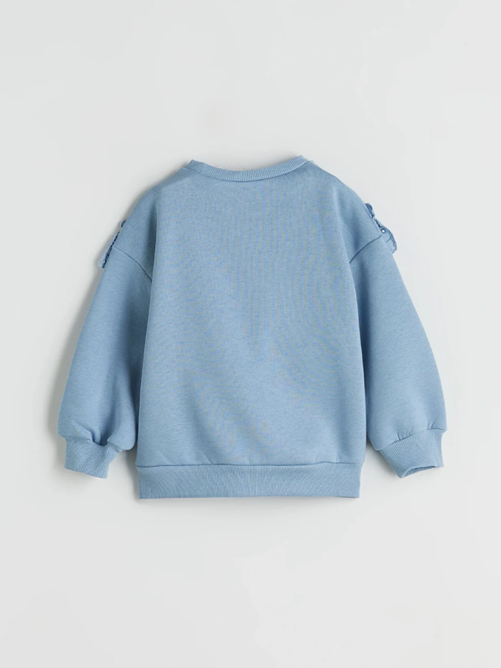 Bisiklet yaka ve uzun kollu kız çocuk sweatshirt. Göğüs kısmında V şeklinde fisto kumaştan fırfır detayı bulunur. Kol manşetleri ve etek ucu ribanalıdır.